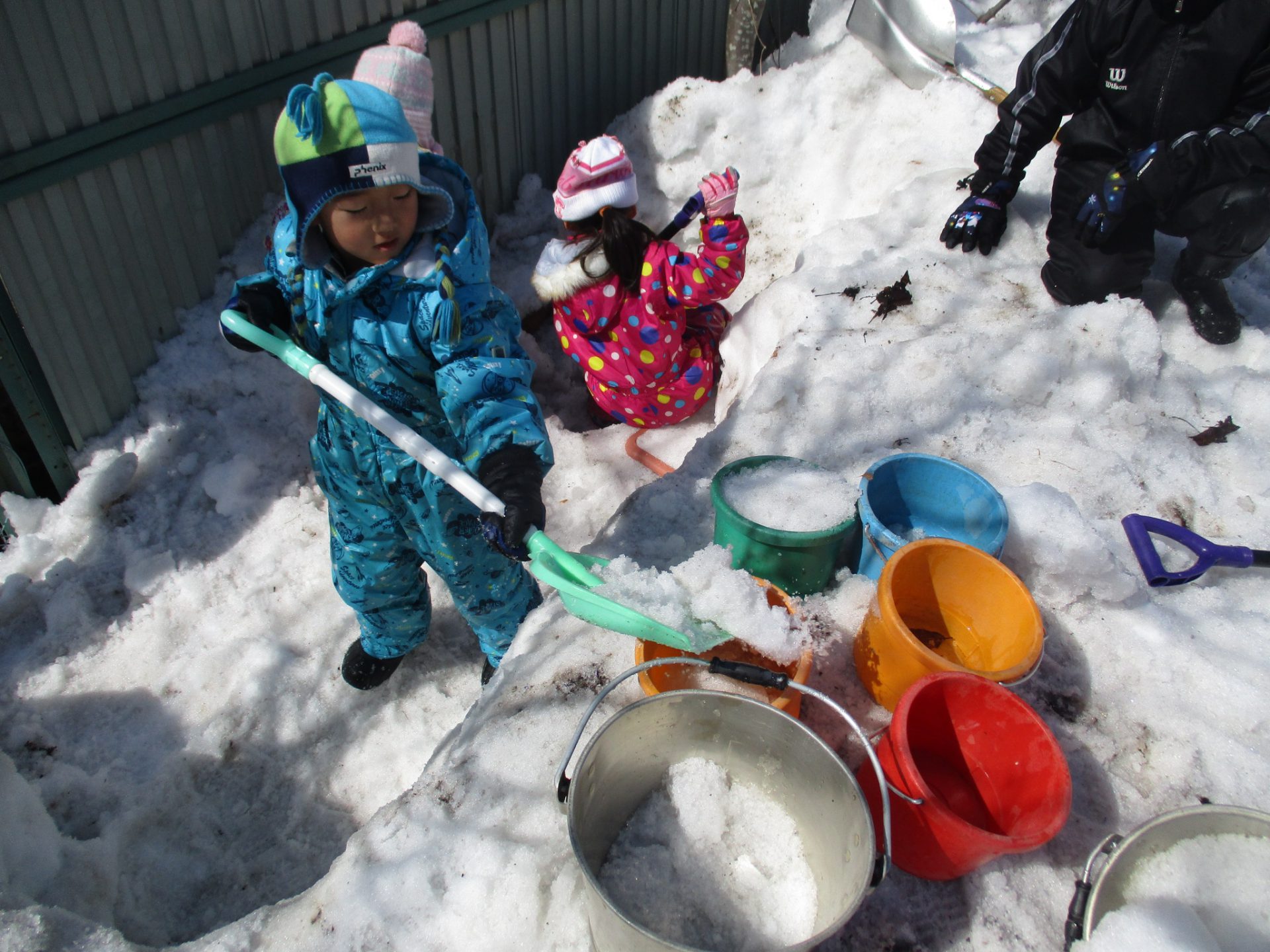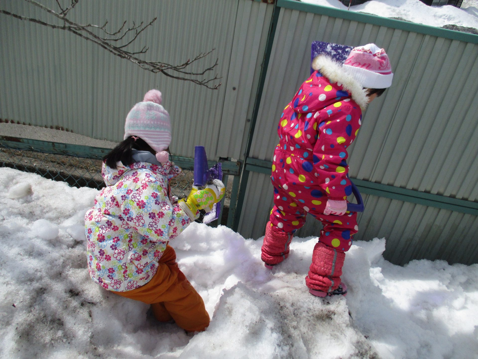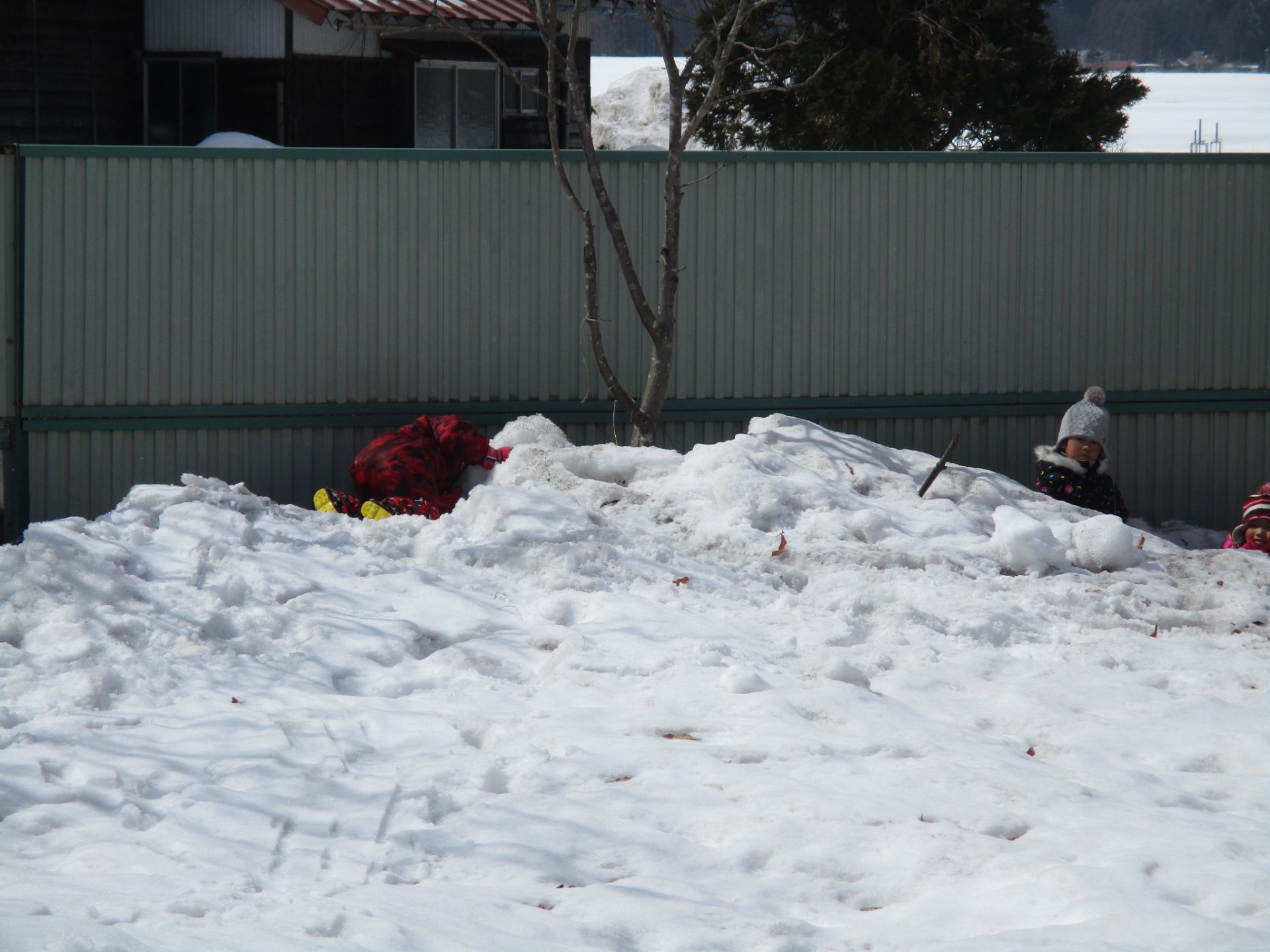 春が近づき、園庭の雪も日に日に沈んでいます。そんな中、最後の雪遊びを楽しむ子どもたちです。