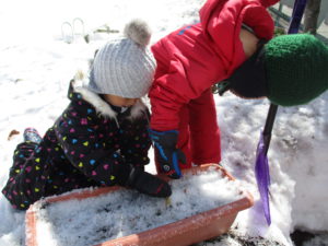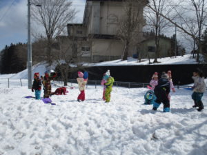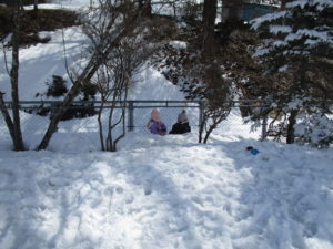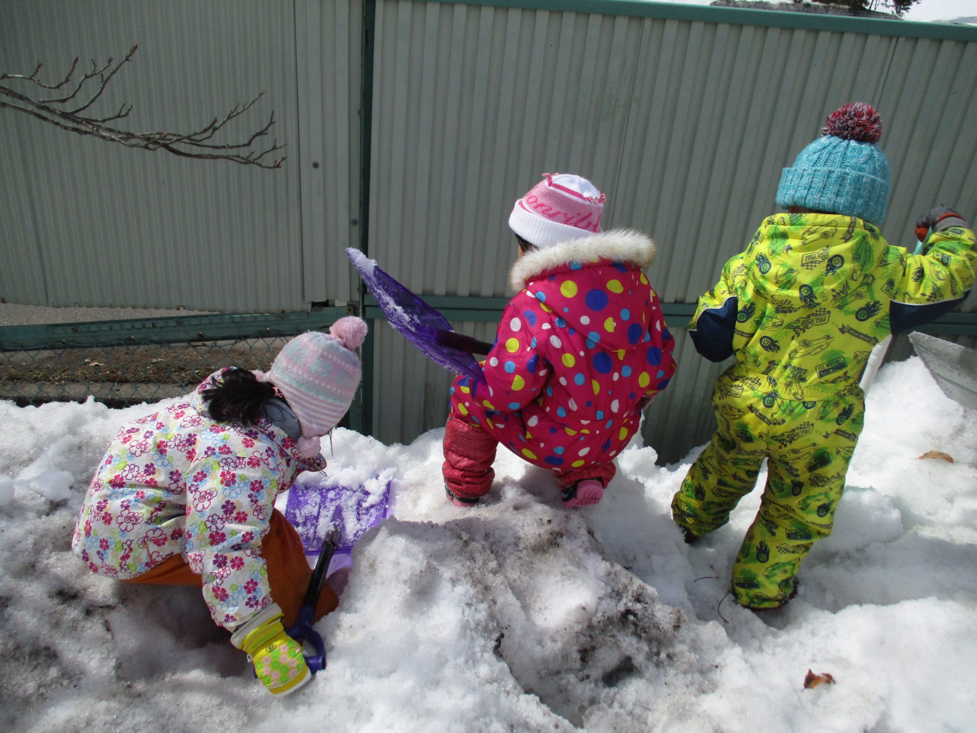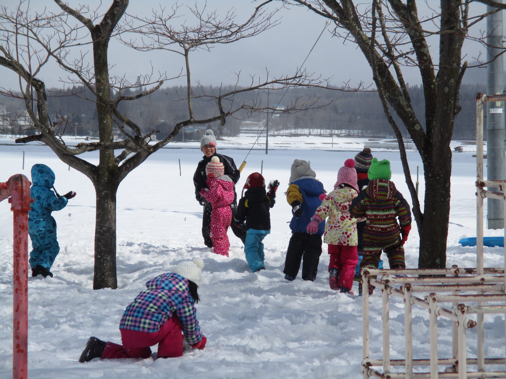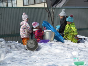 春が近づき、園庭の雪も日に日に沈んでいます。そんな中、最後の雪遊びを楽しむ子どもたちです。