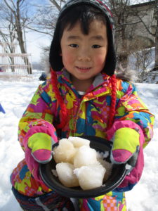 色水につけた雪玉でたこ焼き作り。「ほら!たこ焼きの色してるでしょ?」