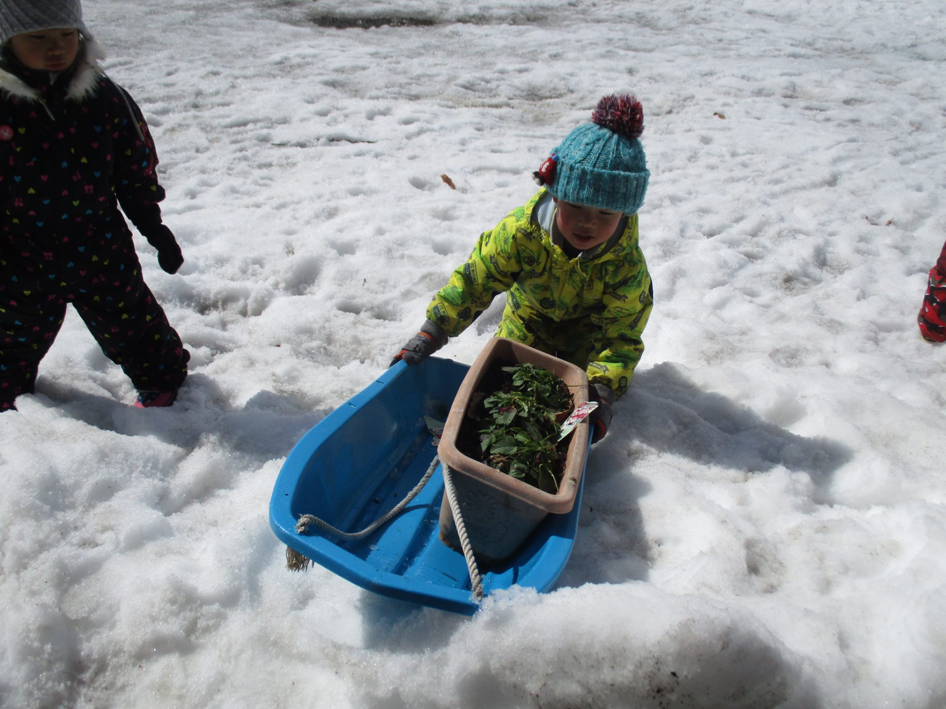 「僕が運びまーす。」テラスまでそりを使って運んでいます。運ぶ係を買って出てくれ、ほぼ全部運んでくれました。斜めにすると土も苗もこぼれてしまいます。雪のコース選びも慎重にしていました。