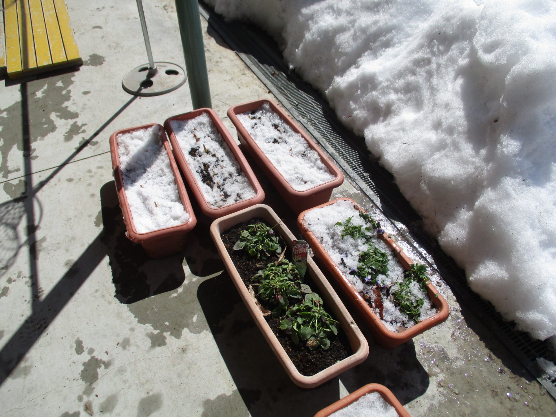 春になったらきれいに咲くようにと雪の下に置いておいたプランターのパンジーやチューリップのことを思いだした年長さん。「私たちが卒園したら見られないね…。」「じゃあ少し掘ってみる?」保育士の言葉に目がキラリ!「よし!掘ろう!」と掘りだしました。でも…