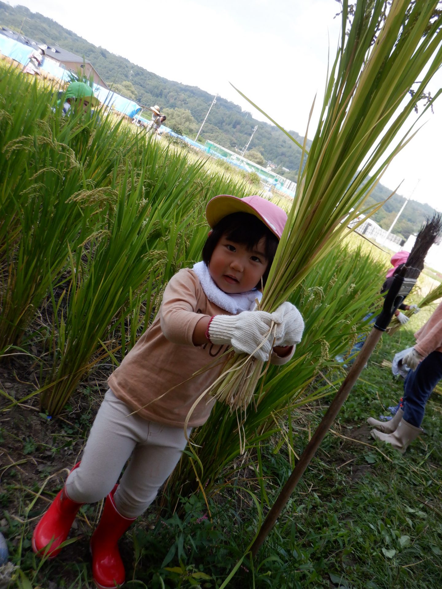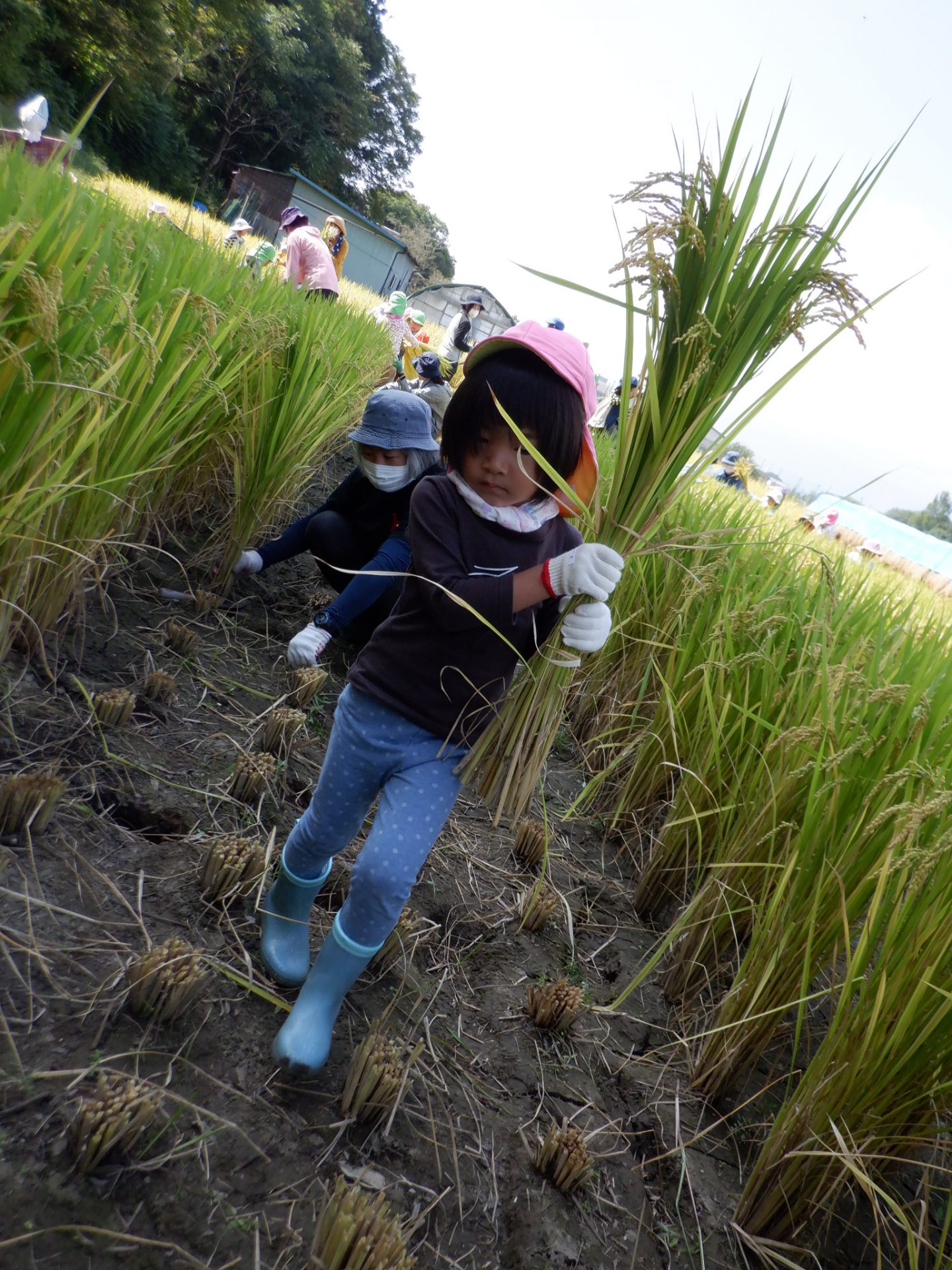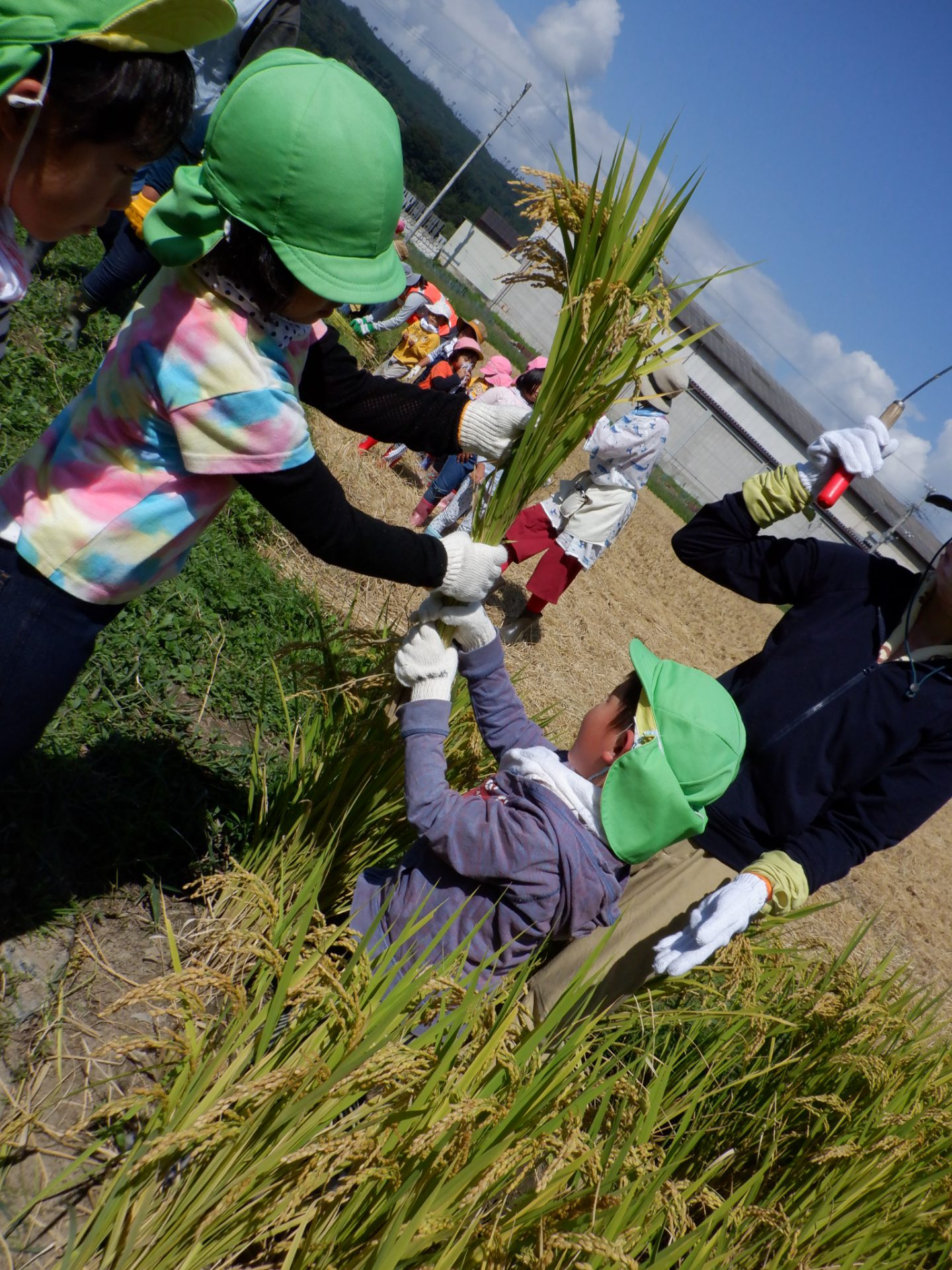 そら組・にじ組・保護者のみなさんで、一緒に稲刈りができたことで、より達成感が持てた活動になりました。