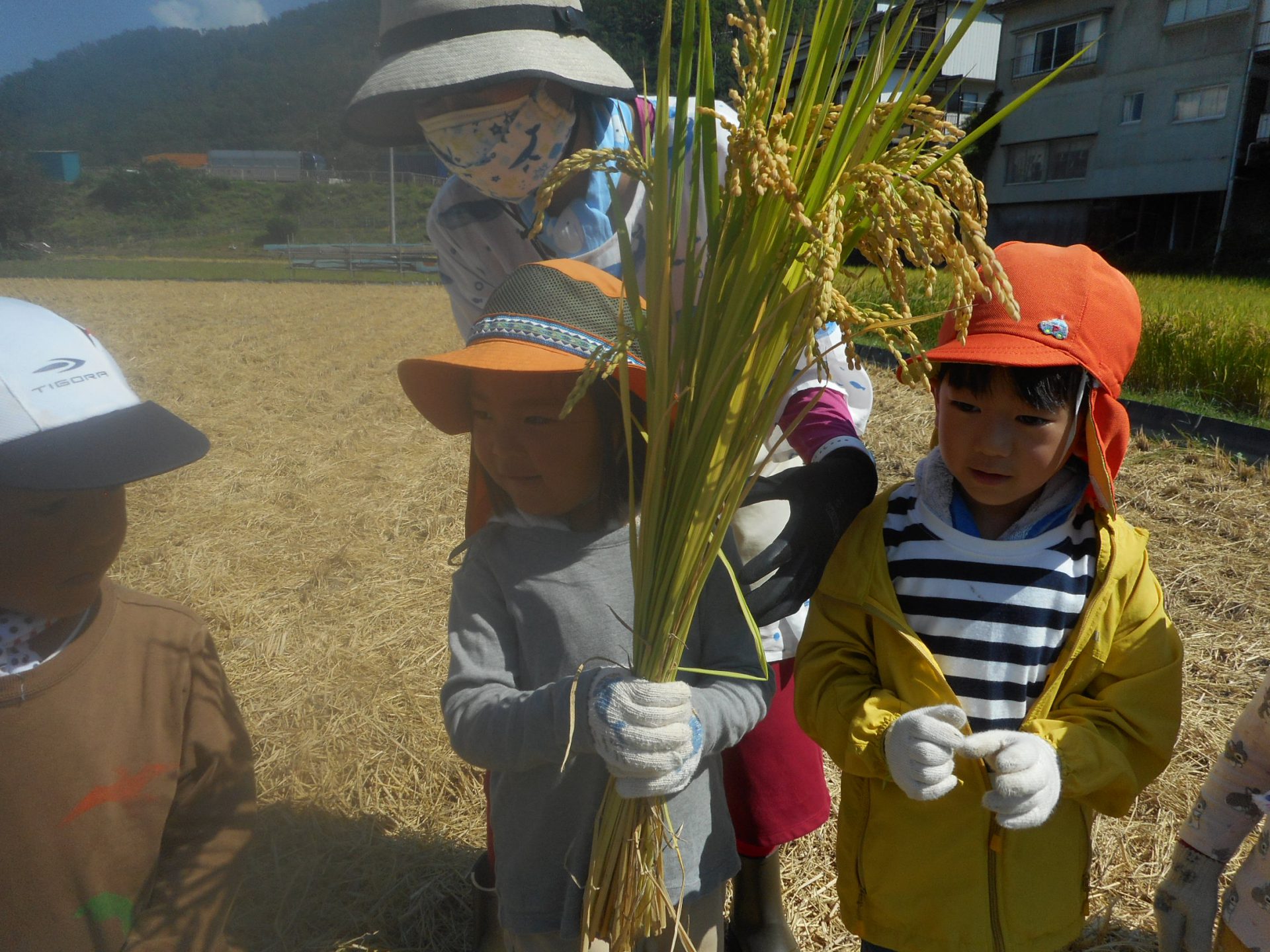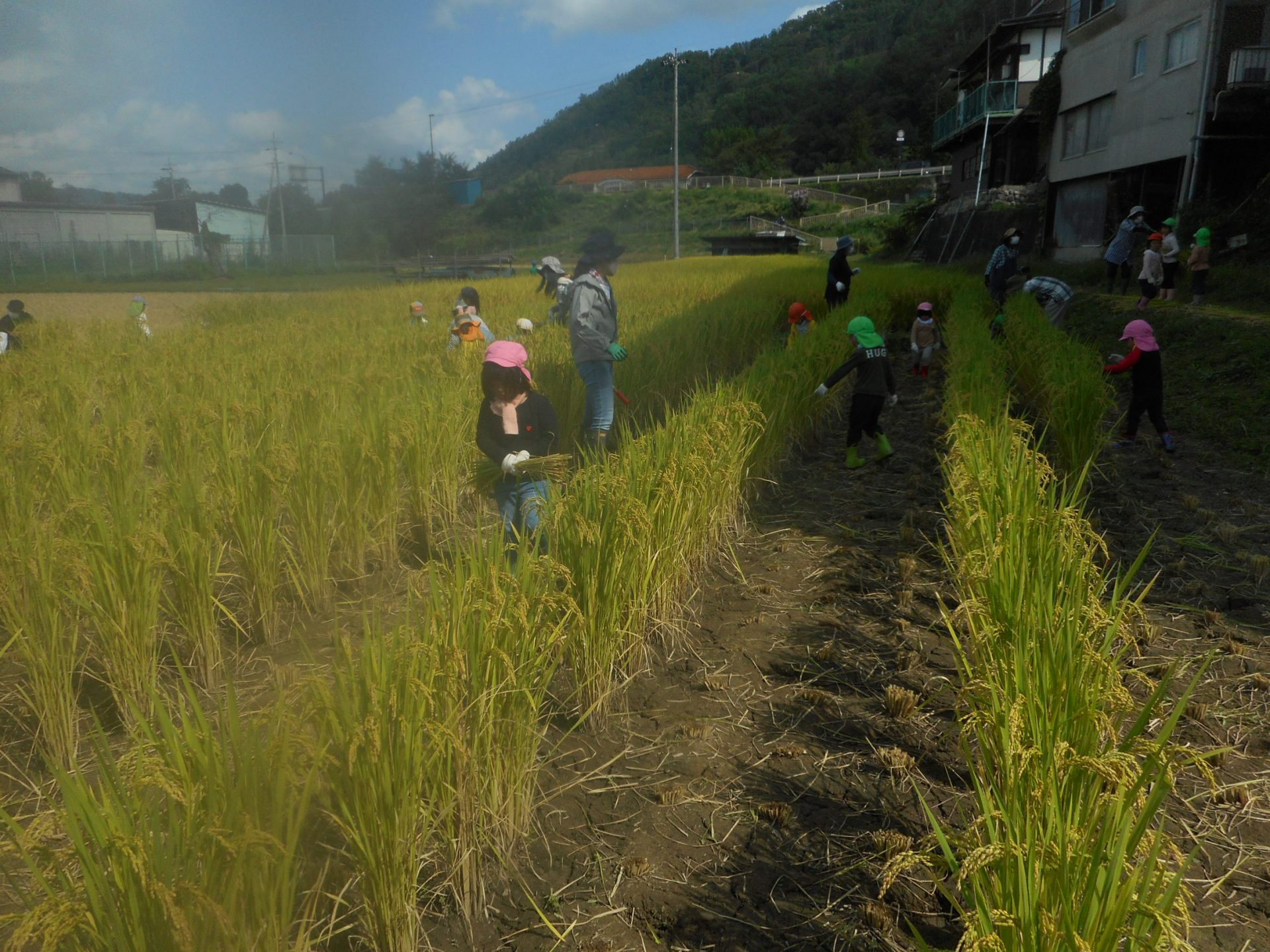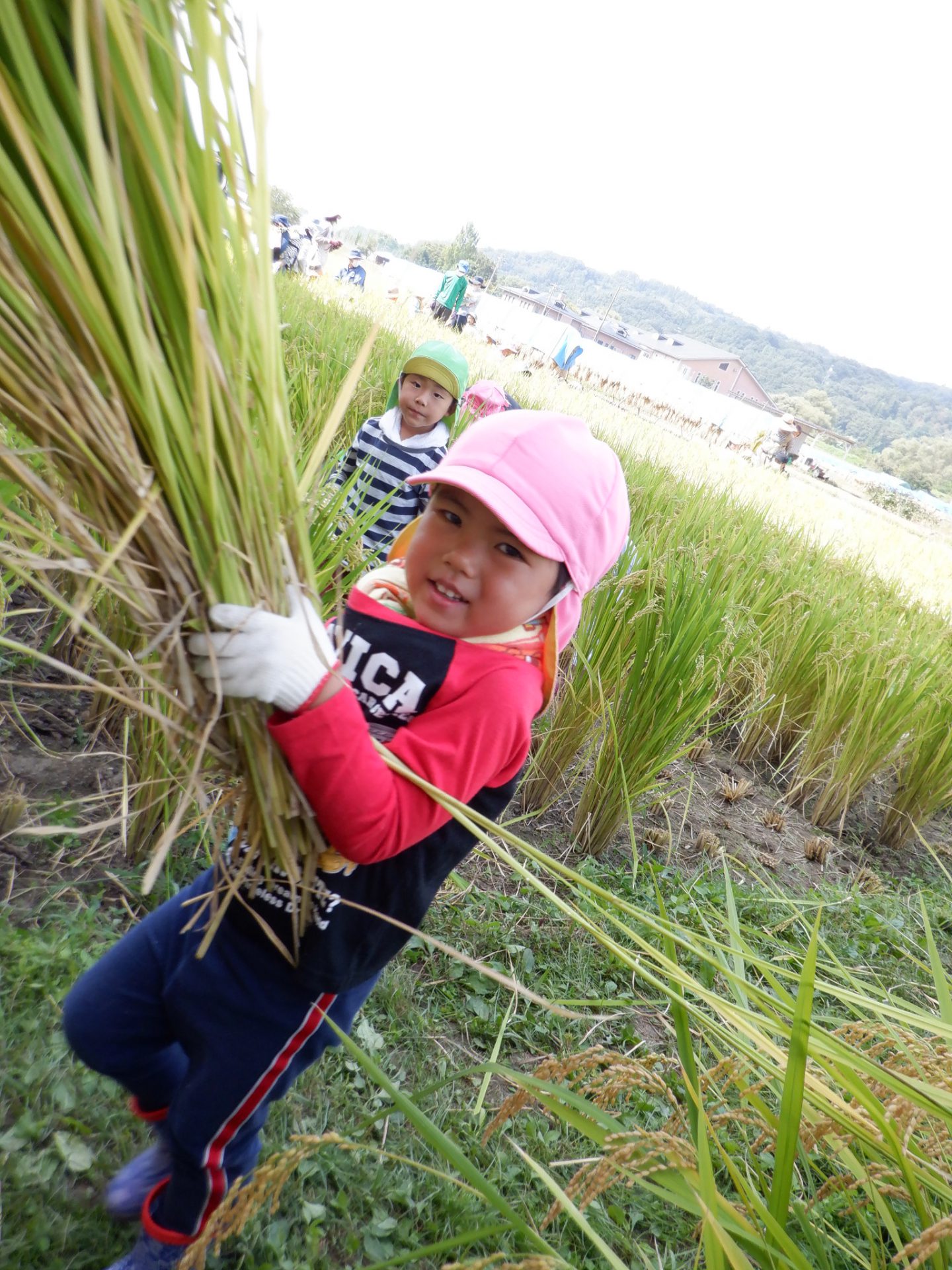 そら組・にじ組・保護者のみなさんで、一緒に稲刈りができたことで、より達成感が持てた活動になりました。