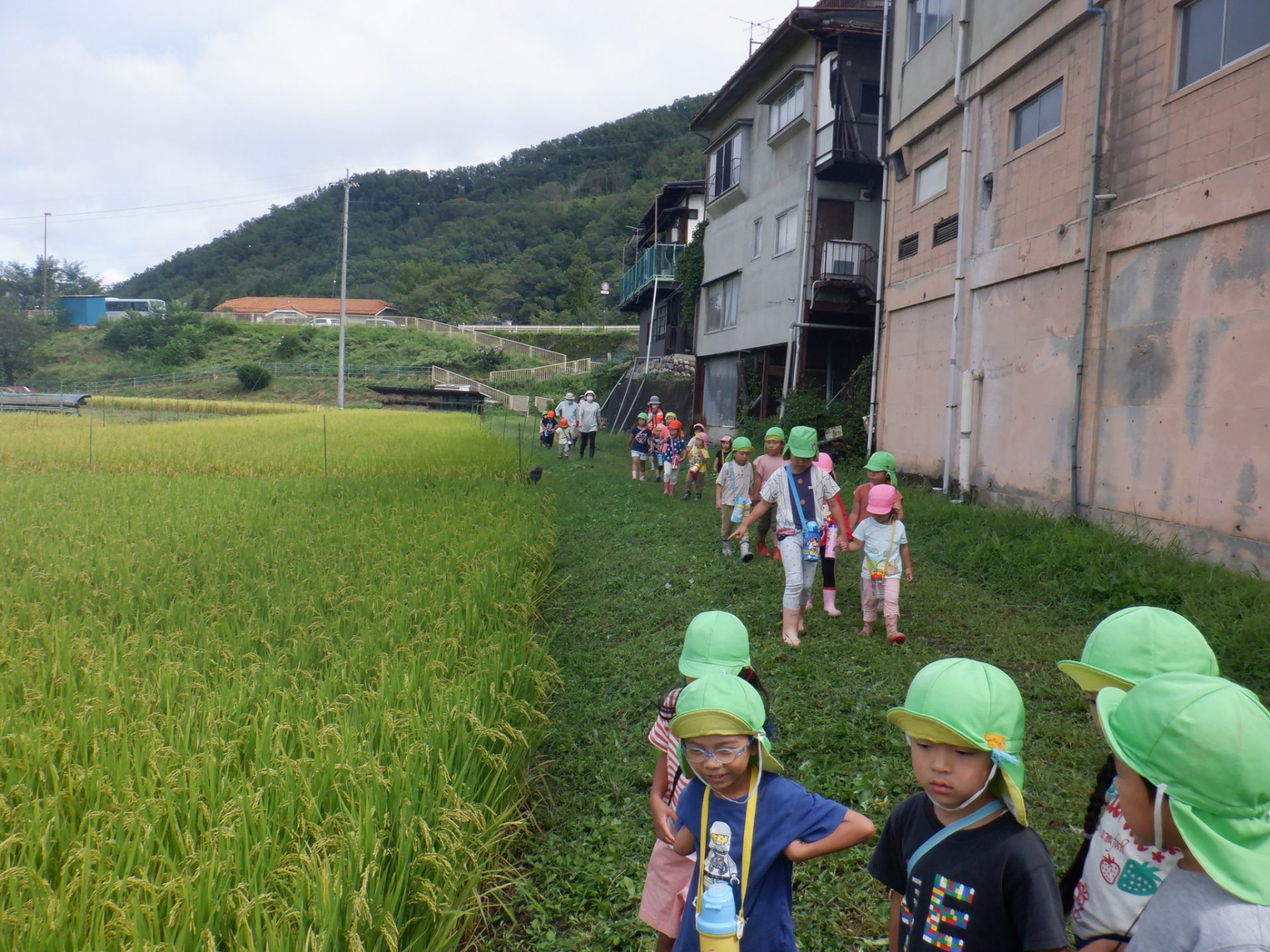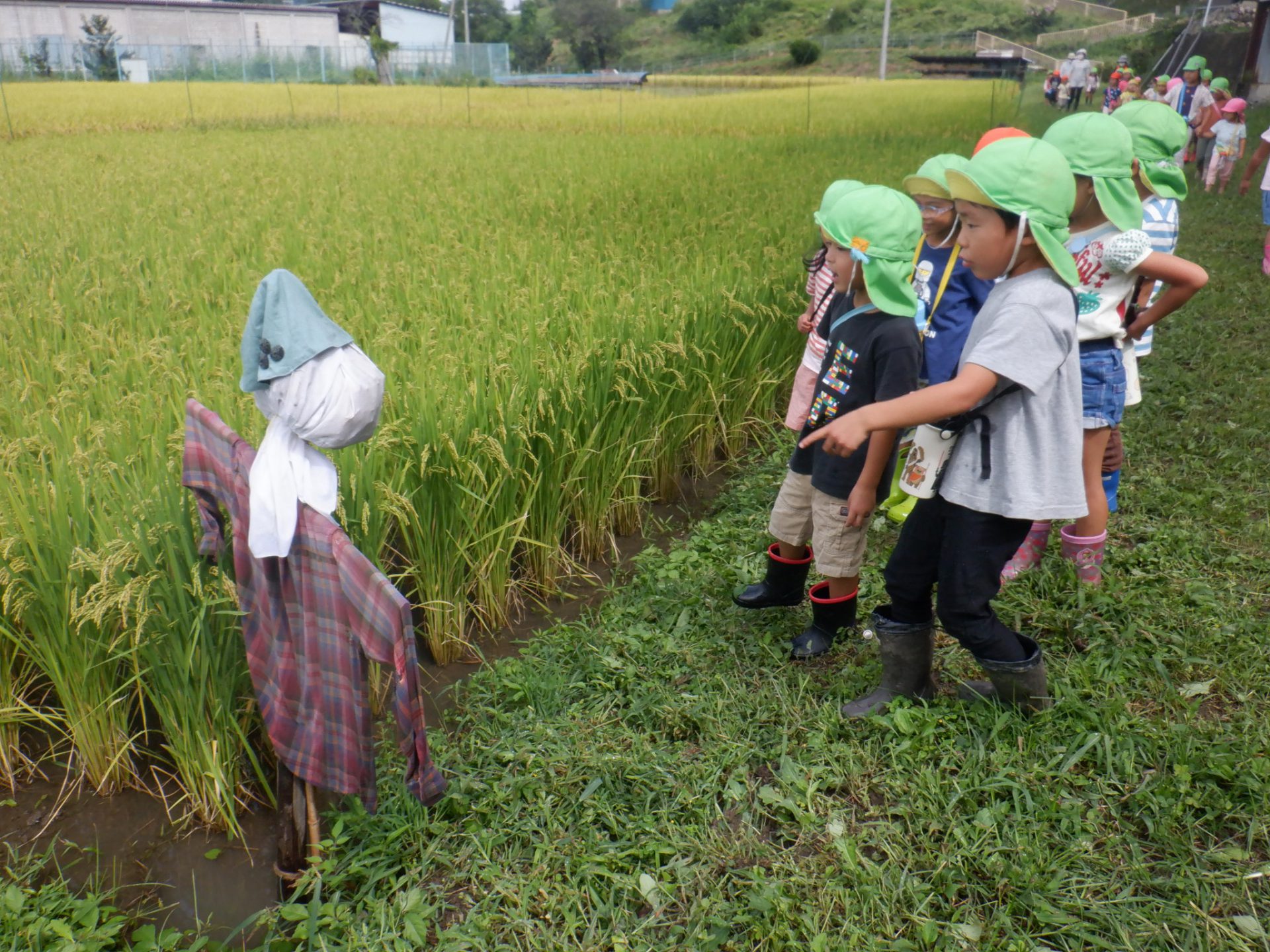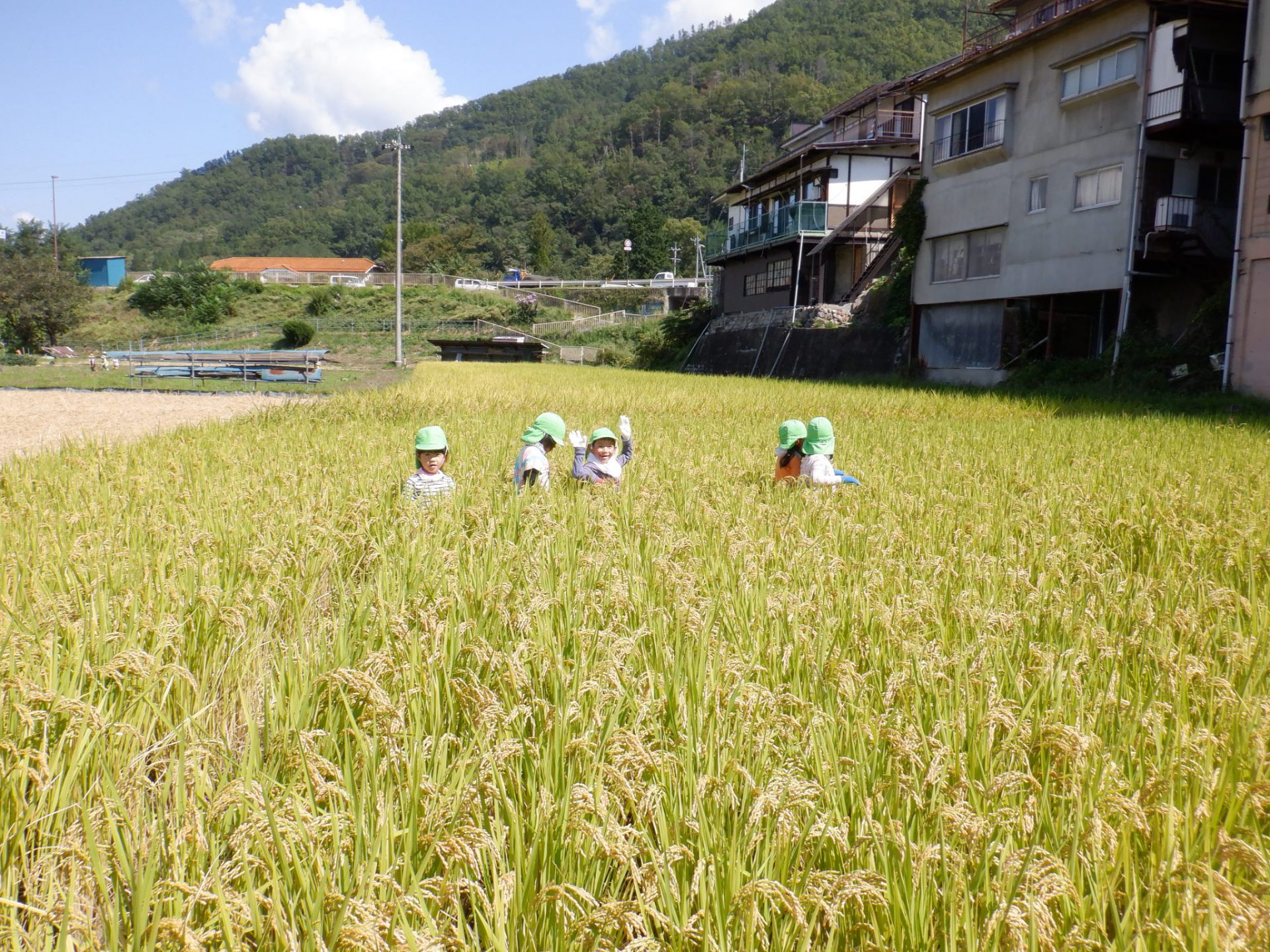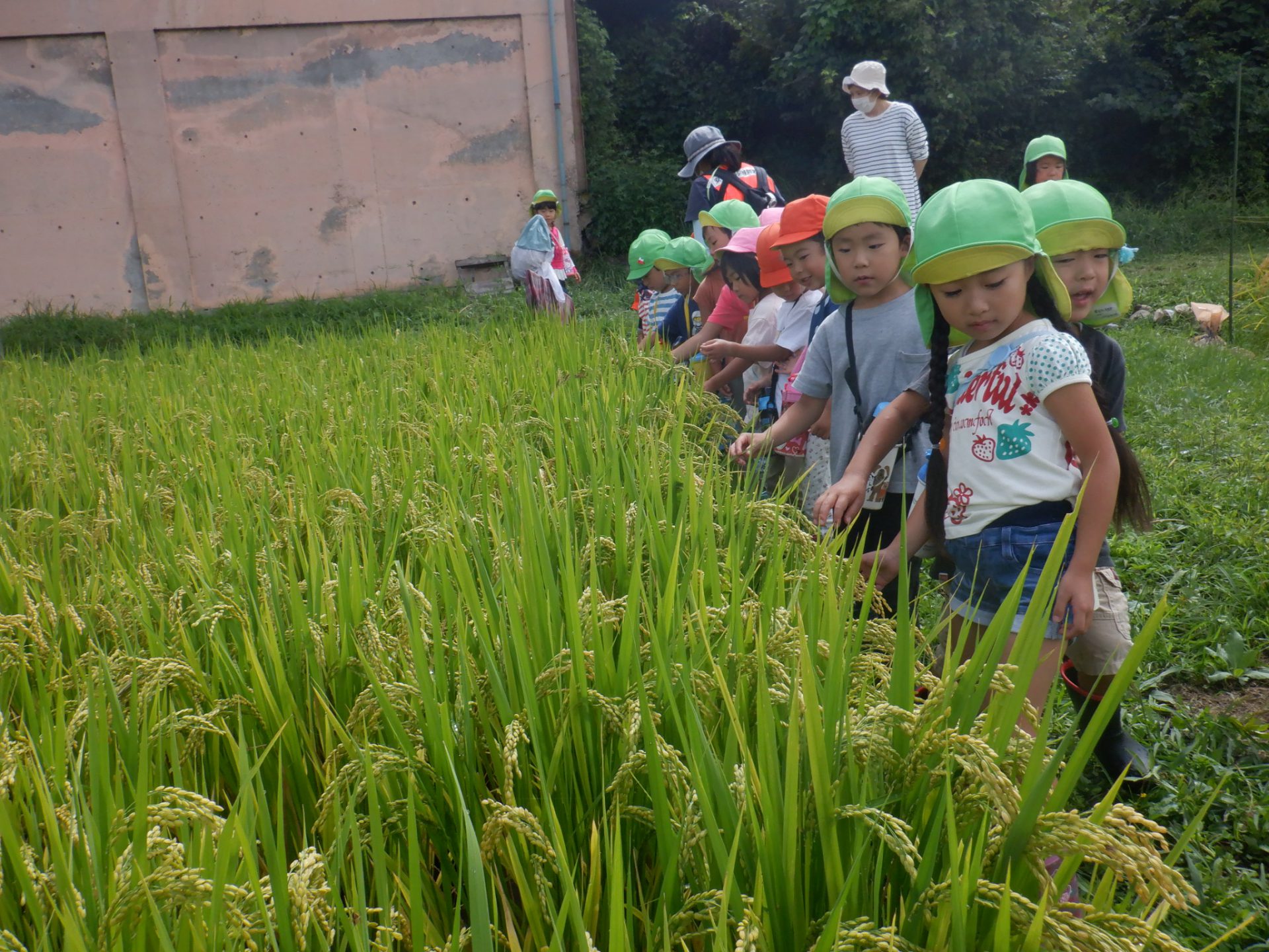 5月に田植えをした田んぼ。そら組とにじ組の子どもたち、保護者の方にも協力していただきながら田の草取りや、草取りや、水の管理、案山子作り、はぜ木運びなど、秋の収穫に向けて田んぼ活動に取り組んできました。