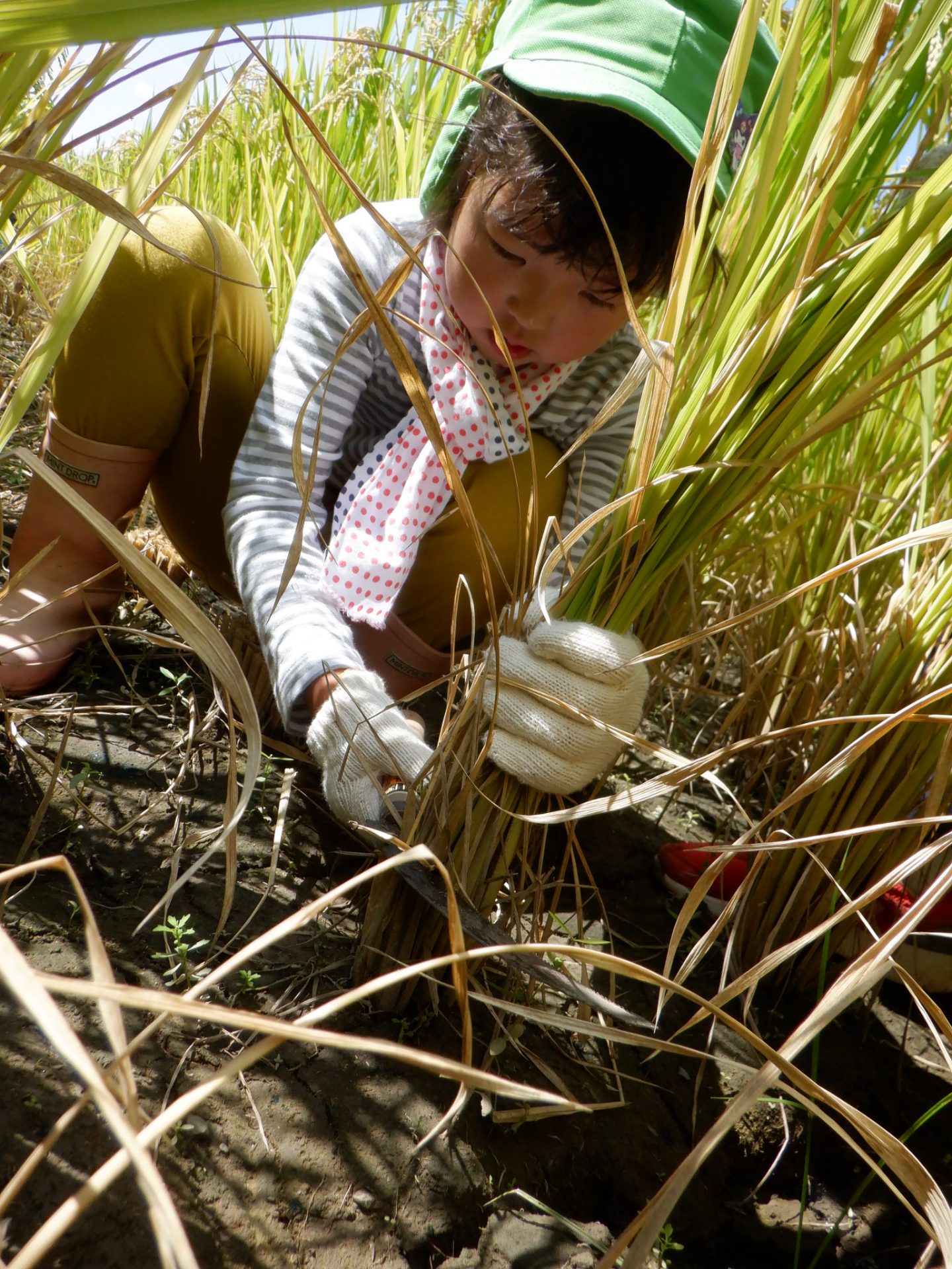 真剣な顔で、稲も鎌もぎゅっとにぎる手に力が入ります。
