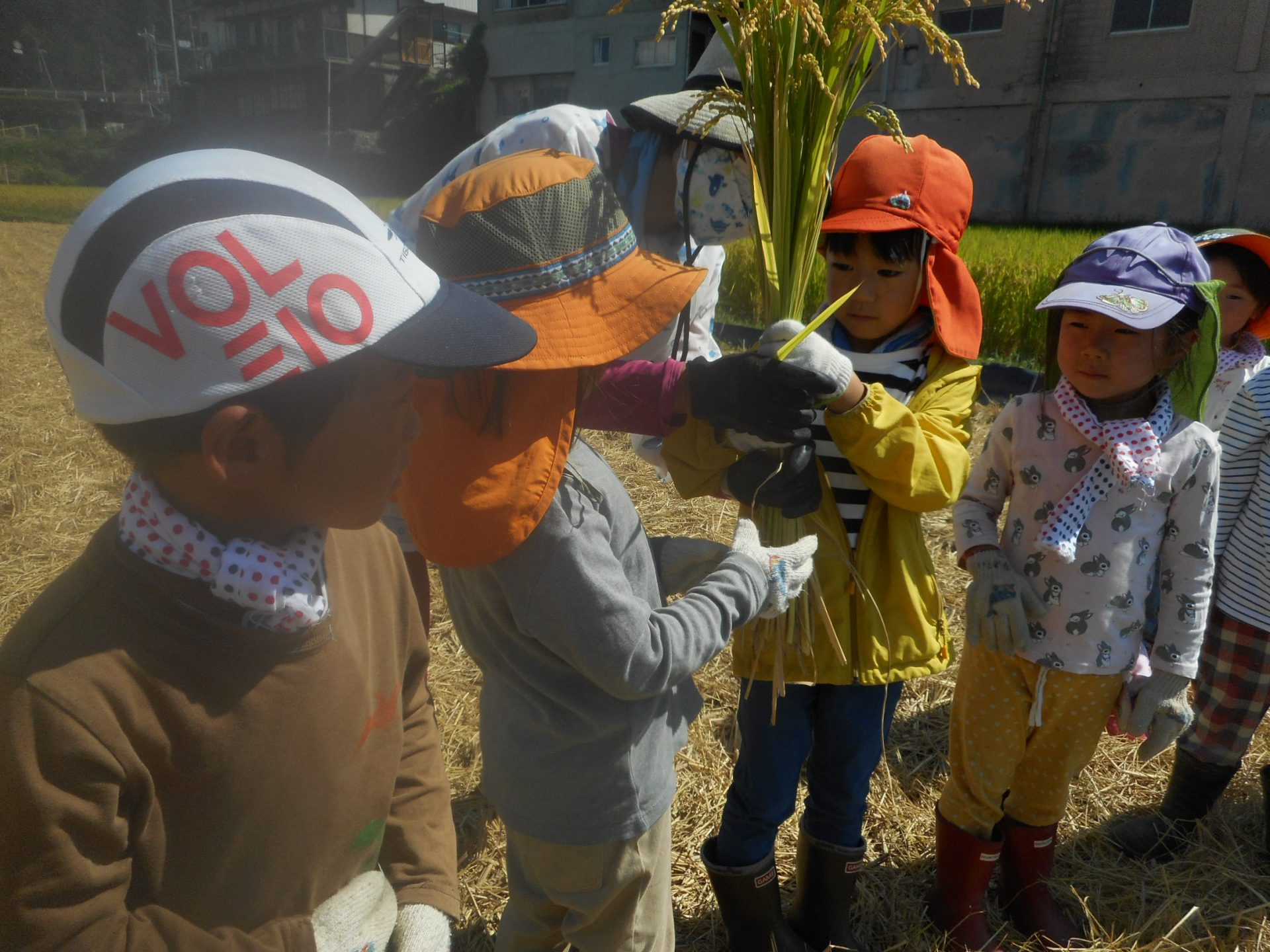 みんくくじら、ざとうくじらのみんなは、収穫した大事な稲の持ち方を確認しました。
