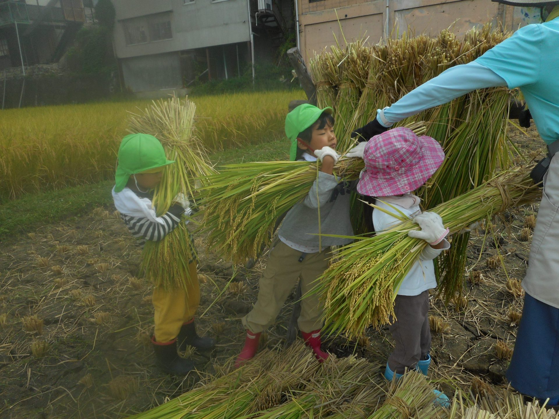 年長さんが刈った稲をあぜまで運ぶのは年少・年中のみんくくじら、ざとうくじらの子どもたち。