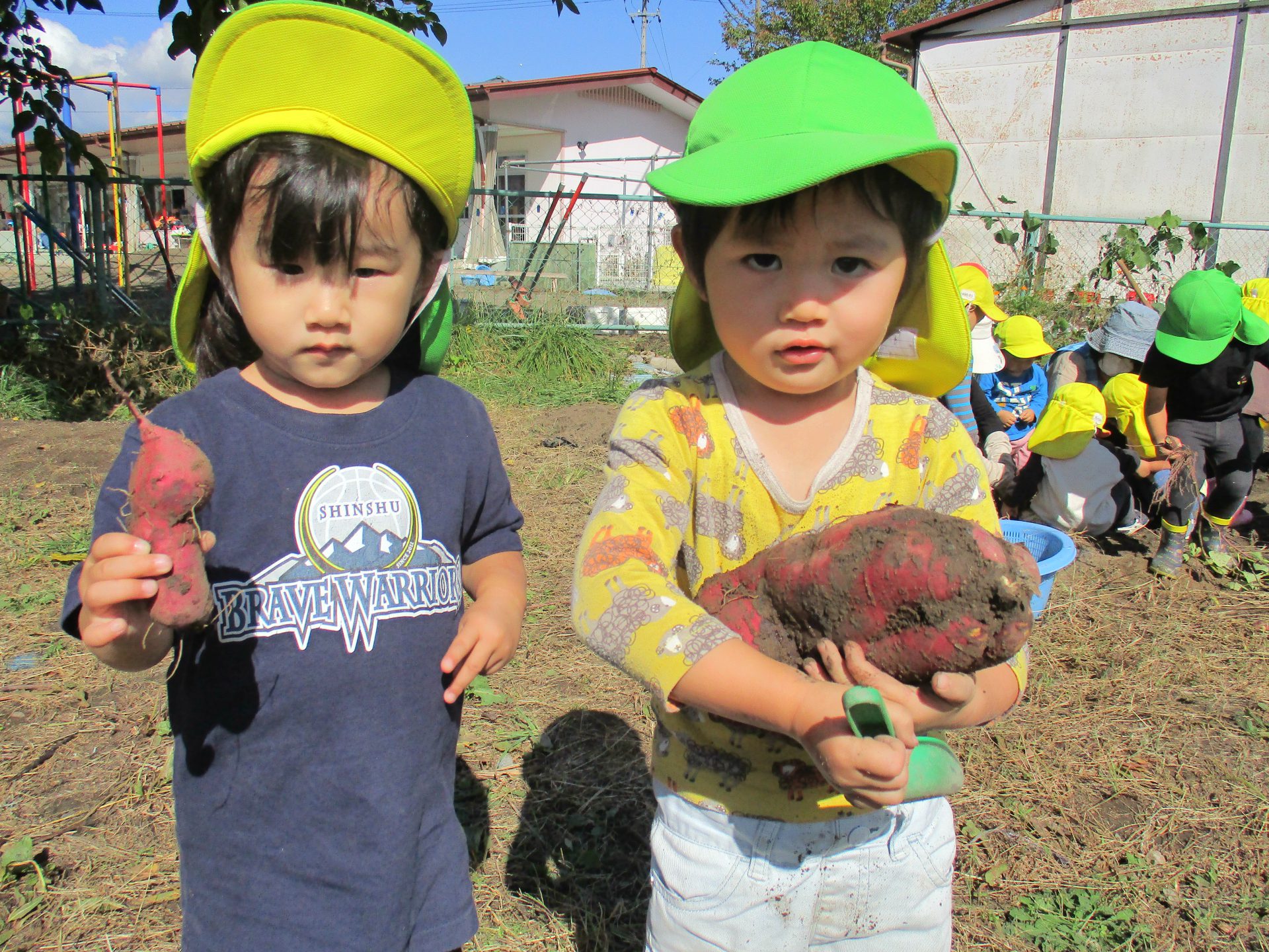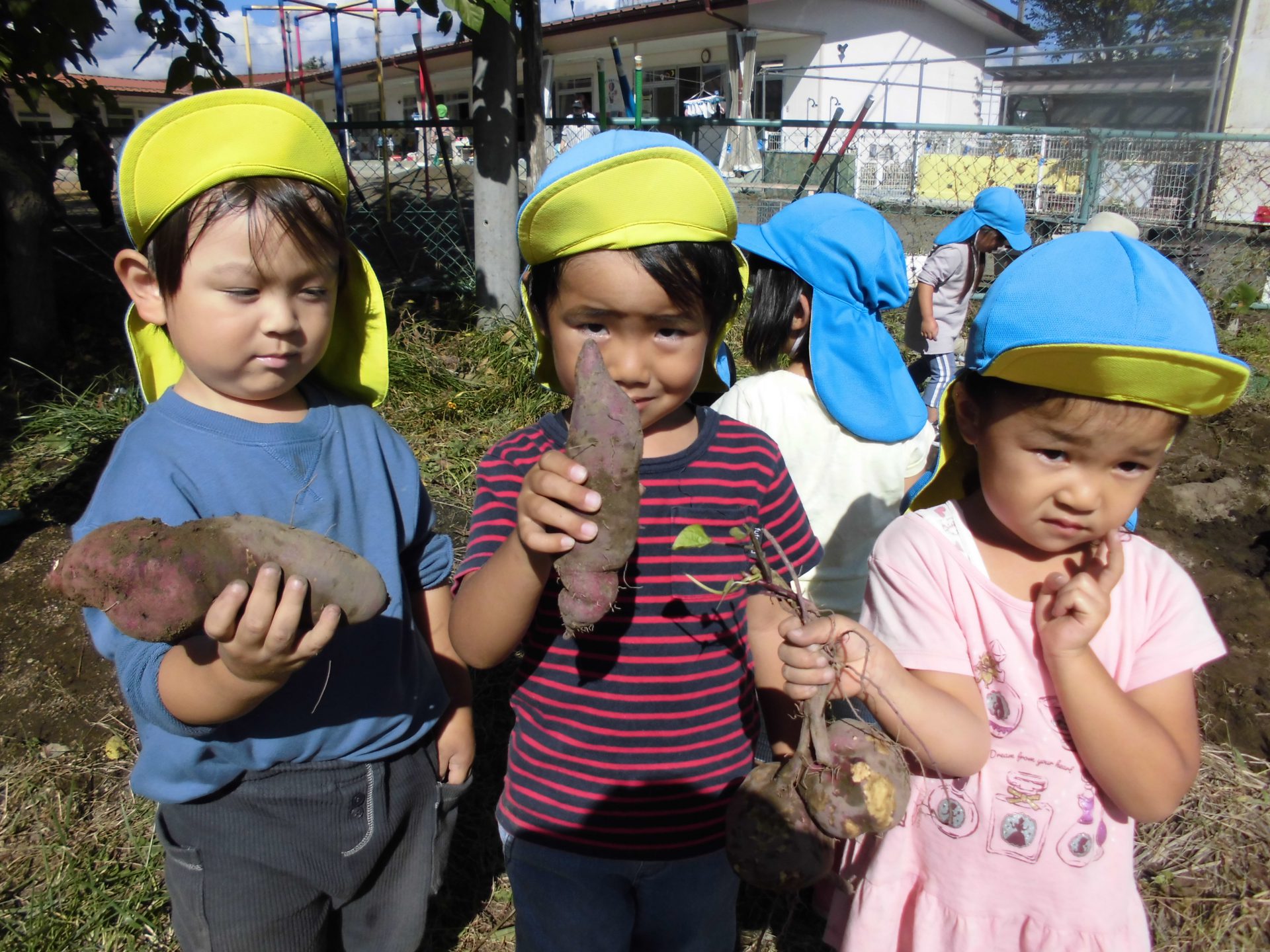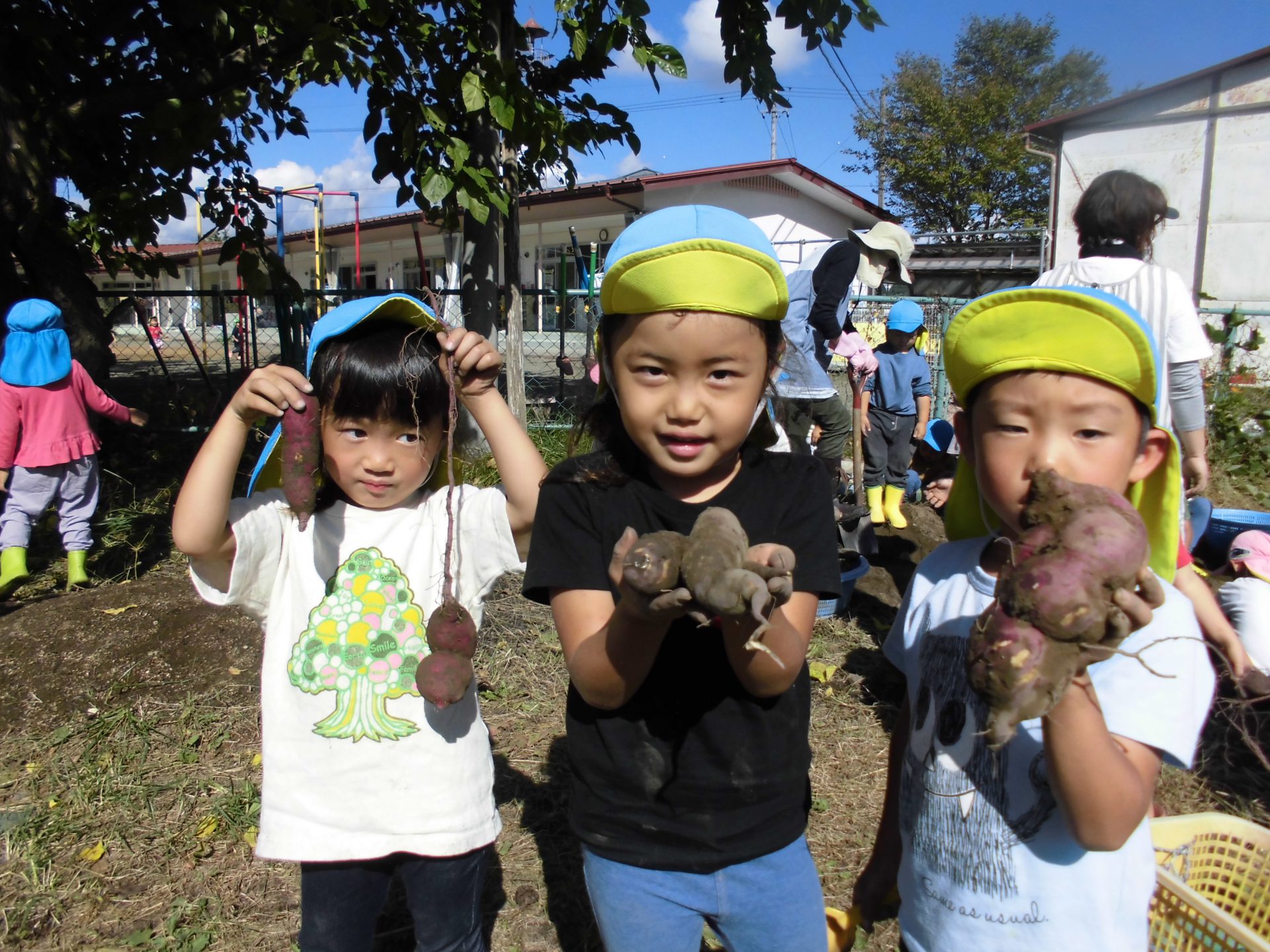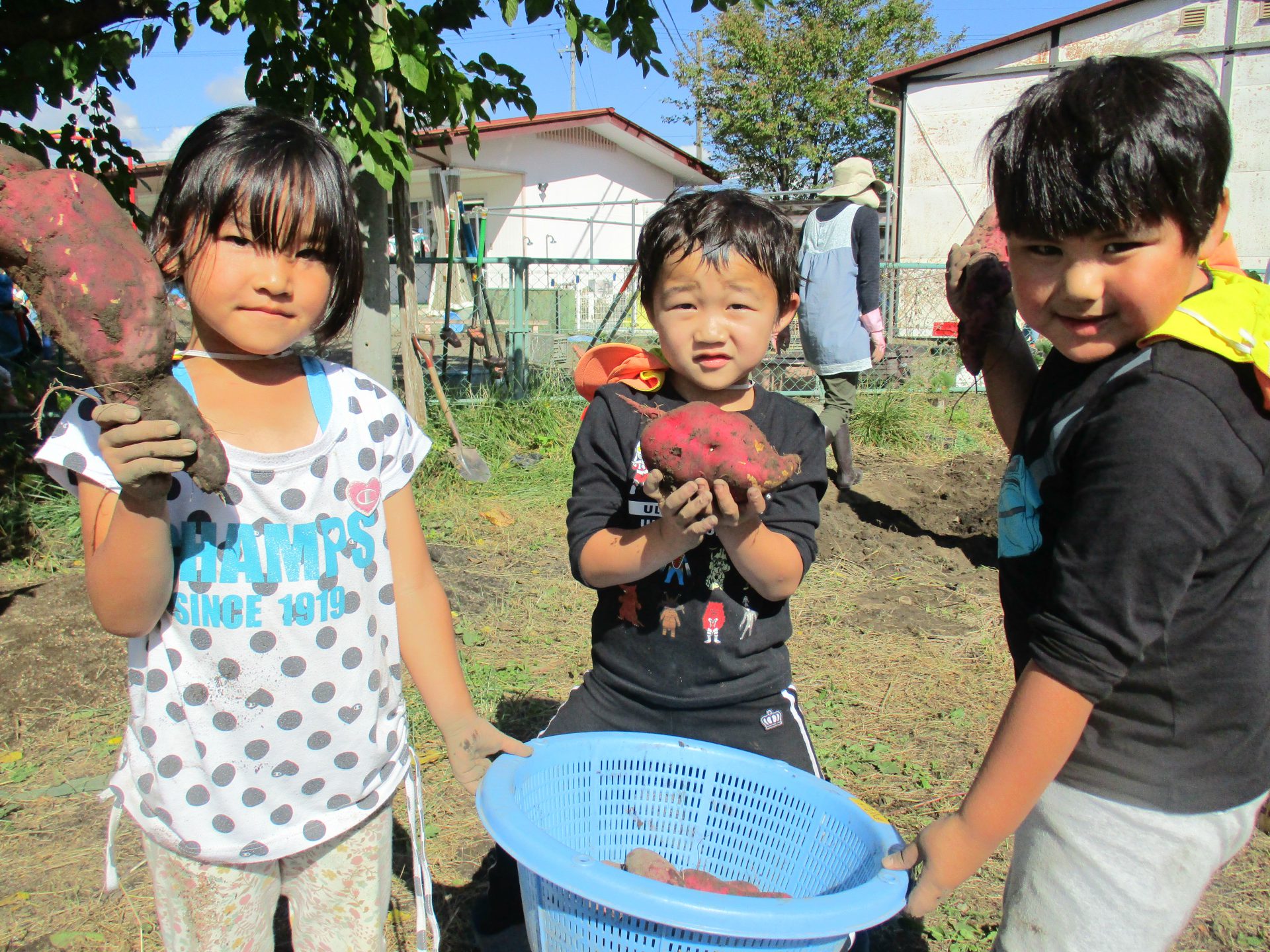 また、さつまいもが傷つかないよう、いもの周りの土をやさしく掘ることを、年少児にアドバイスをする年長児の姿等、友達と協力したり、異年齢で関わったりする共育ちが見られました。