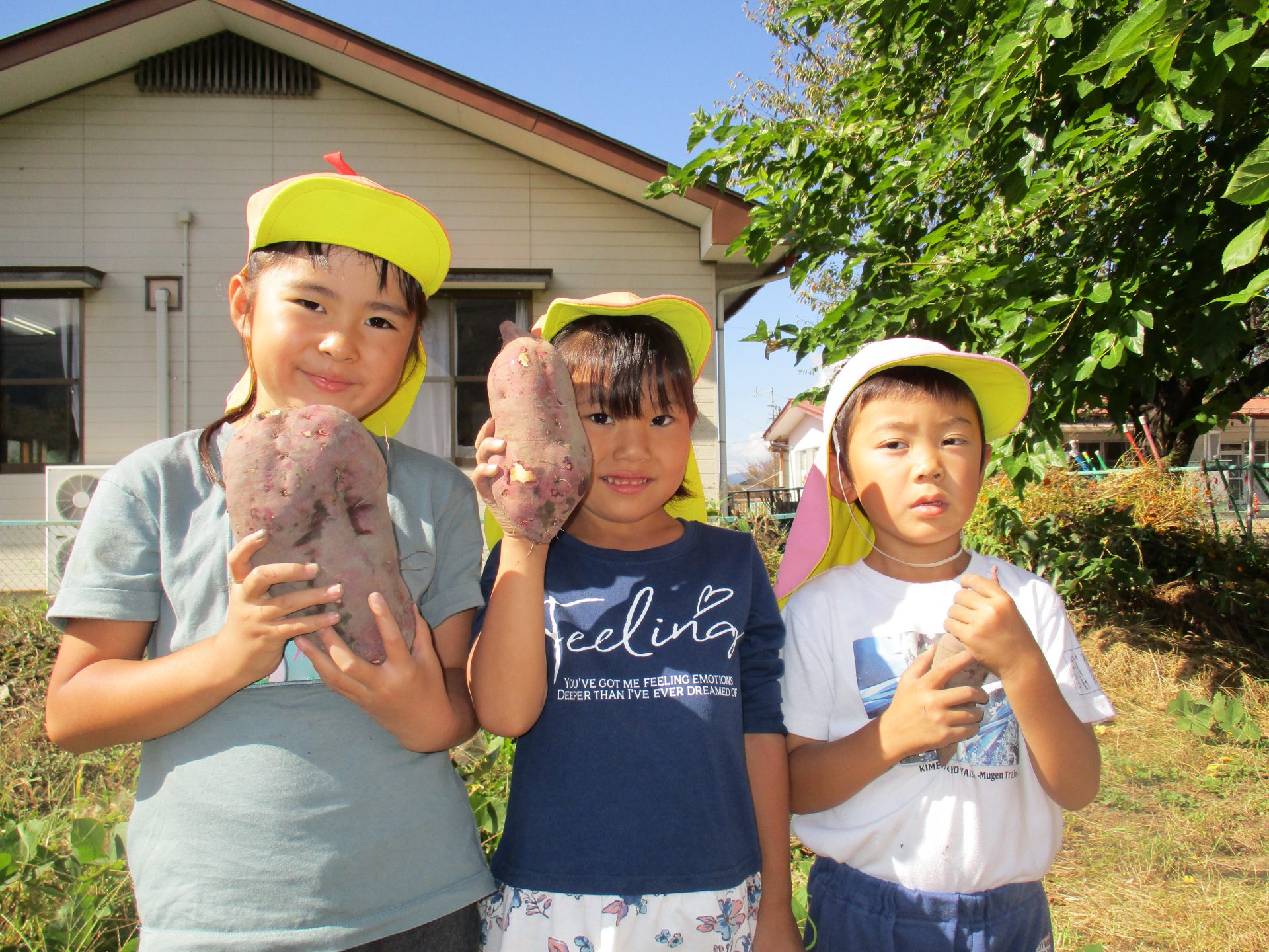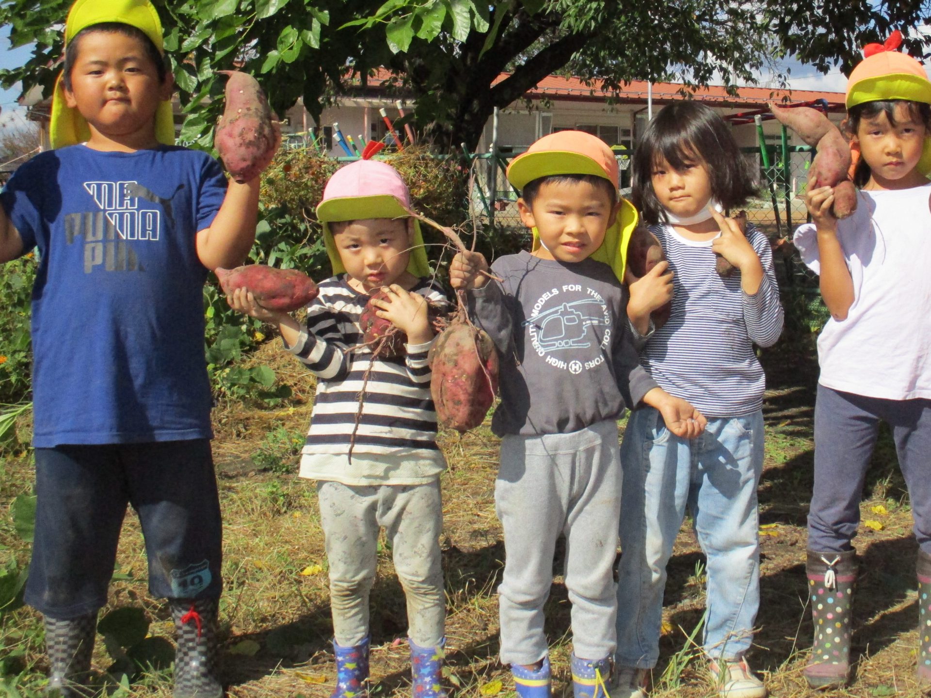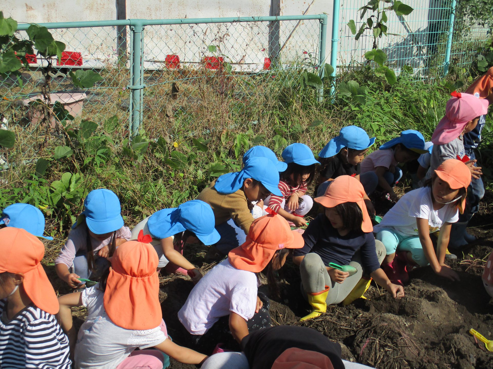 さつまいもが育つよう、年長児と年中児が中心になって草取りをしてきました。