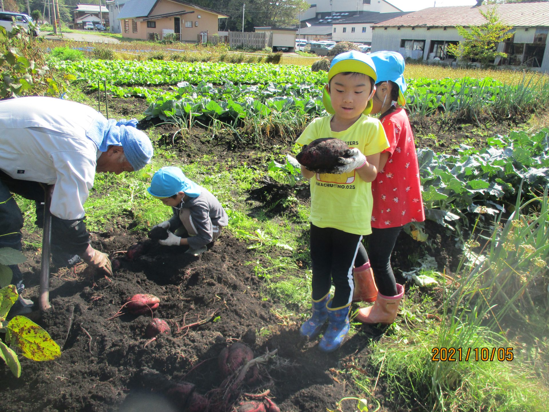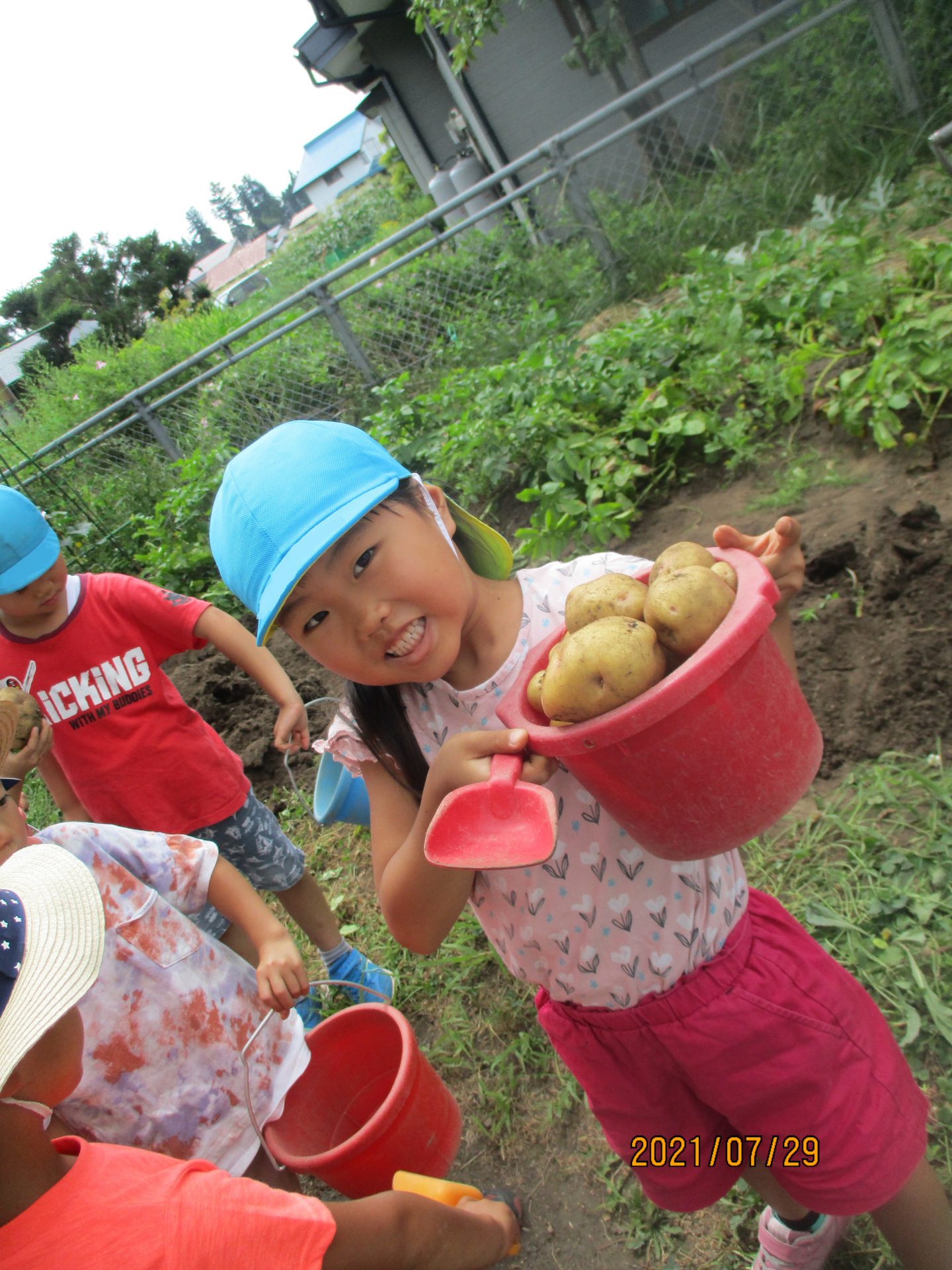 7月にはたくさんのじゃがいもをみんなで収穫し、給食で調理してもらい大喜びでした。たくさん採れたので、カレー・ポテトチップス・豚汁・シチュー・じゃがバター・みそ汁・・・など色んなメニューで出してもらいました。どれも自分たちで育てたじゃがいもは格別で「もっと食べたかったな〜」と大好評でした。
