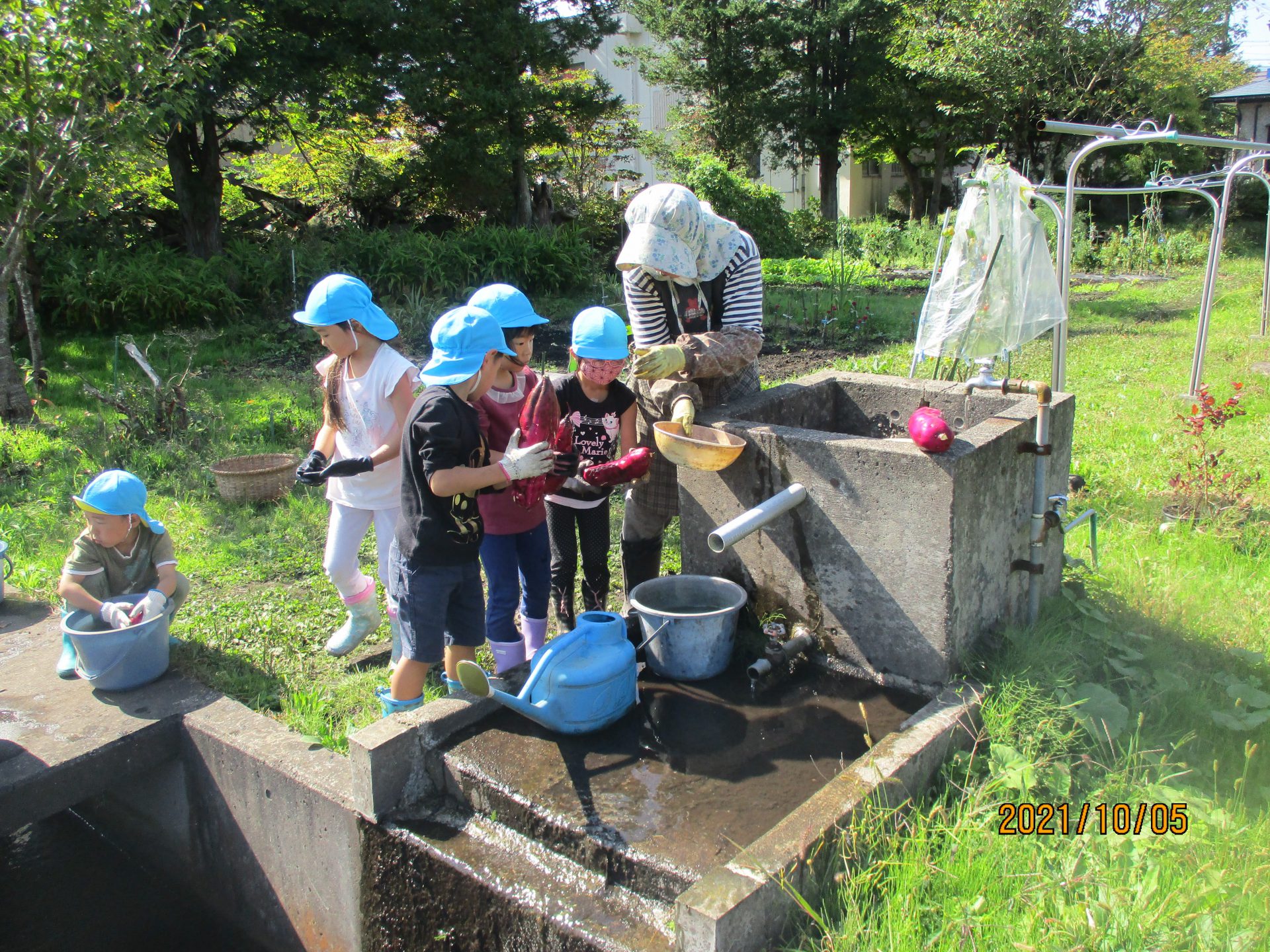夏には、畑で育てた新鮮なスイカやきゅうりを食べて、「夏は暑いから冷たくっておいしい〜!!」。そして秋になったら、また旬のものが変わってきたことに体験を通しながら気付いた子どもたち。