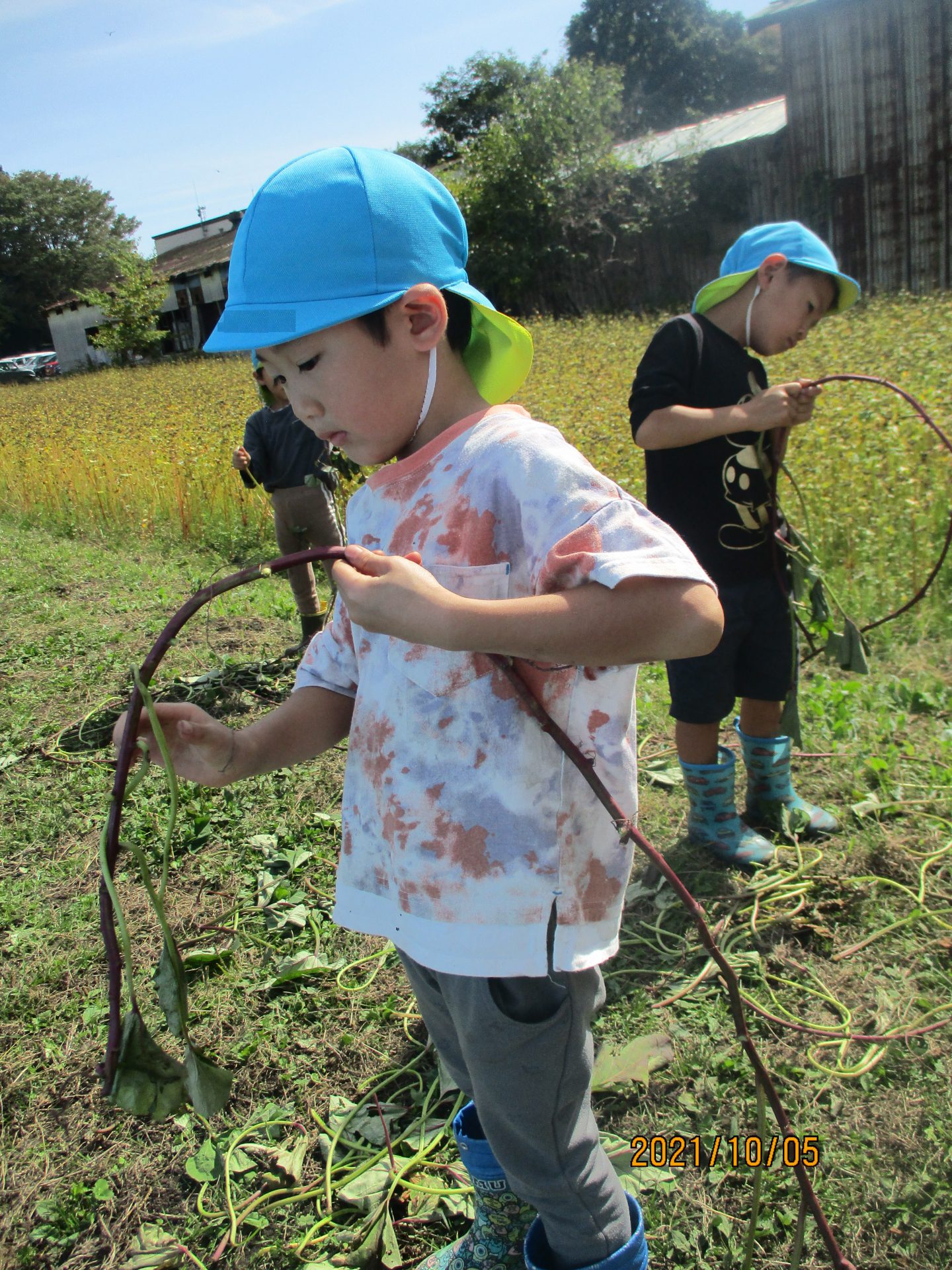「こ〜んなに長かったんだぁ」と驚きの子どもたちです。このつるを使ってリースが作れることも教えてもらい、早速畑で挑戦しました。