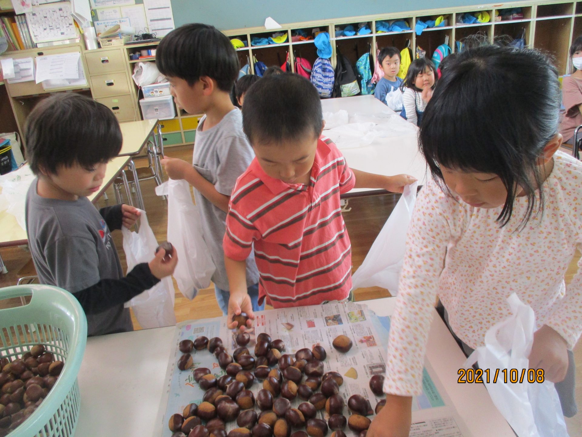 「大きい栗と少し小さい栗があるよ。」「大きいのは色が濃いね。」