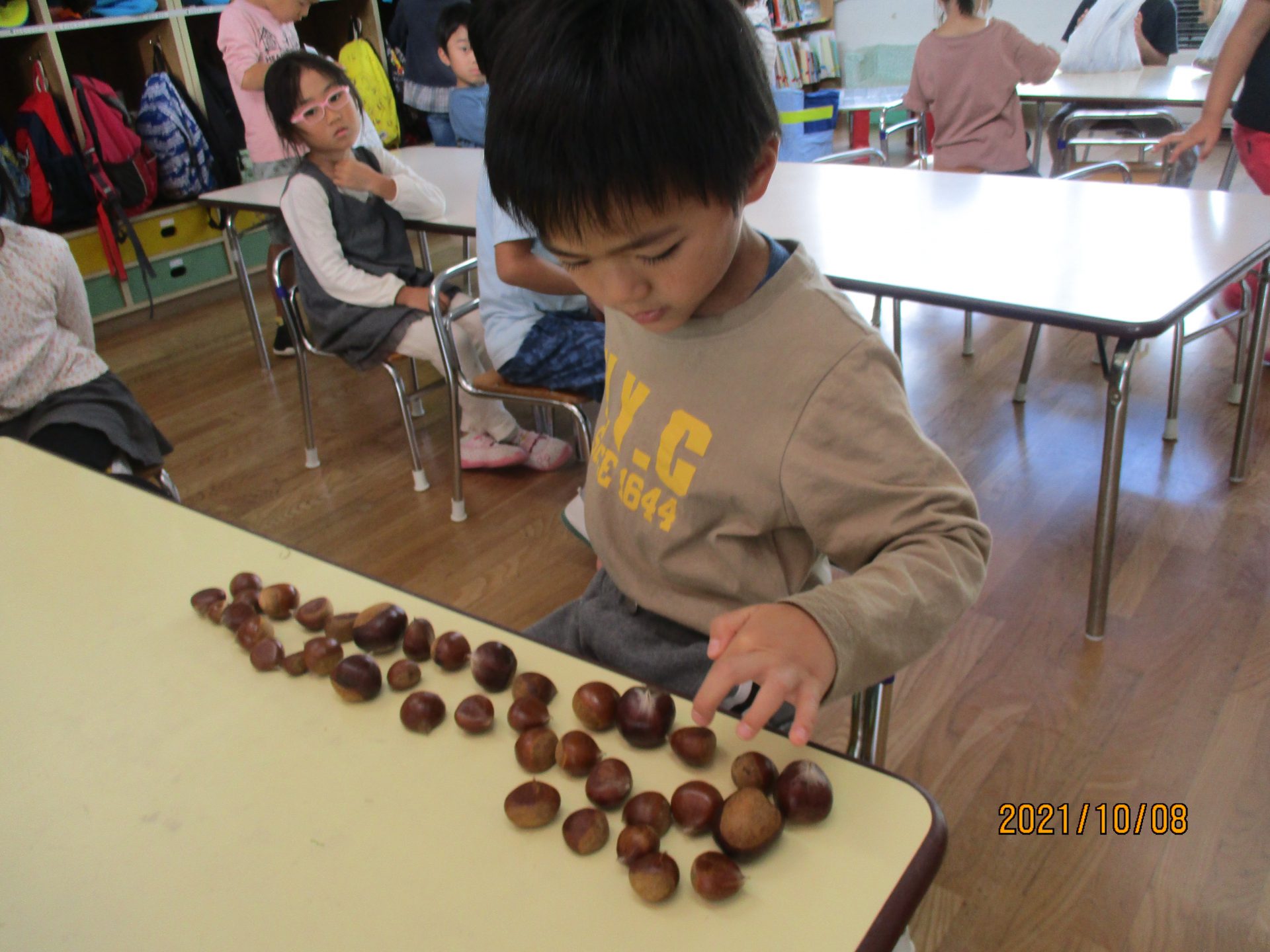 栗ひろいの後にも、いくつ拾えたか並べて数を数えたり、友達の栗と大きさを比べたり。