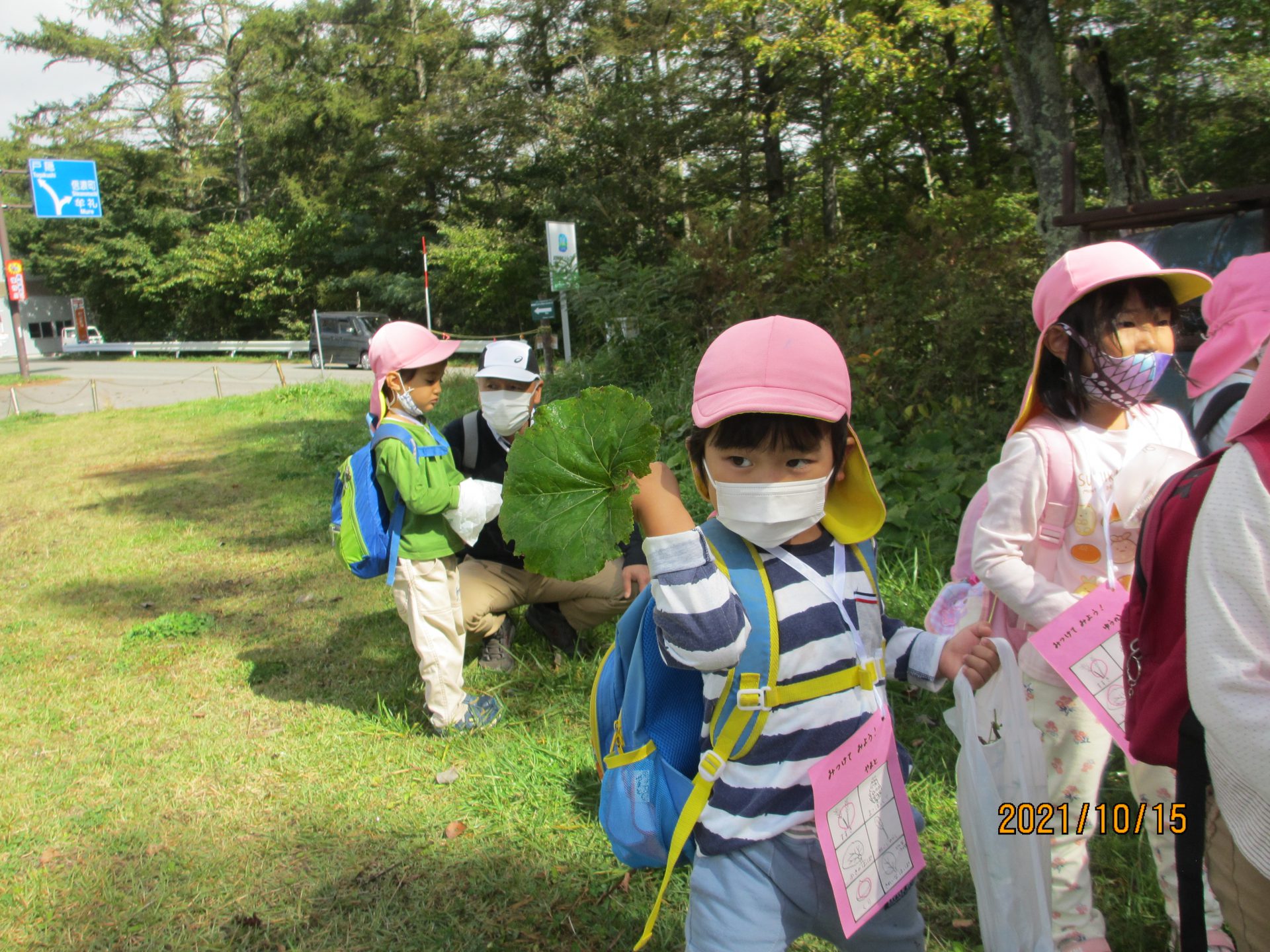 大きなフキの葉っぱを見つけた年中さん。