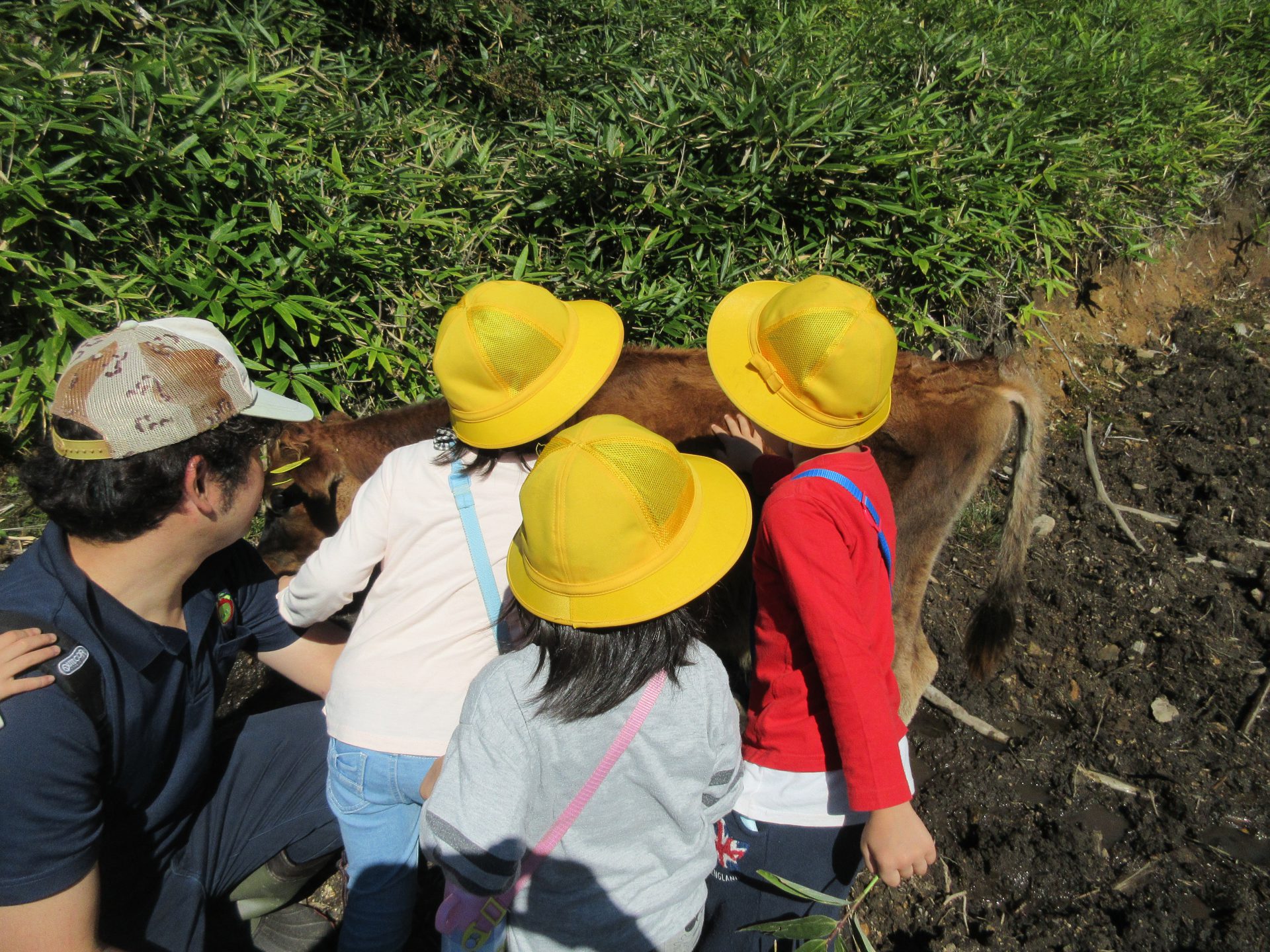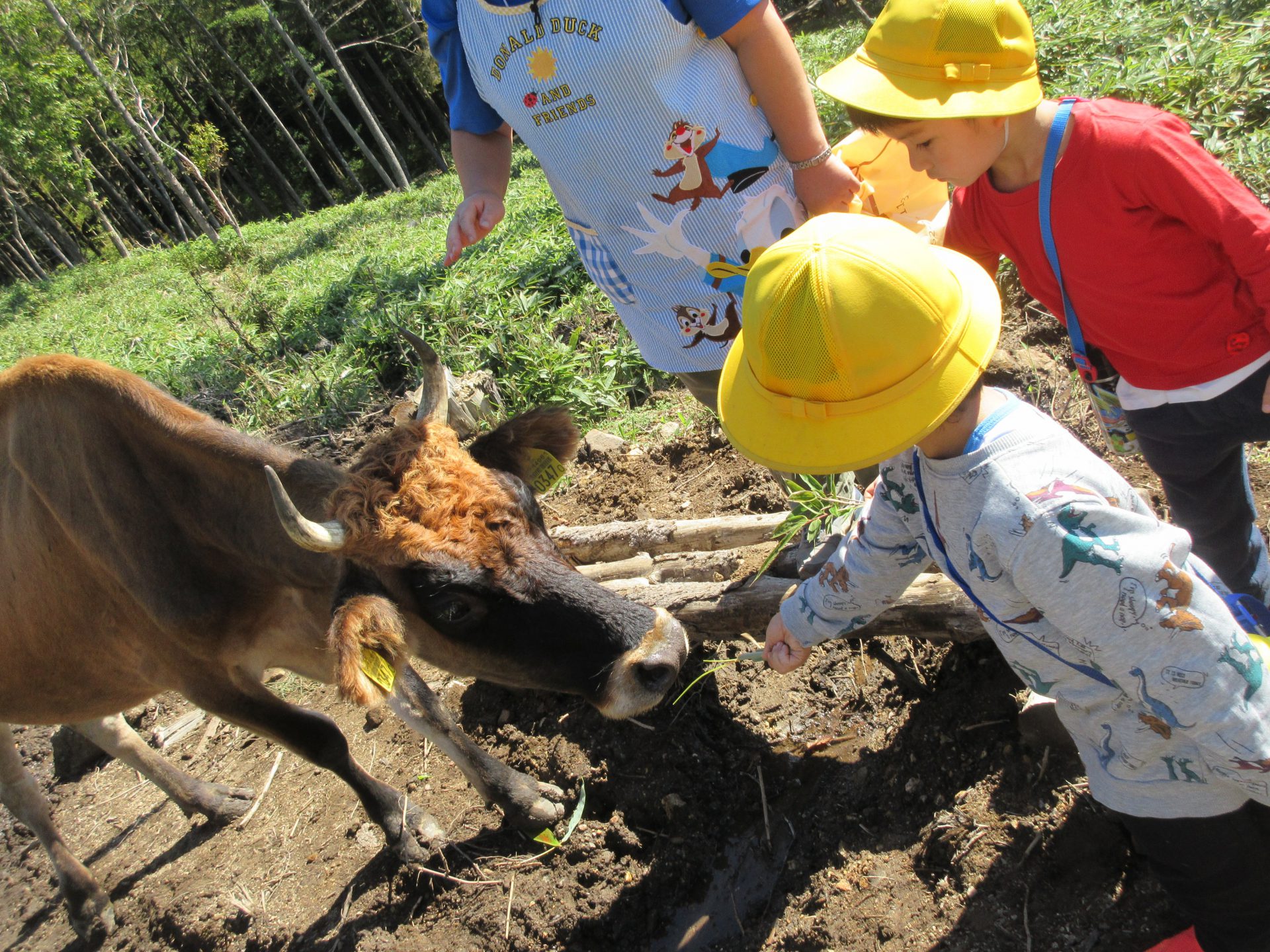 道沿いにある草や笹の葉を手に採っては「これ、牛さん食べるかなぁ」と、気にかけたり、地面に牛の足跡を見つけ、前に進むにつれ足跡が増えてくると、「もう、牛さんがおるんじゃない?」と、牛に会えるのを楽しみにしていました。