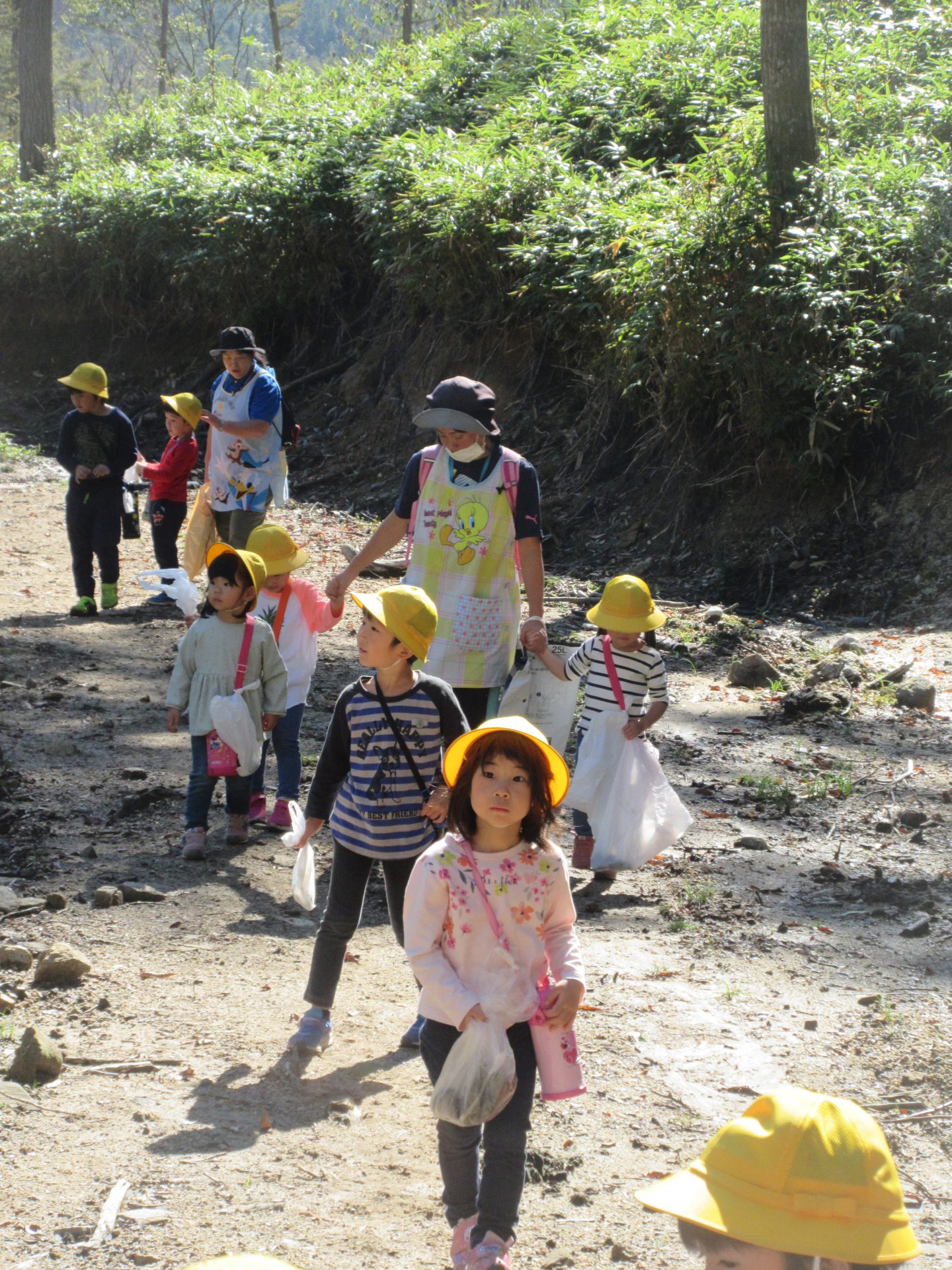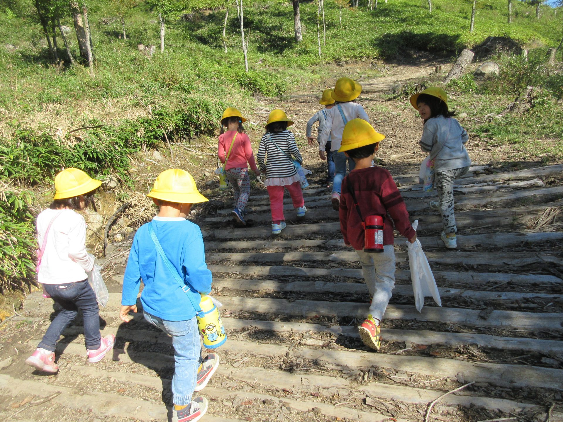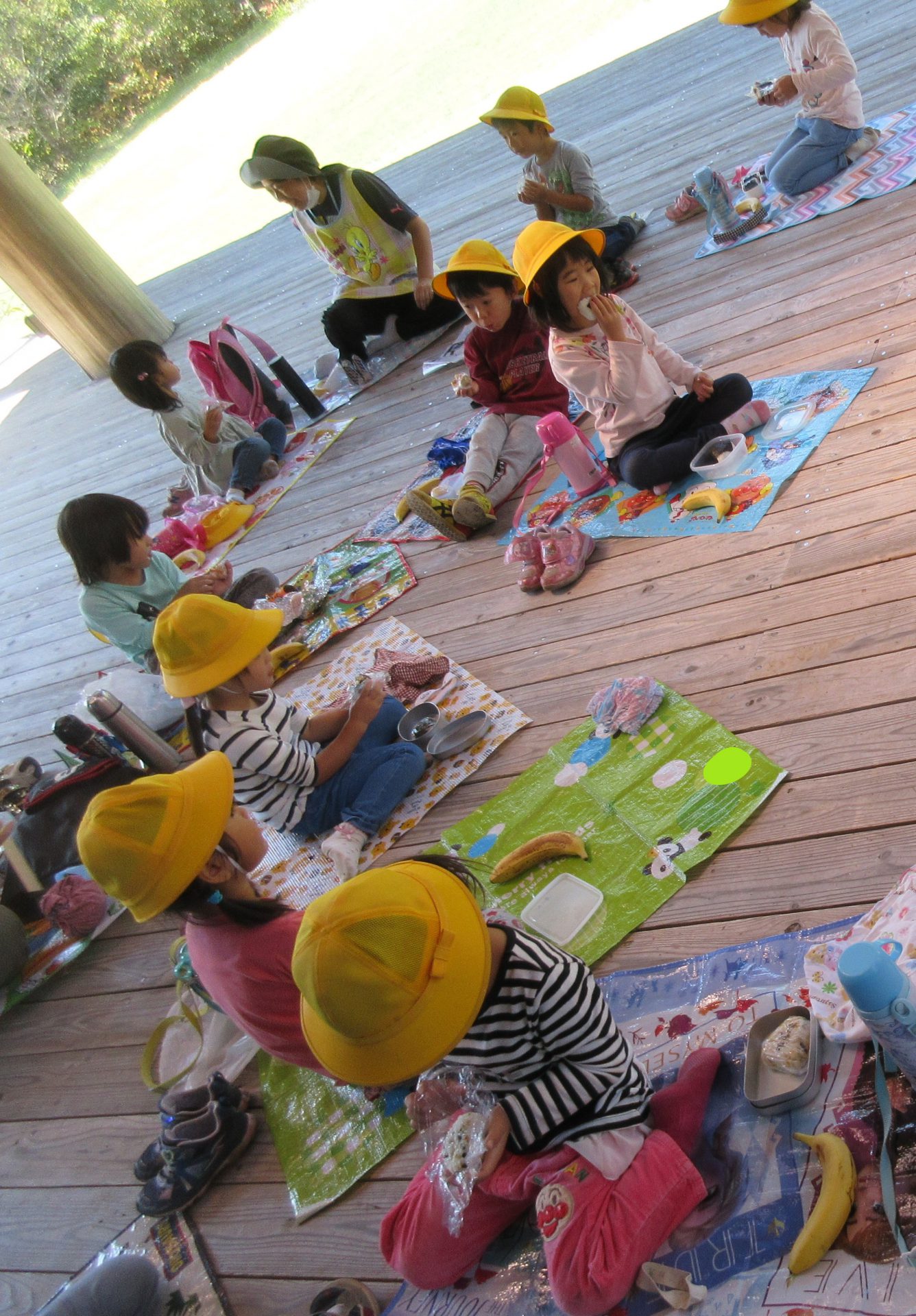 お待ちかねのお弁当タイム。お山にいる時に「おなかすいたぁー」「お昼まだぁー?」と、言っていた子どもたち。いっぱい歩いて、遊んだので、一段とおにぎりがおいしいようでパクパク。「みてー、唐揚げが入っとる」「お豆とチーズだよ」「味ご飯」と、愛情あふれる、アイデアおにぎりを喜んで食べます。園から持ってきたバナナとお楽しみのネバーランドのヨーグルトを食べ満足の様子でした。