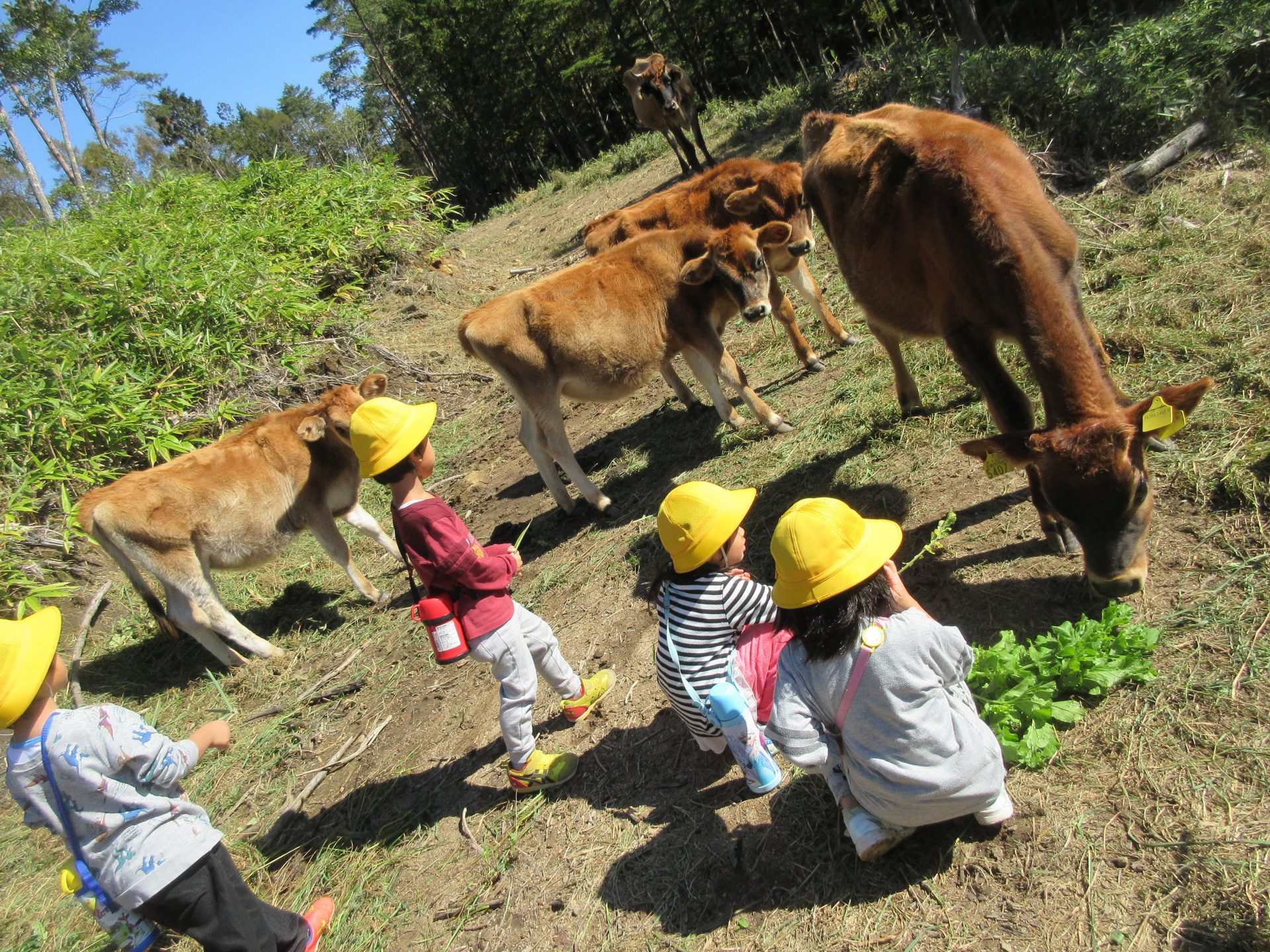 放牧されている牛たちとご対面。出迎えてくれたのは5頭。お土産に持ってきた大根の葉をあげます。牛も大喜び。葉を欲しくて近づいてきます。