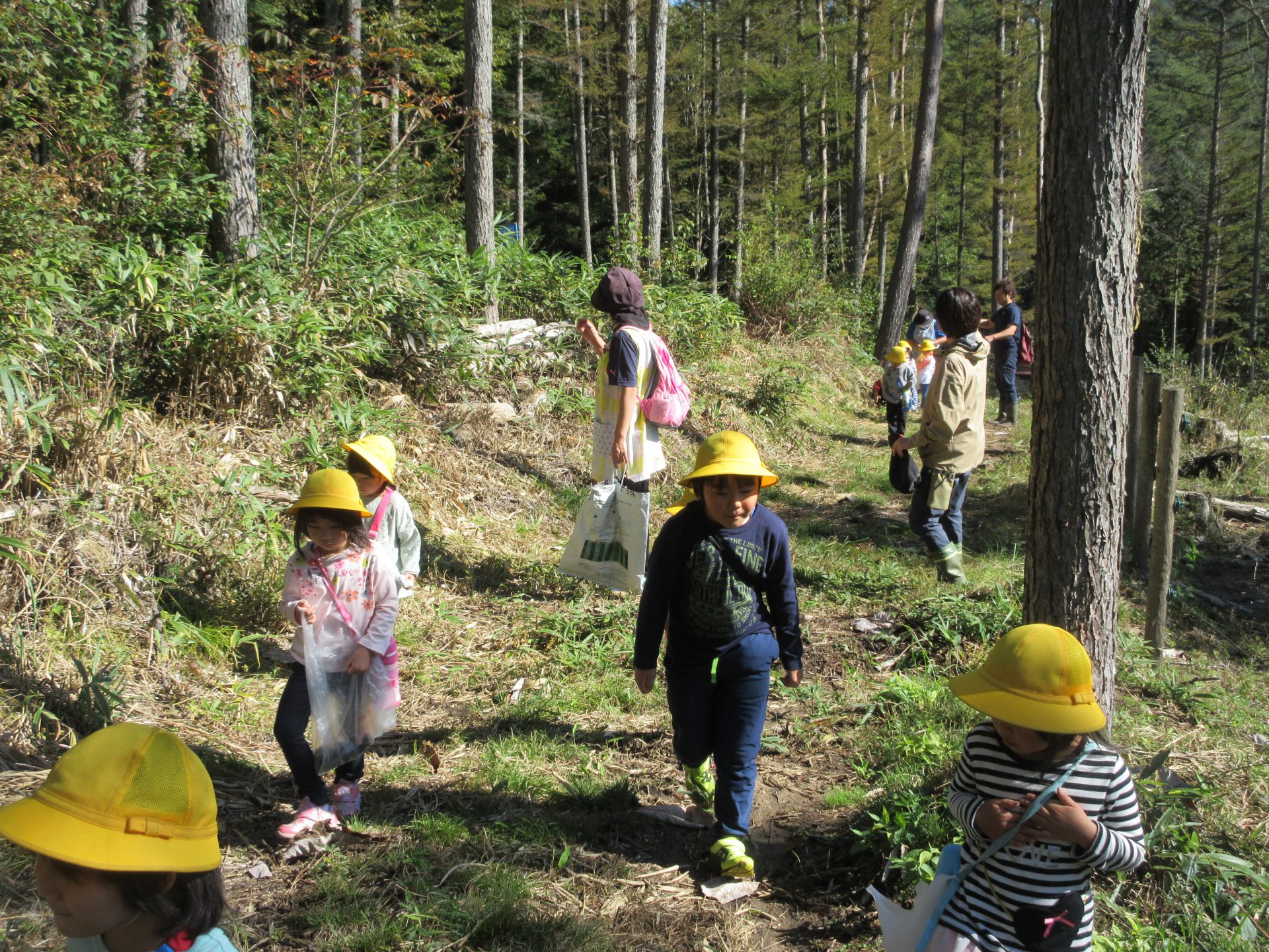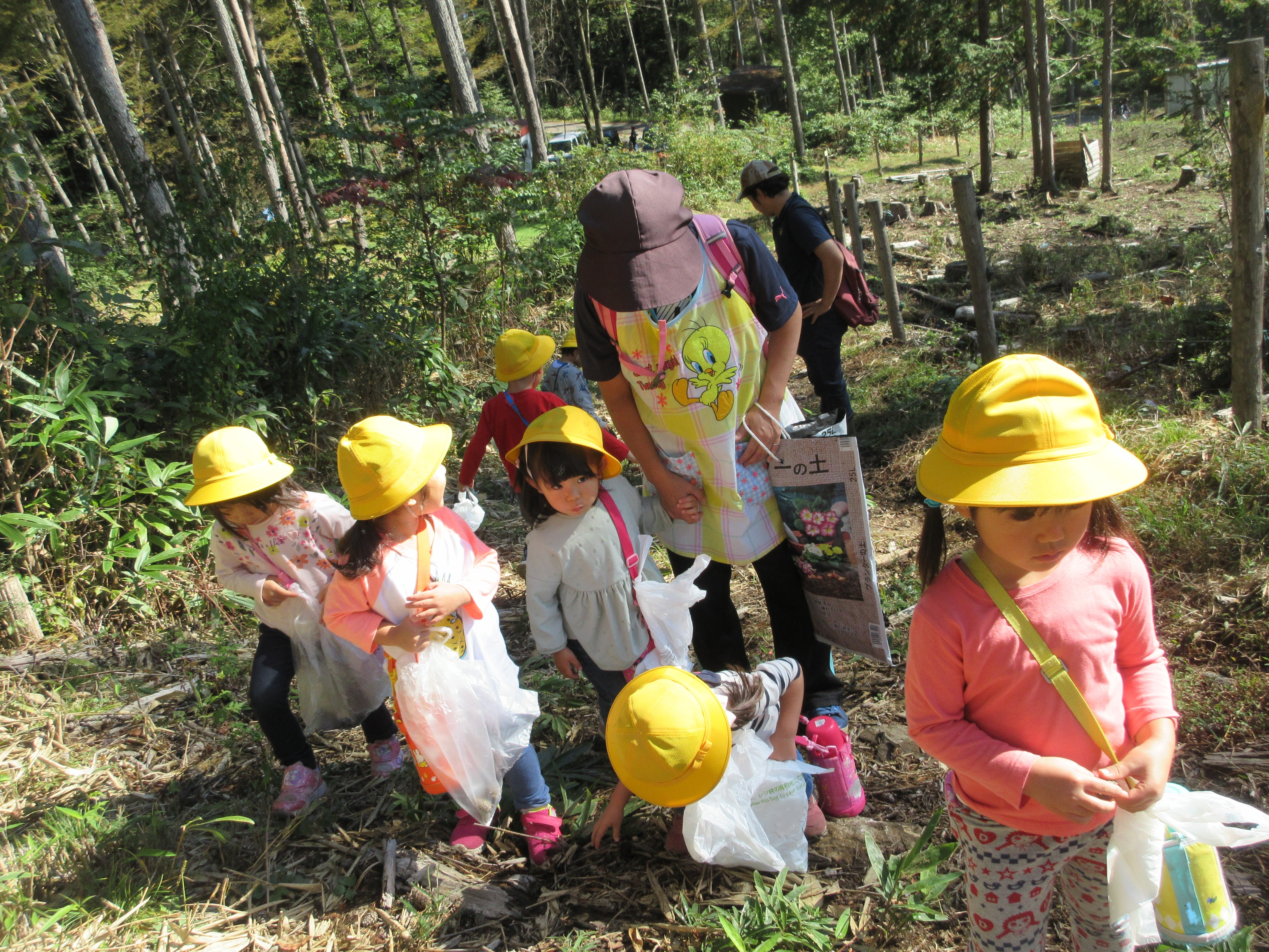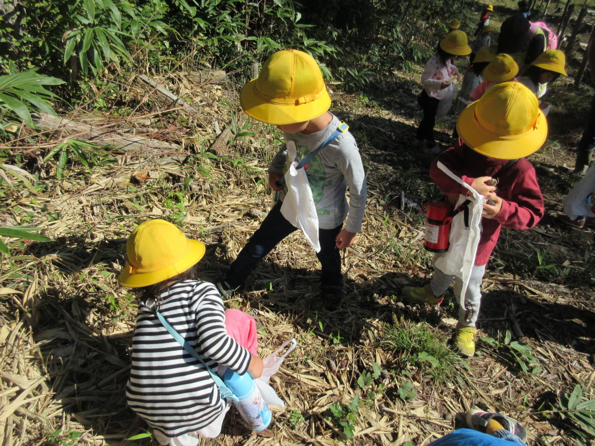 山に入ると早速木の実や虫を探す子どもたち。松ぼっくりを拾ったり、バッタやコオロギを見つけます。虫を捕まえようとしますが、草むらや落ち葉の中に隠れ、なかなか思うように捕まえれず苦戦します。