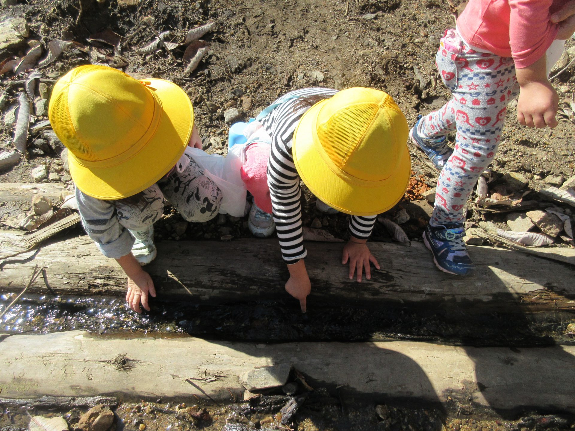 「冷たいね」途中、水が流れているのを見つけて触る子どもたち。