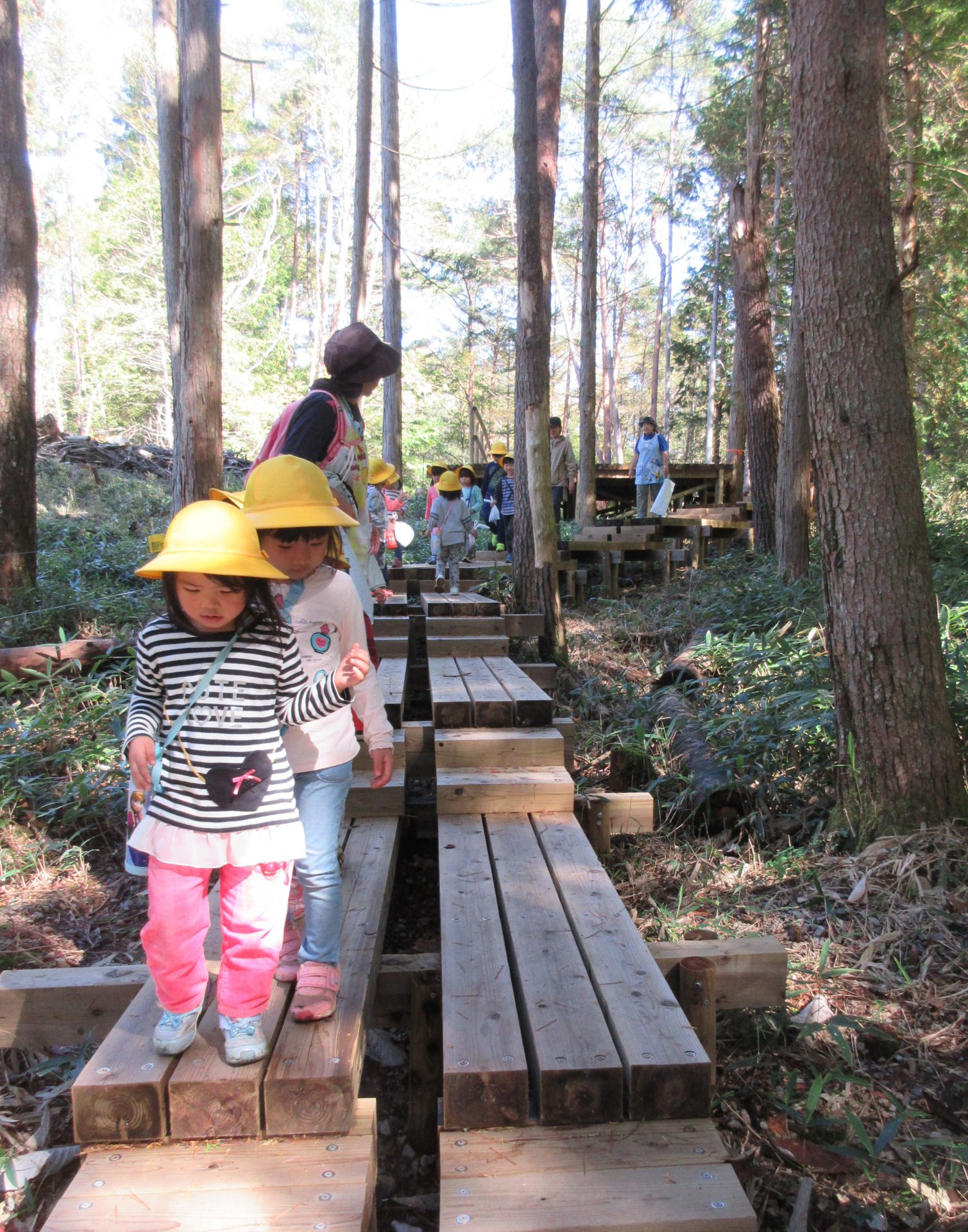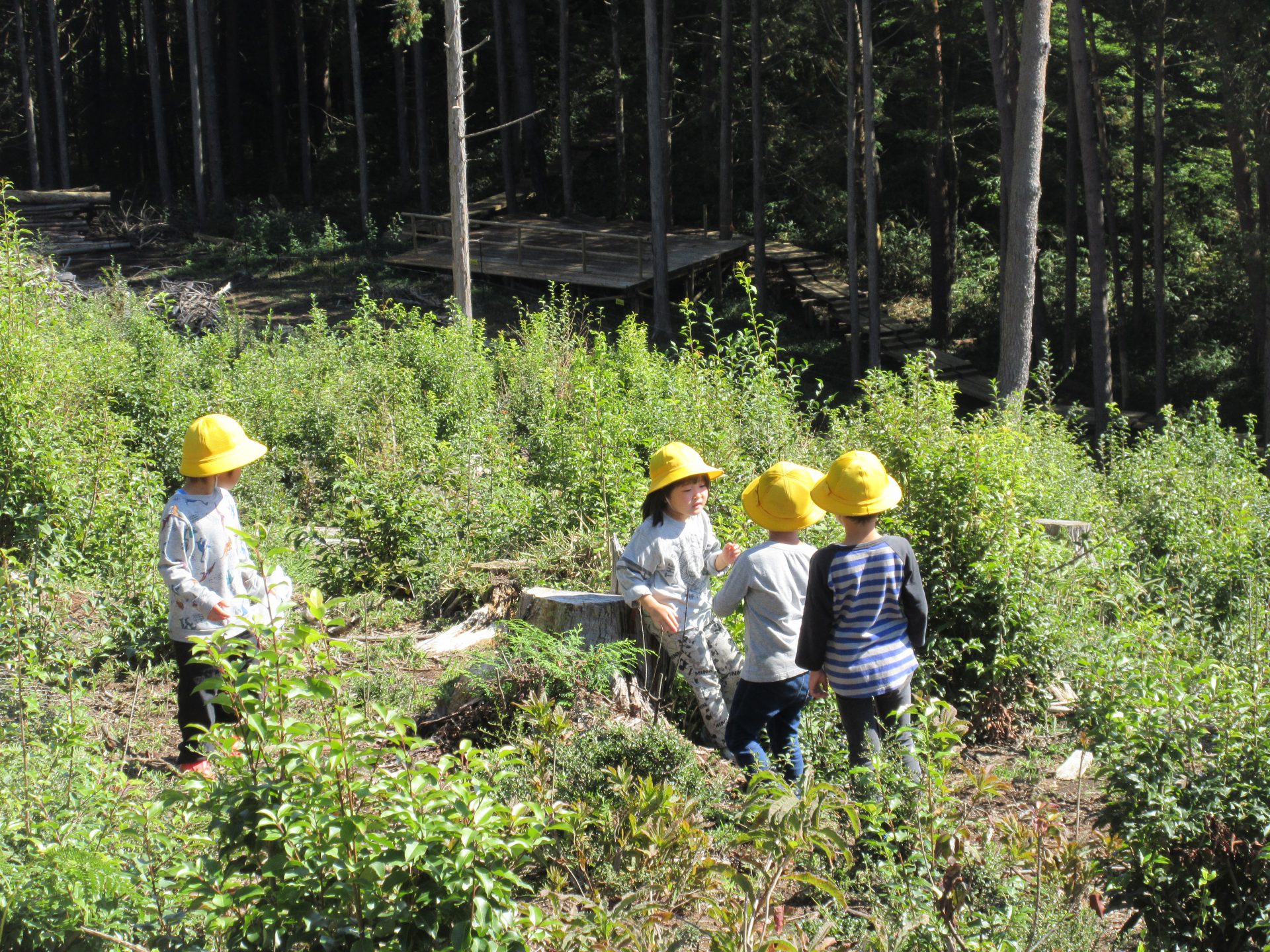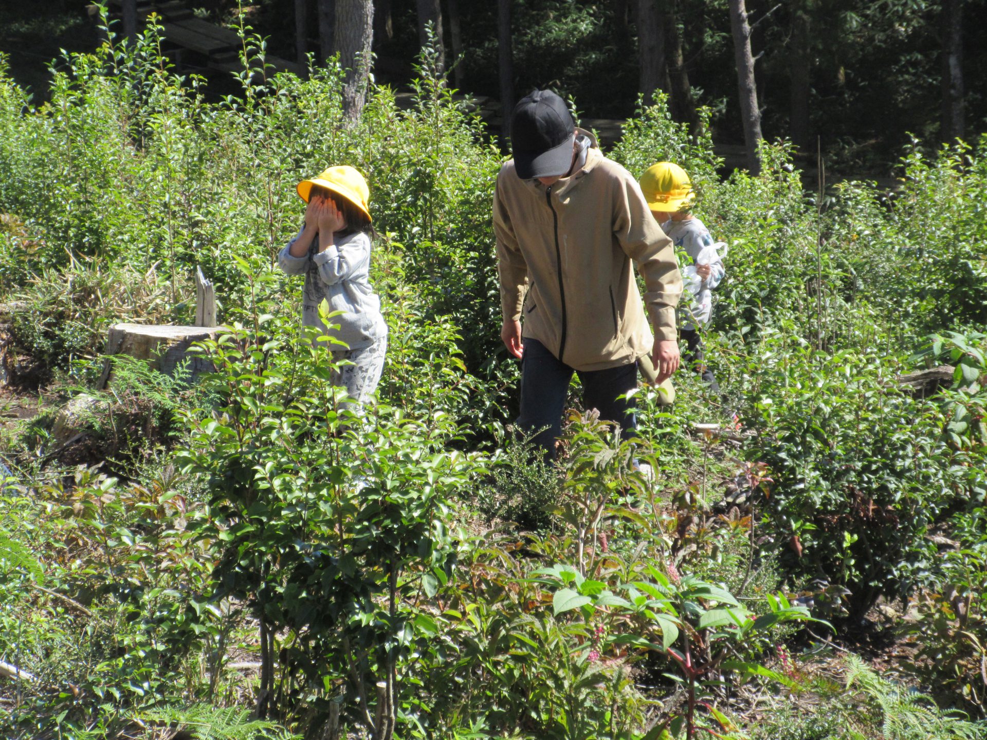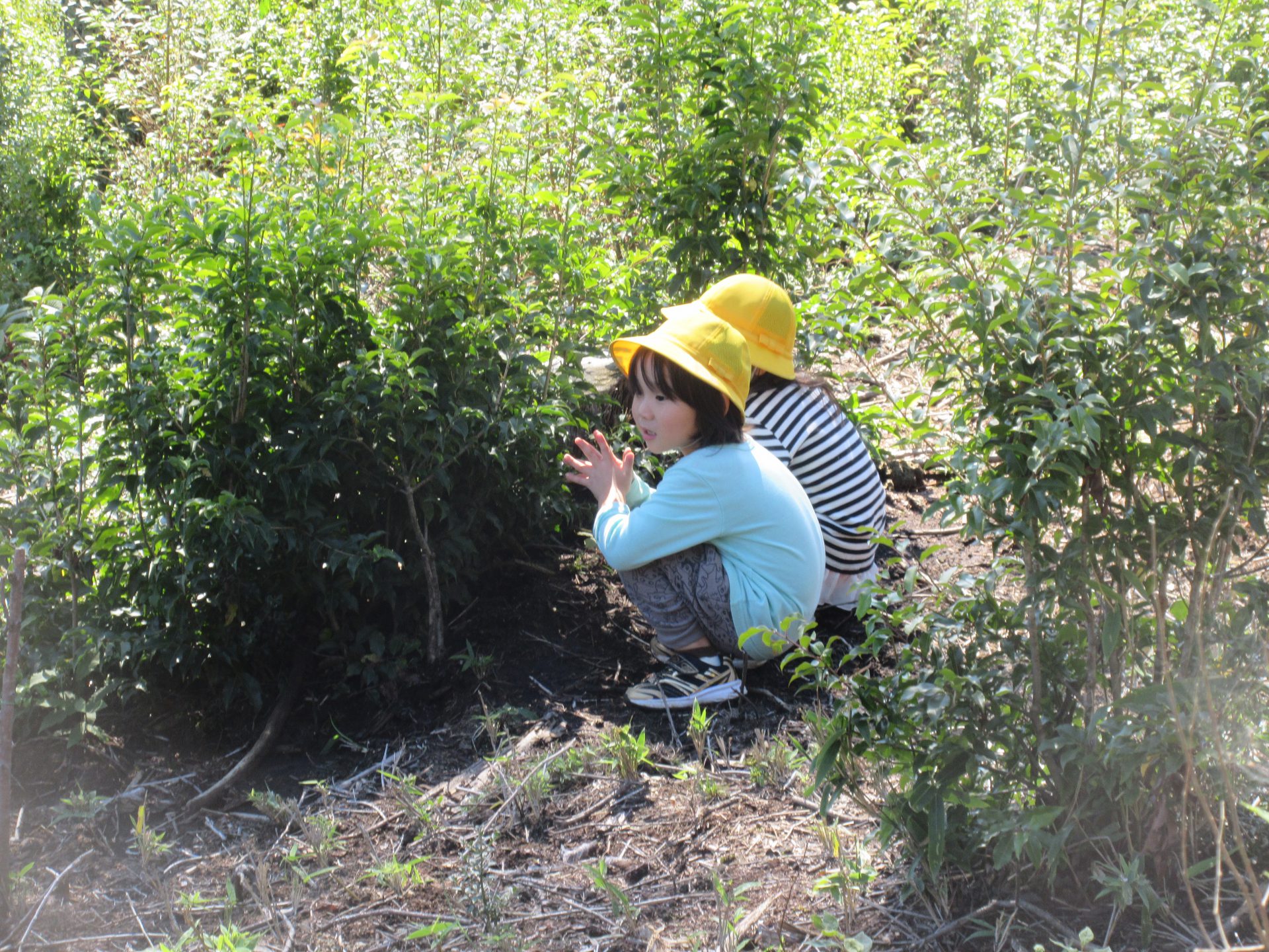 一方、こちらは散策チーム。木々の間を歩いたり、かくれんぼをして遊ぶ姿も。