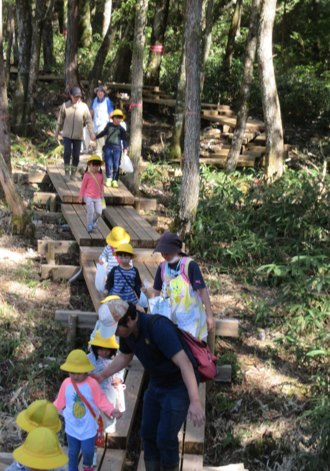 林の中の遊歩道を歩いている時、「この中って、涼しいね」「コケ、いっぱいある」と、行きの日当たりの良い道との違いに気づく子どもたち。保育士が「高い木が生えている中だから、お日さまが当たらなくて涼しくて、土も湿っぽいからコケもいっぱい生えるんだよ」と、話すと、「へぇー、そっか」と周りを見回していました。