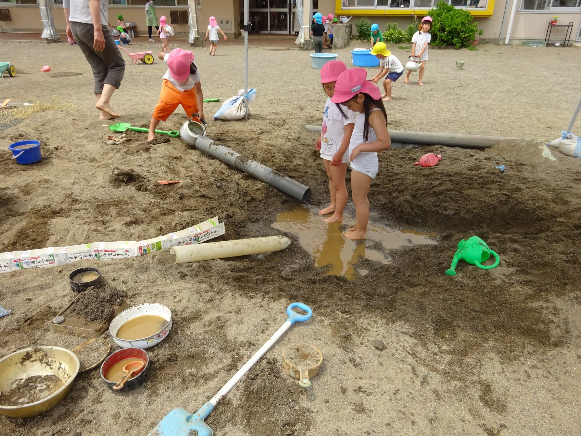 みんなで協力して砂場に大きな穴を掘り、そこに水を「よいしょよいしょ…」