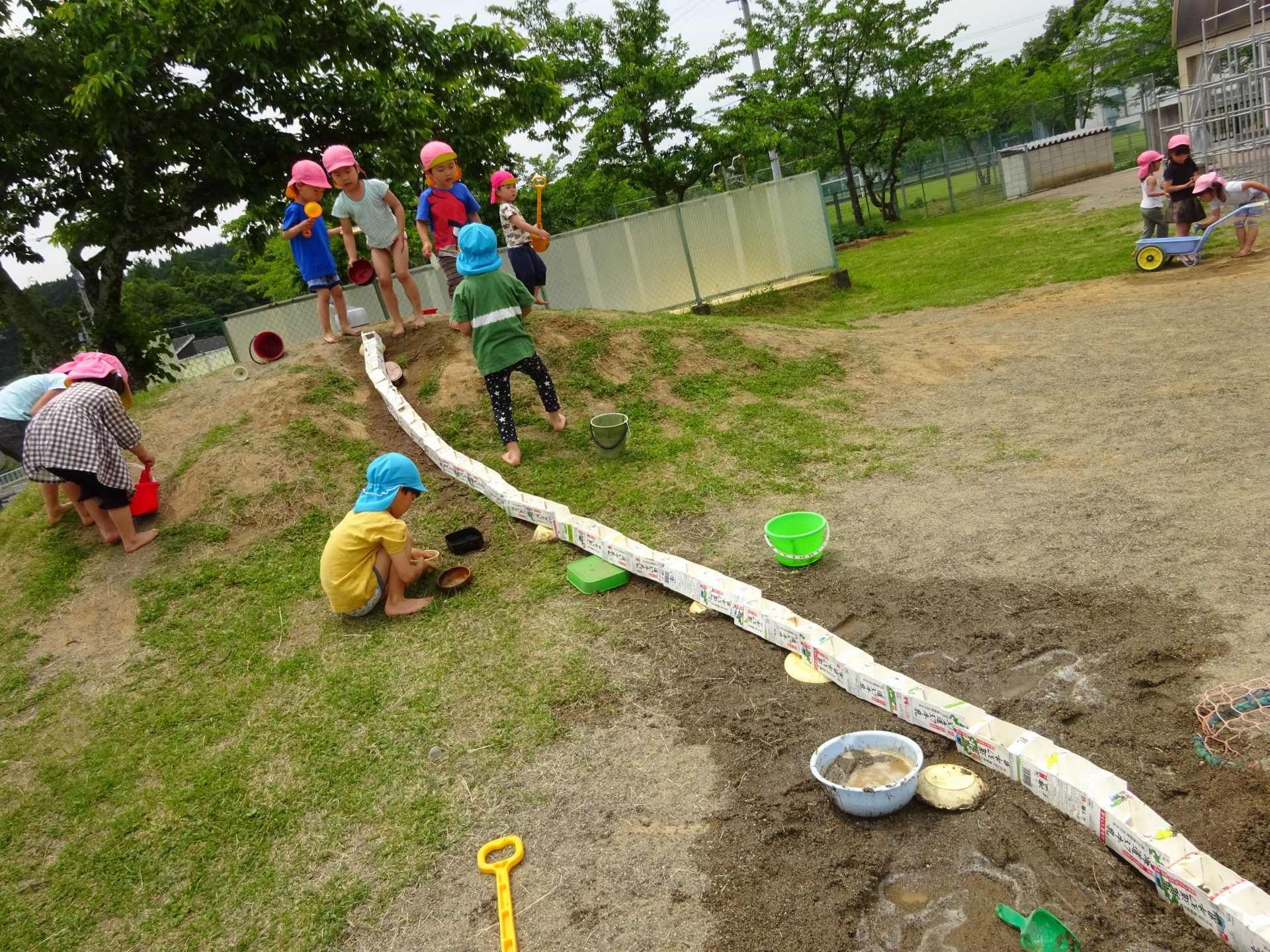 砂場の近くにある築山から、牛乳パックで長い水路を作りました。