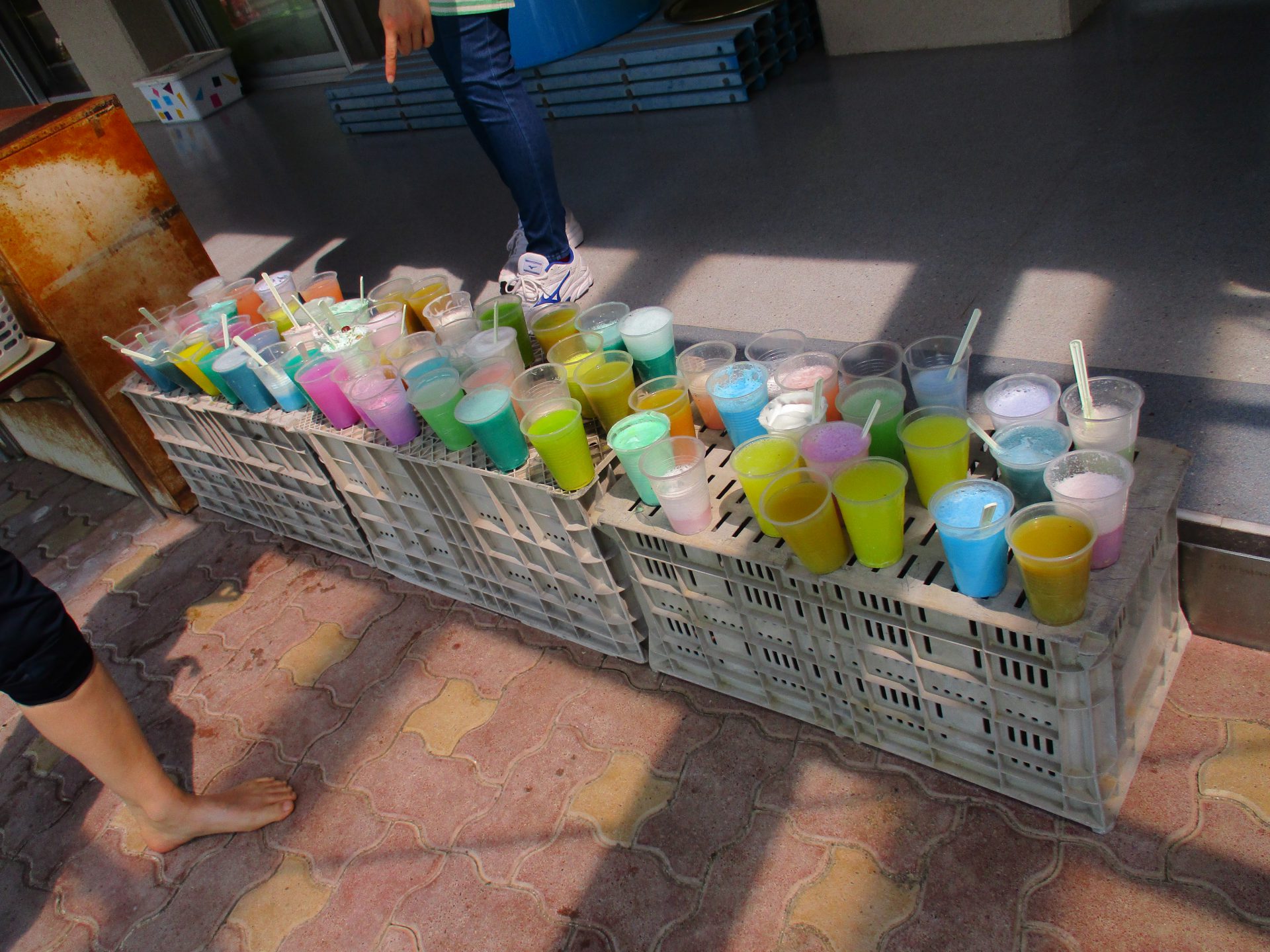 ここでは、色水やカップ、せっけんや泡だて器などを使って、自分でジュースを作りました。