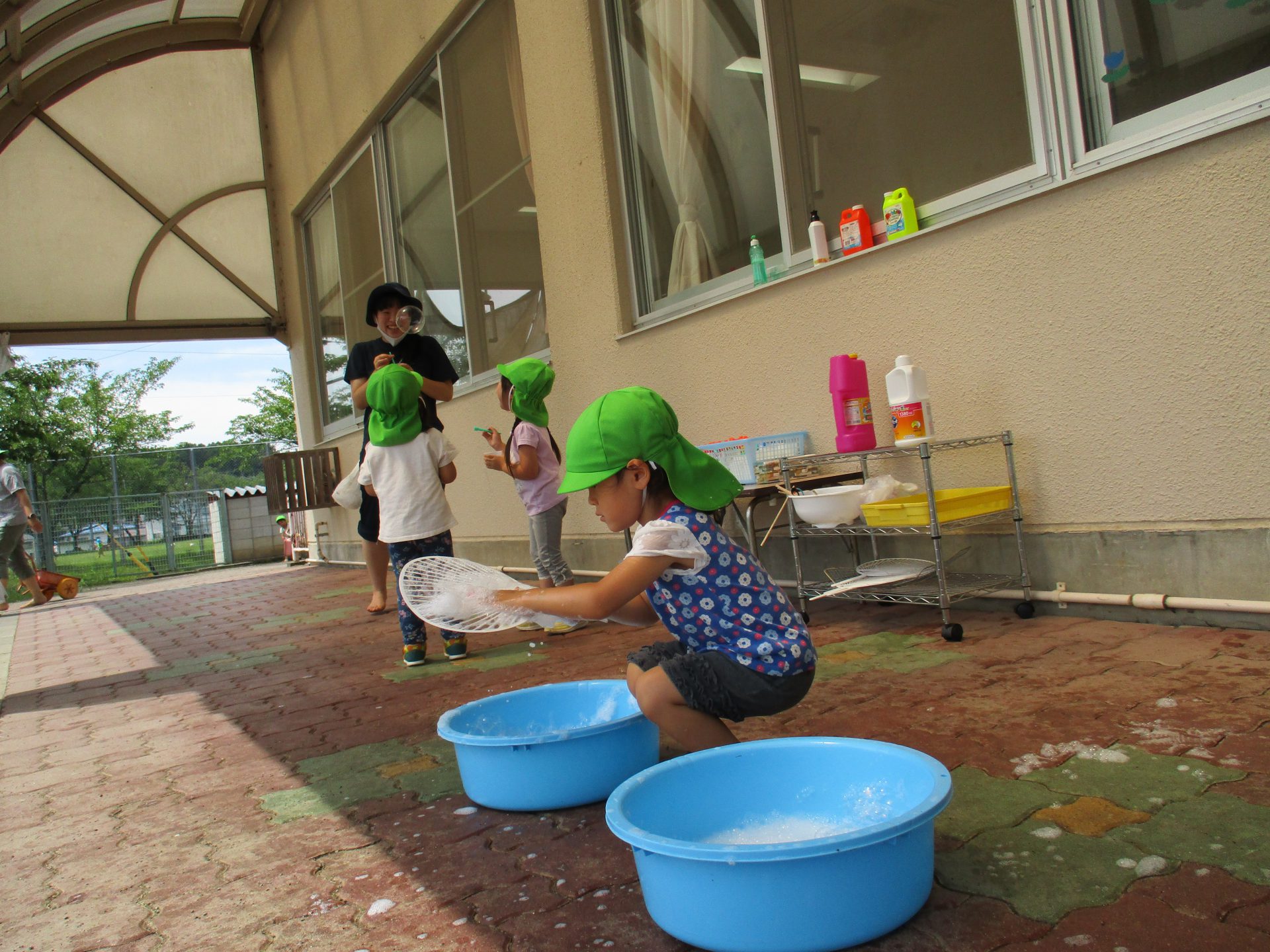 例えば、泡遊びコーナーでは、水の量・せっけんの量、泡立て方をを自分で考え、繰り返し遊んだことできめ細かい泡を作ることができました。