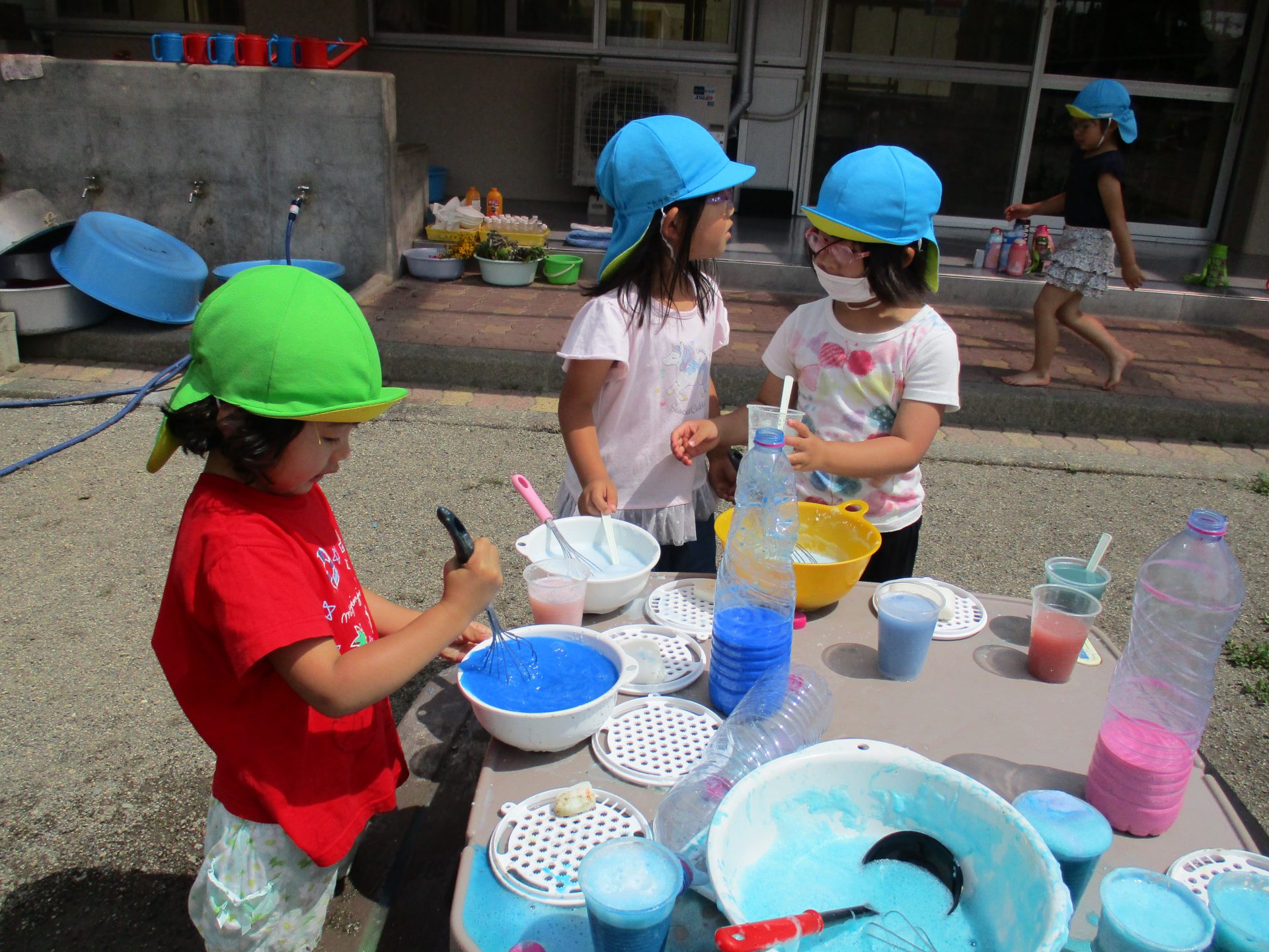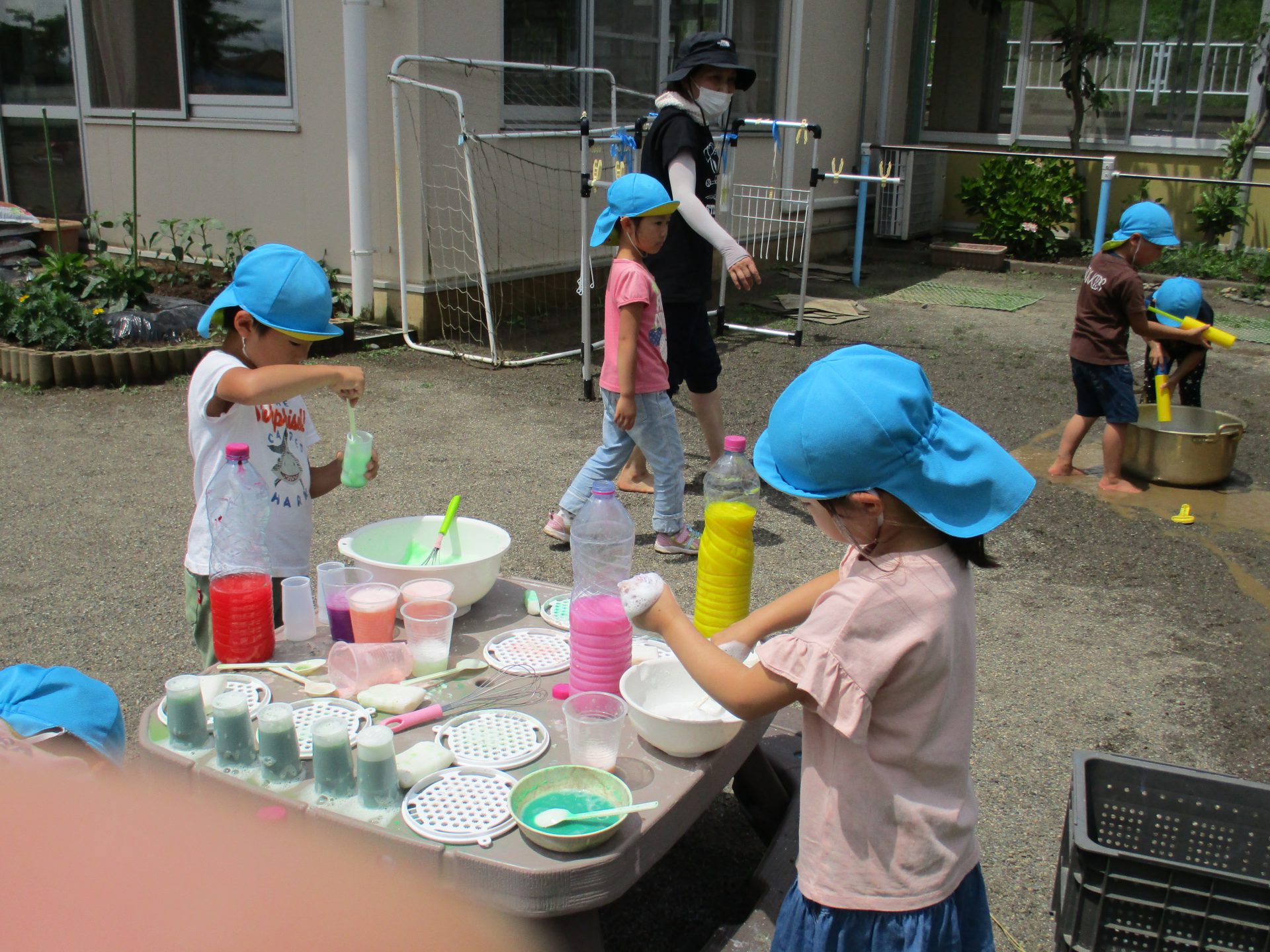 また、異年齢での交流もあり、色水コーナーでは色水を上手く注げない年下児に代わって、注いであげる年上児の姿が見られました。