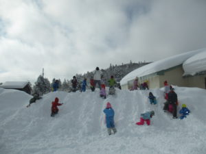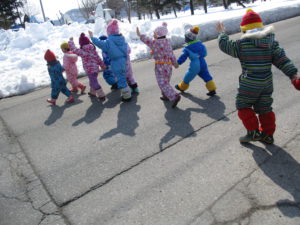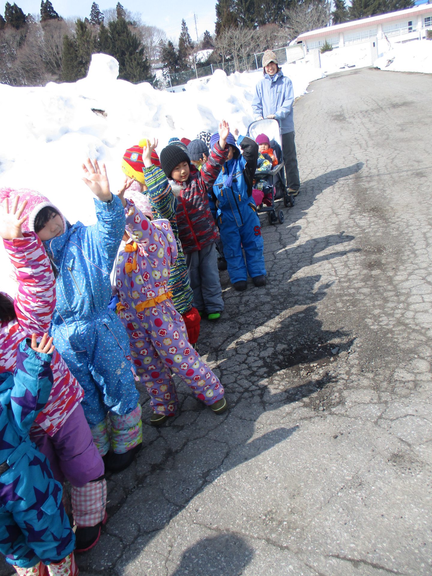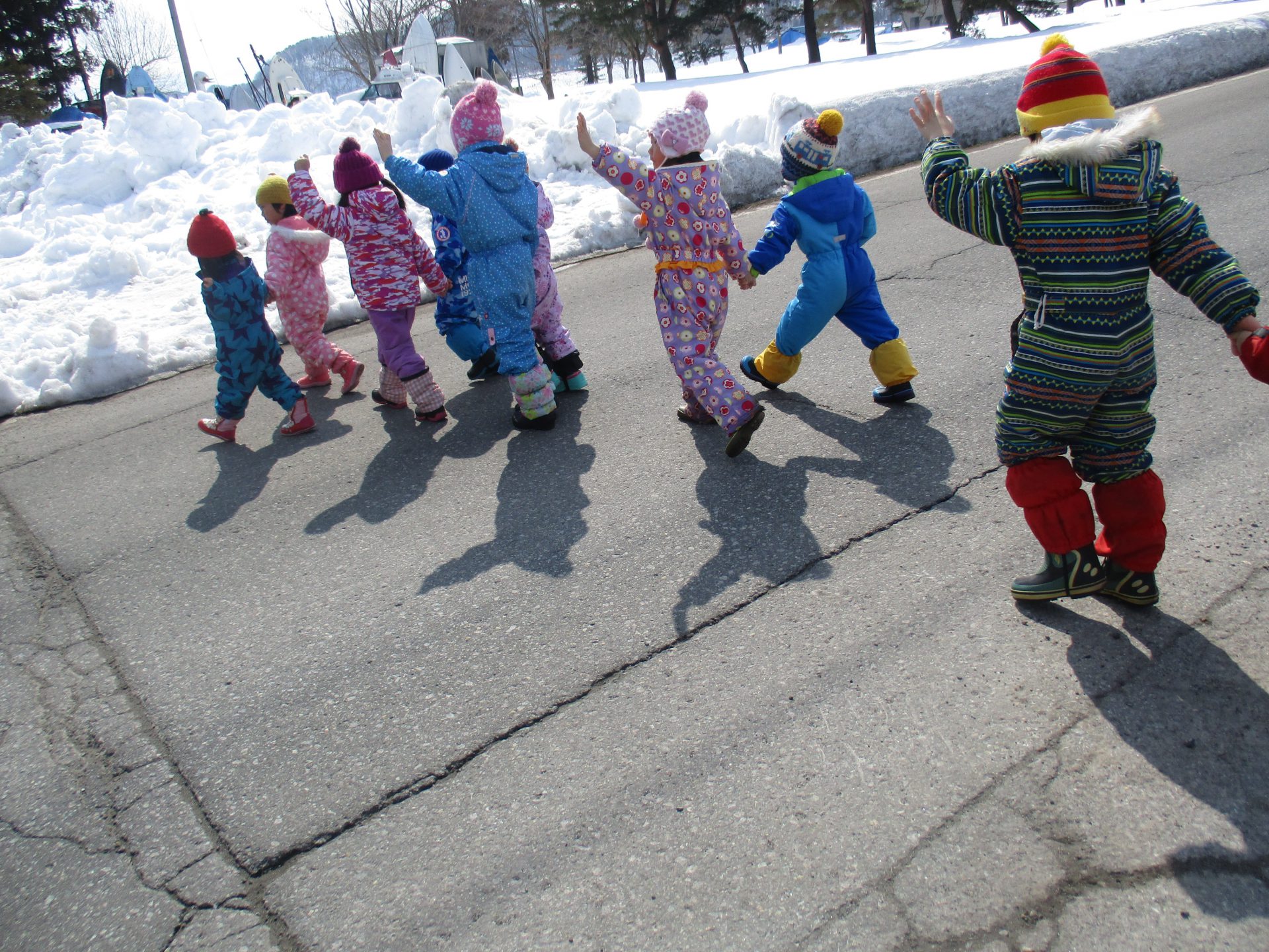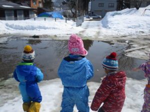 実際にふきのとうや雪解けの水たまりを見つけるなかで春を感じました。その中で「春になったら、年長さんいないんだ」「寂しいな」と卒園を意識する姿も見られました。「大丈夫だよ。小学生になったら、また会えるから」と5歳児さん。あたたかなお日さまの光がお友だちを優しく見守っていました。