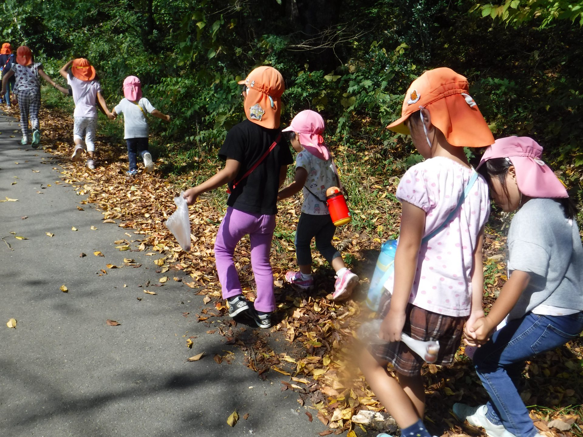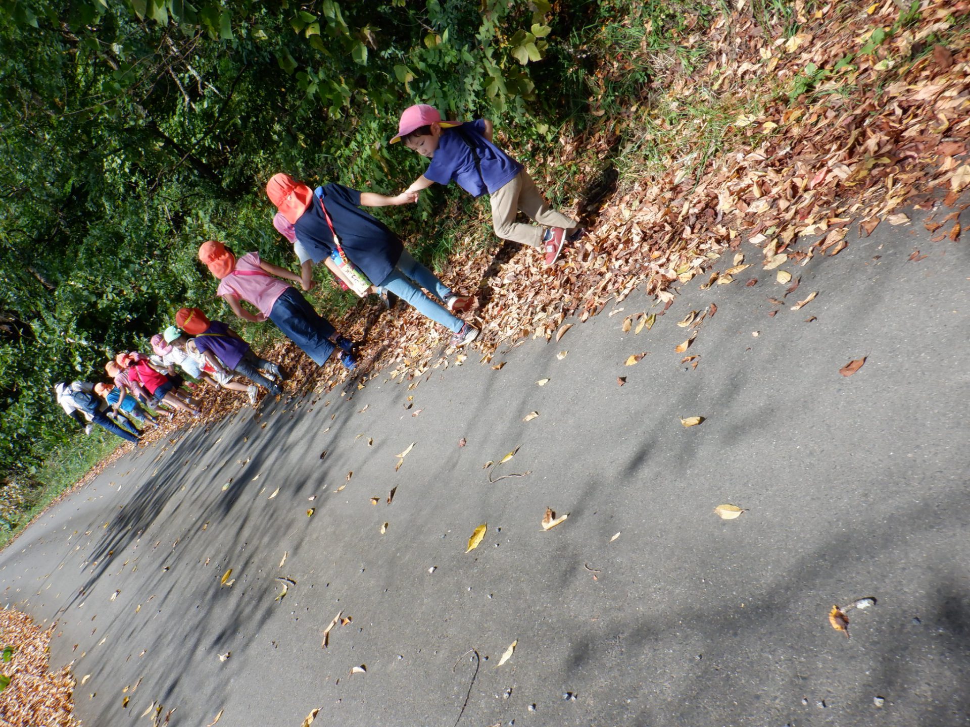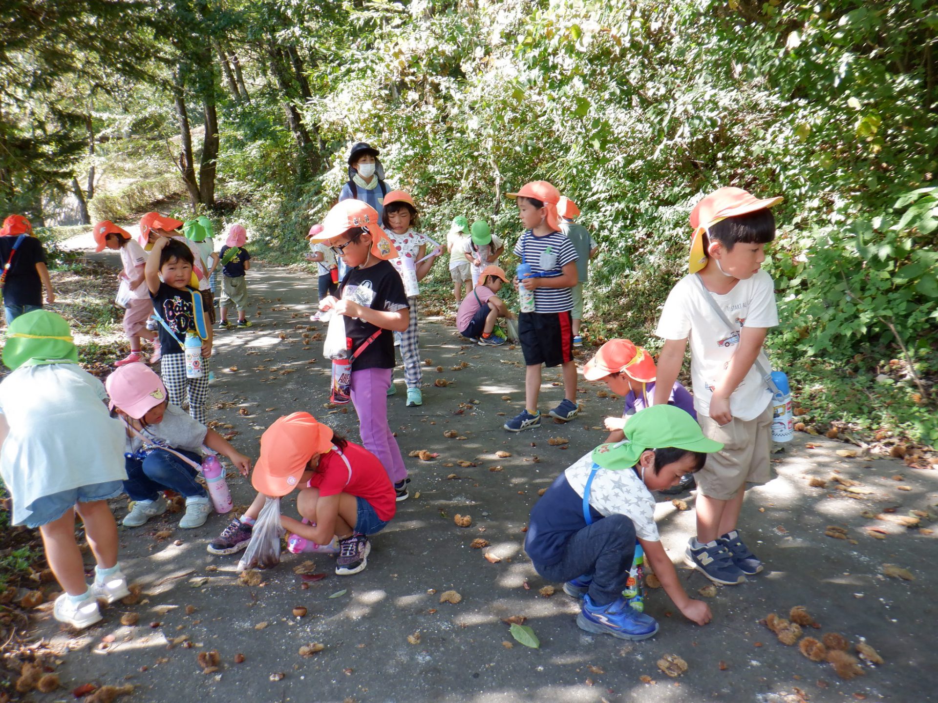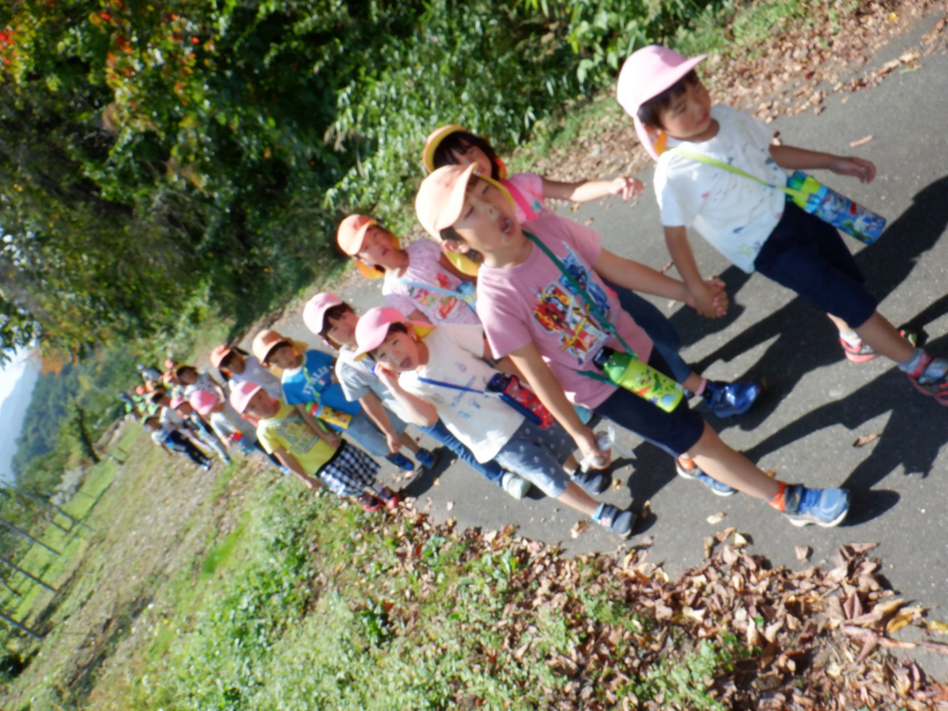 「動物園へ行こう」とういう目的でしたが、途中栗が落ちているところで立ち止まり栗を拾ったり、まわりの木々を見たり自然に触れ、ゆっくり歩くことでいろいろな発見、異年齢の関わり、互いを意識しようとする姿が見られ、楽しい時間となりました。