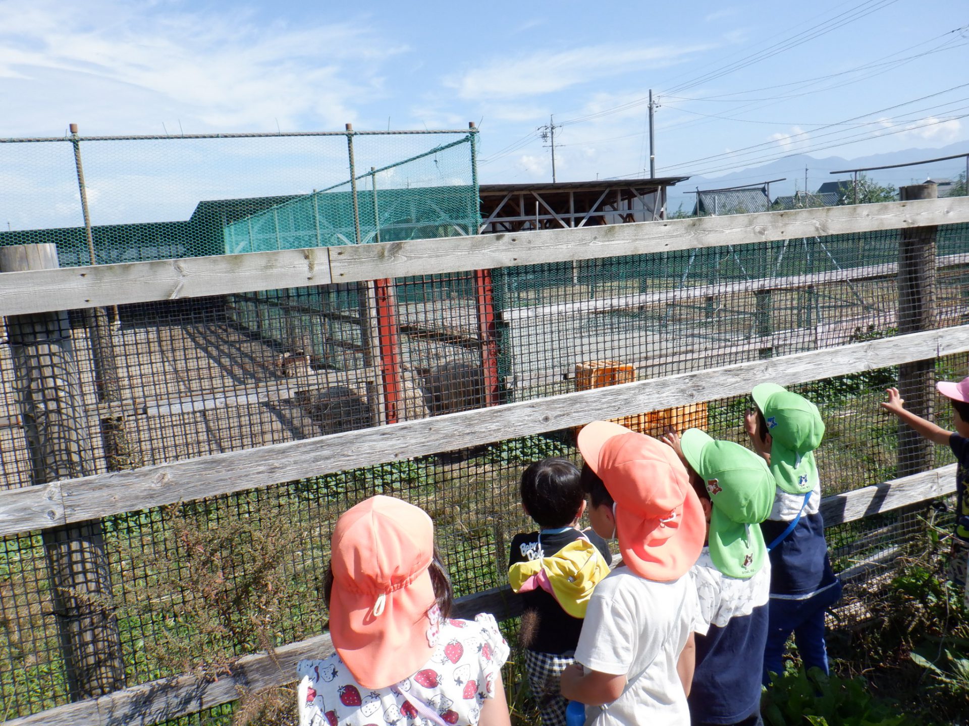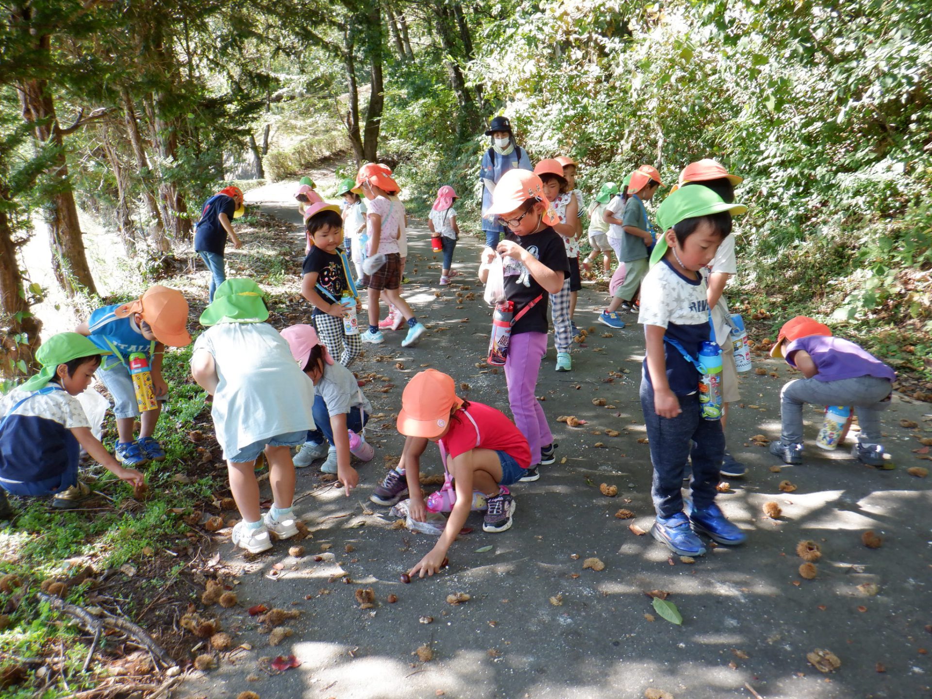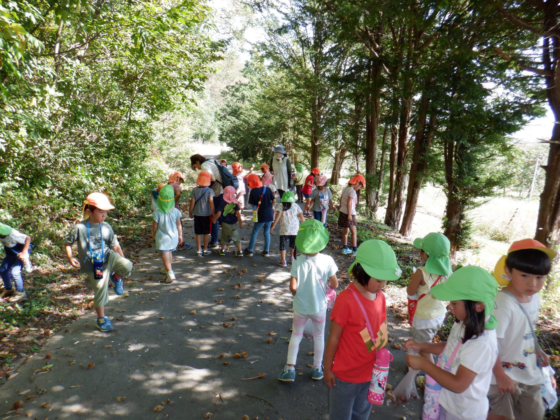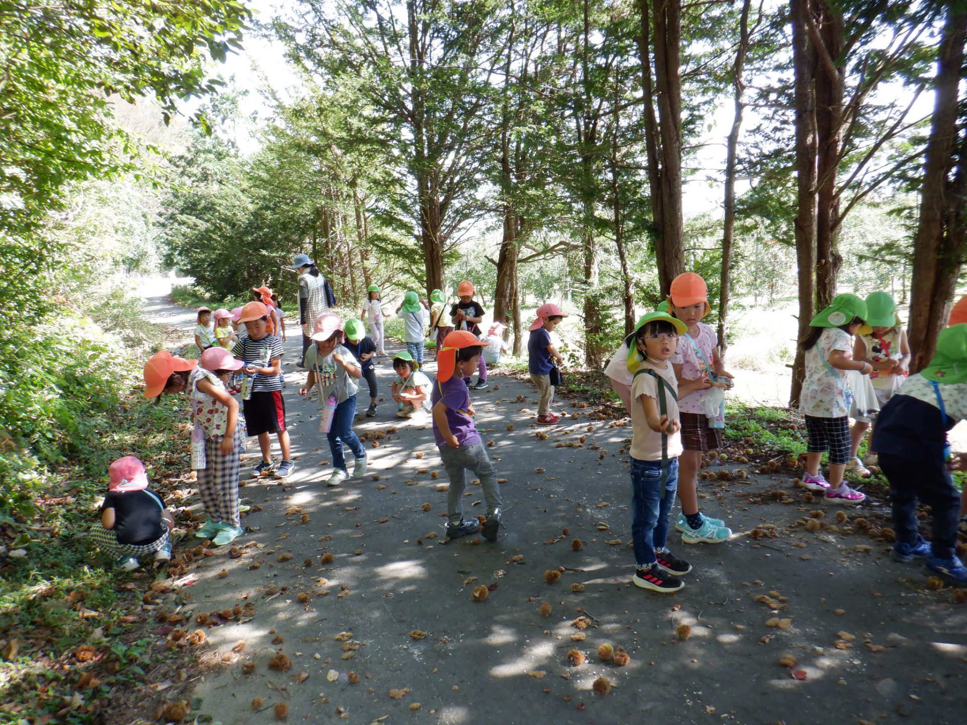 「動物園へ行こう」とういう目的でしたが、途中栗が落ちているところで立ち止まり栗を拾ったり、まわりの木々を見たり自然に触れ、ゆっくり歩くことでいろいろな発見、異年齢の関わり、互いを意識しようとする姿が見られ、楽しい時間となりました。