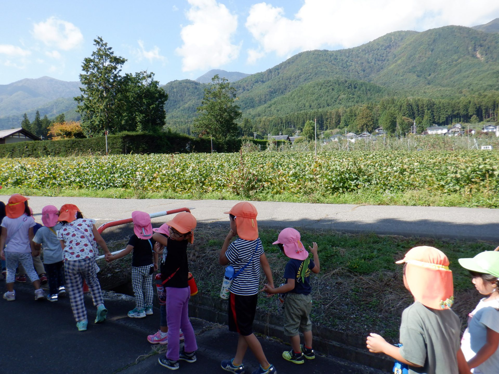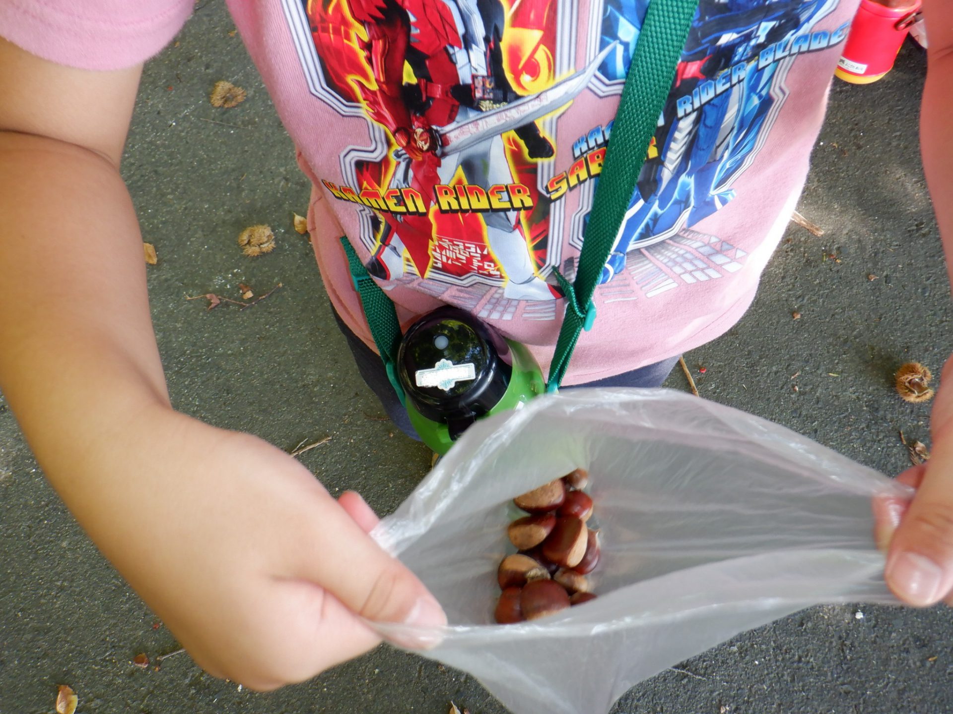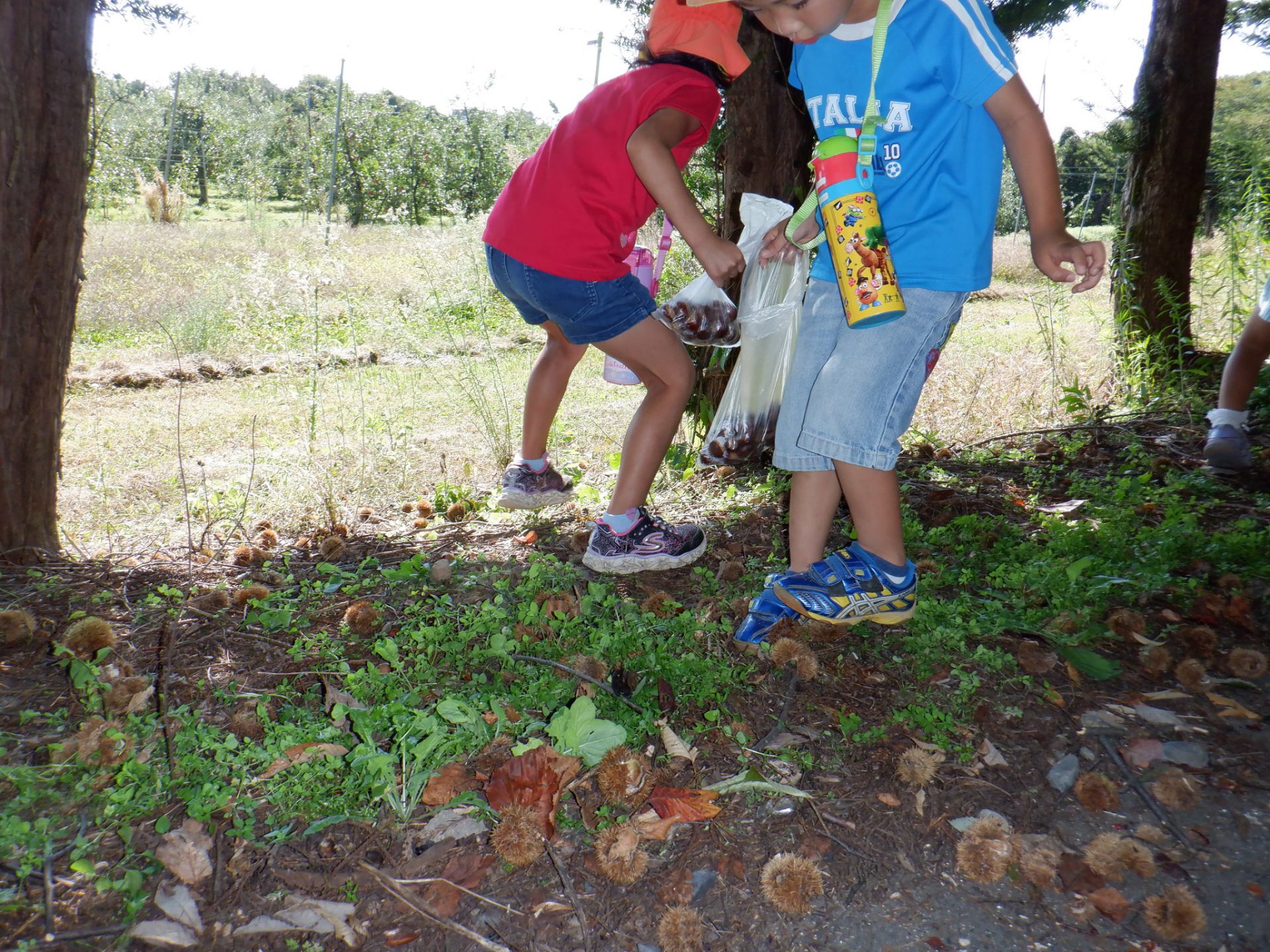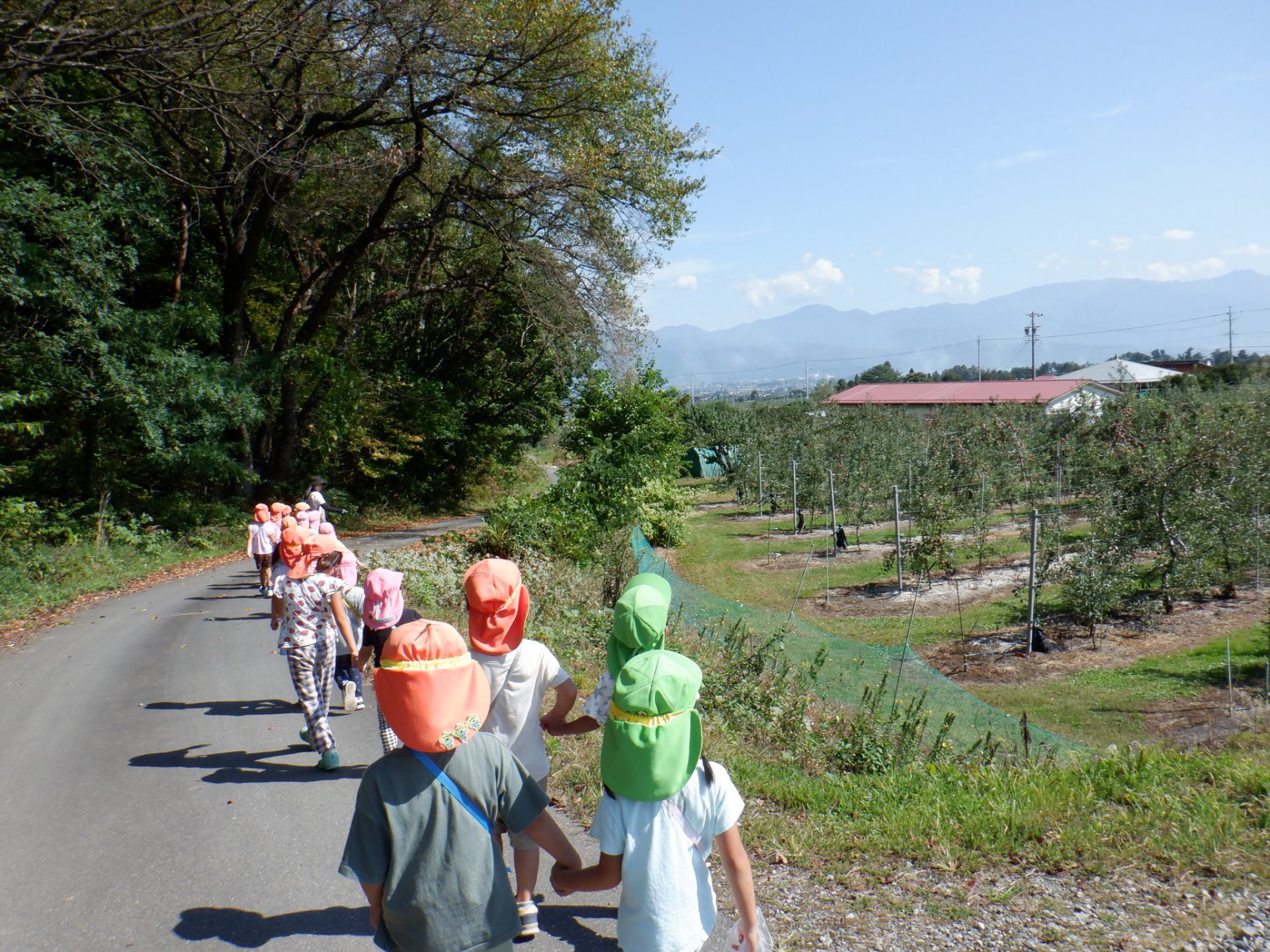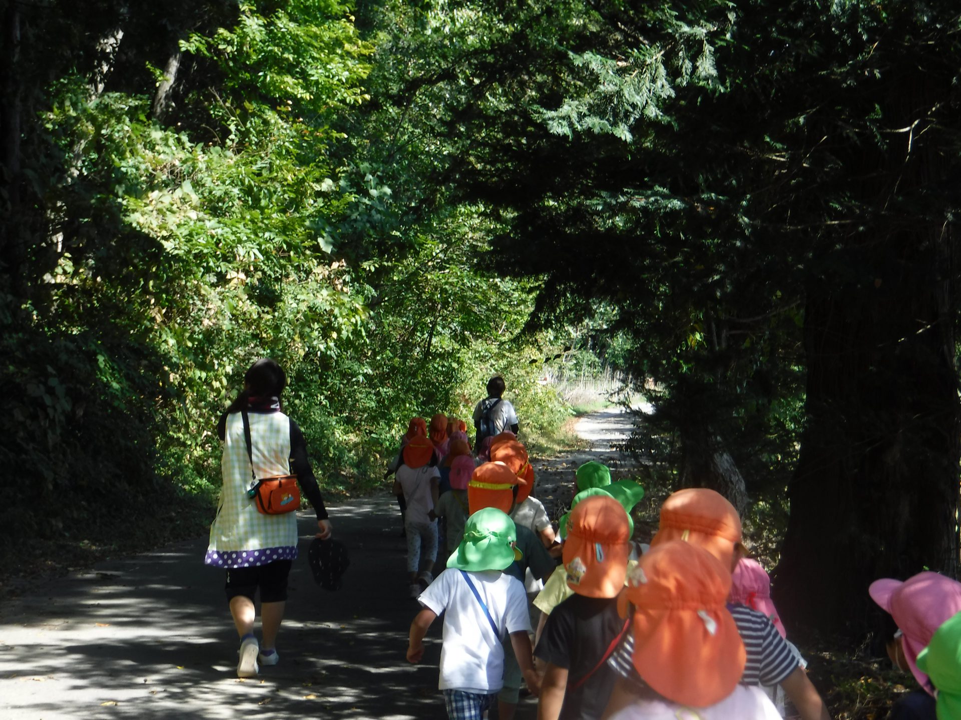「動物園へ行こう」とういう目的でしたが、途中栗が落ちているところで立ち止まり栗を拾ったり、まわりの木々を見たり自然に触れ、ゆっくり歩くことでいろいろな発見、異年齢の関わり、互いを意識しようとする姿が見られ、楽しい時間となりました。