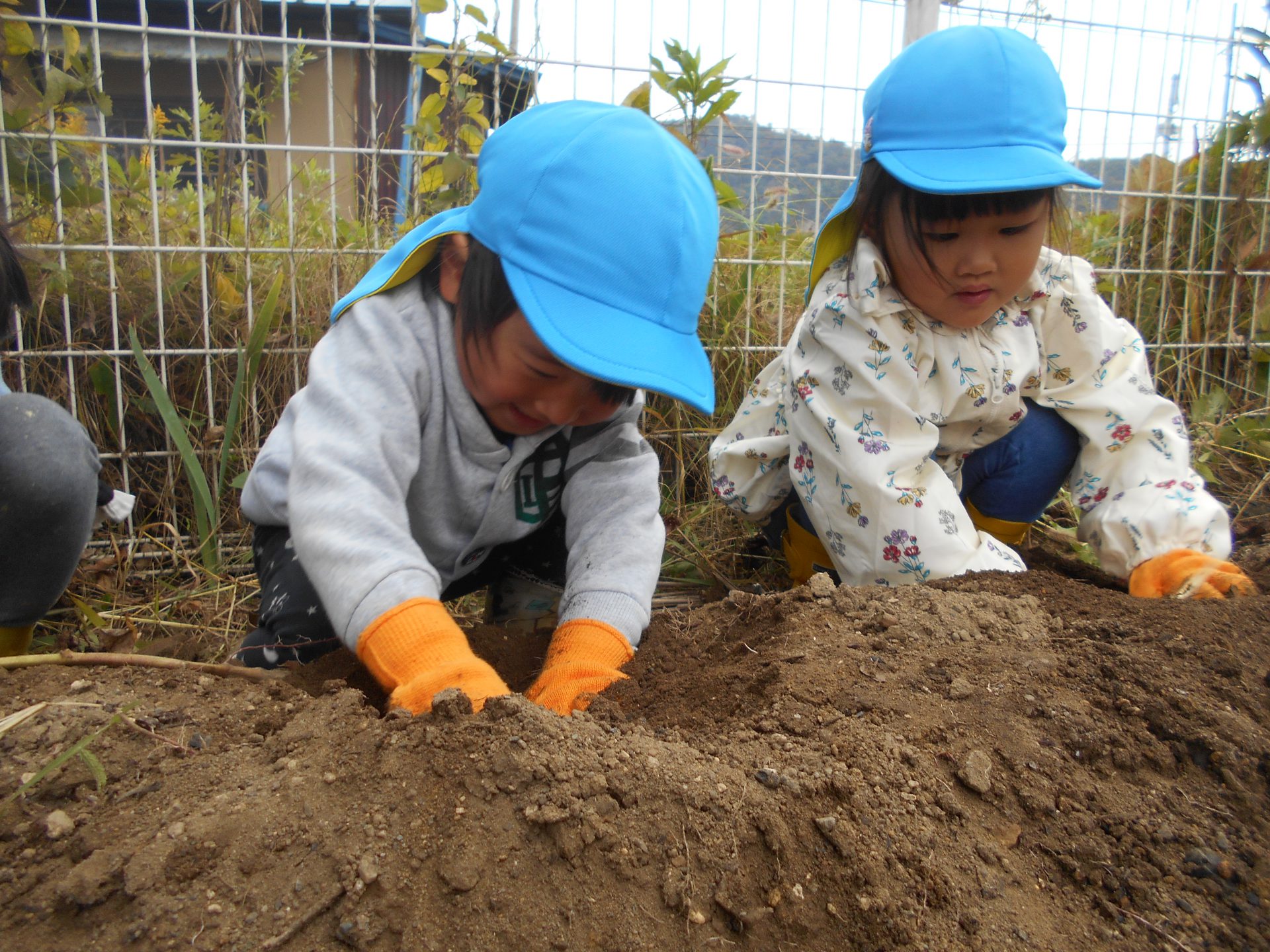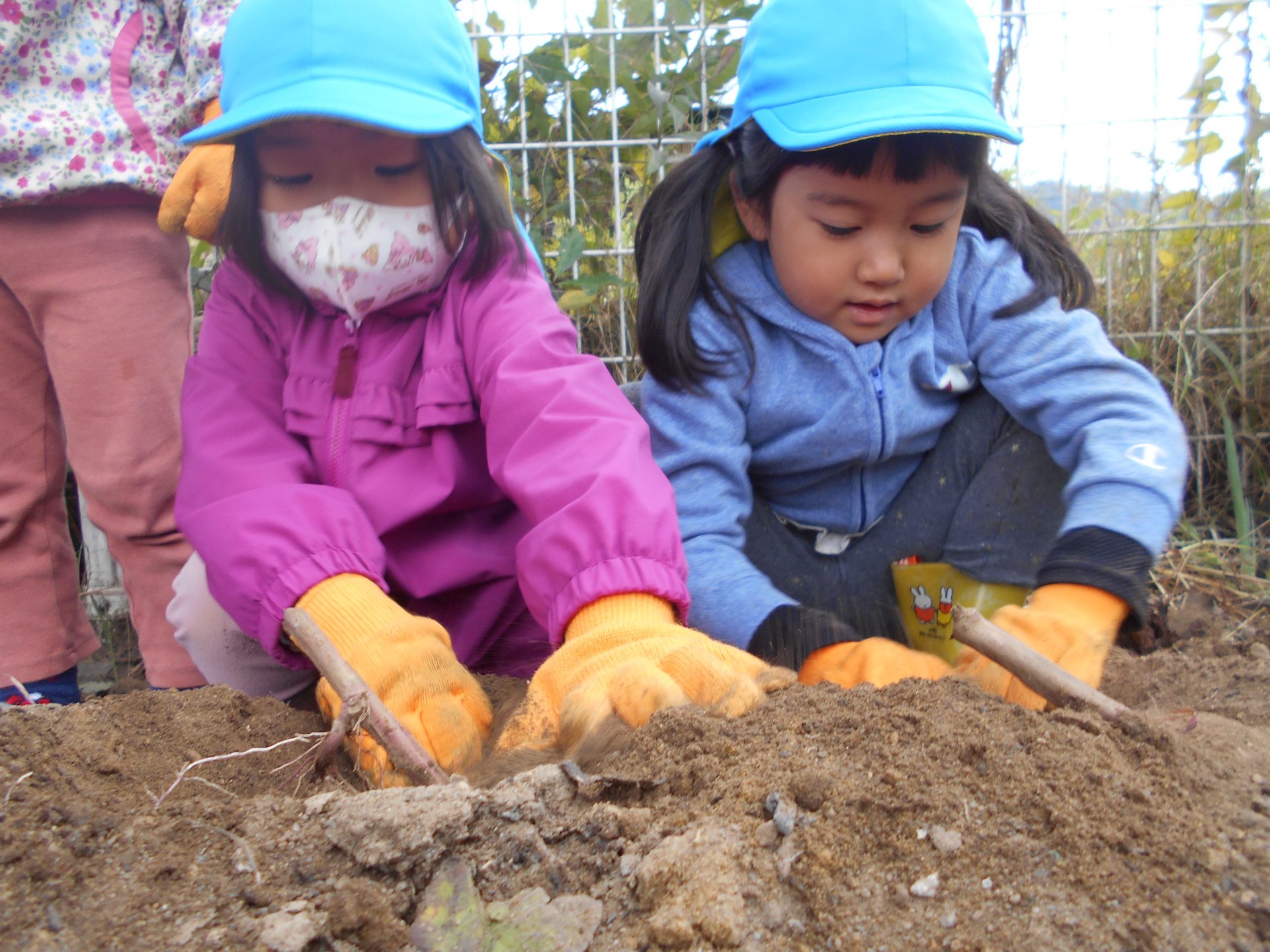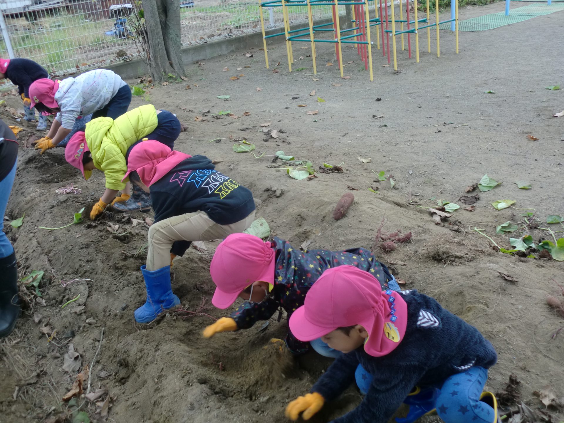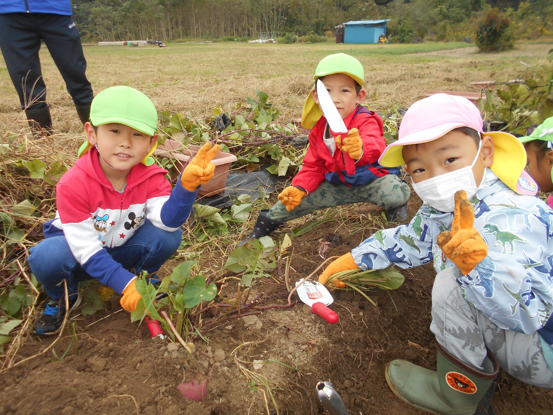 また、年上児の姿を見て年下児も”やってみたい!”と挑戦したり、さりげなく手伝いに来る年上児がいたりと、異年齢での素敵な関わりの機会もでき良かったです。学年別でなく、園全体で芋堀が楽しめ様々な経験ができ良かったなと思います。