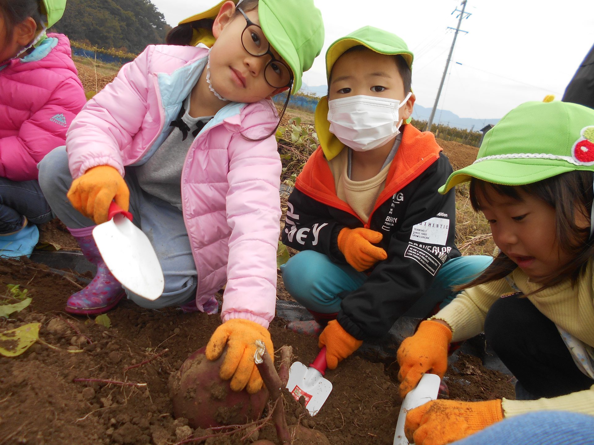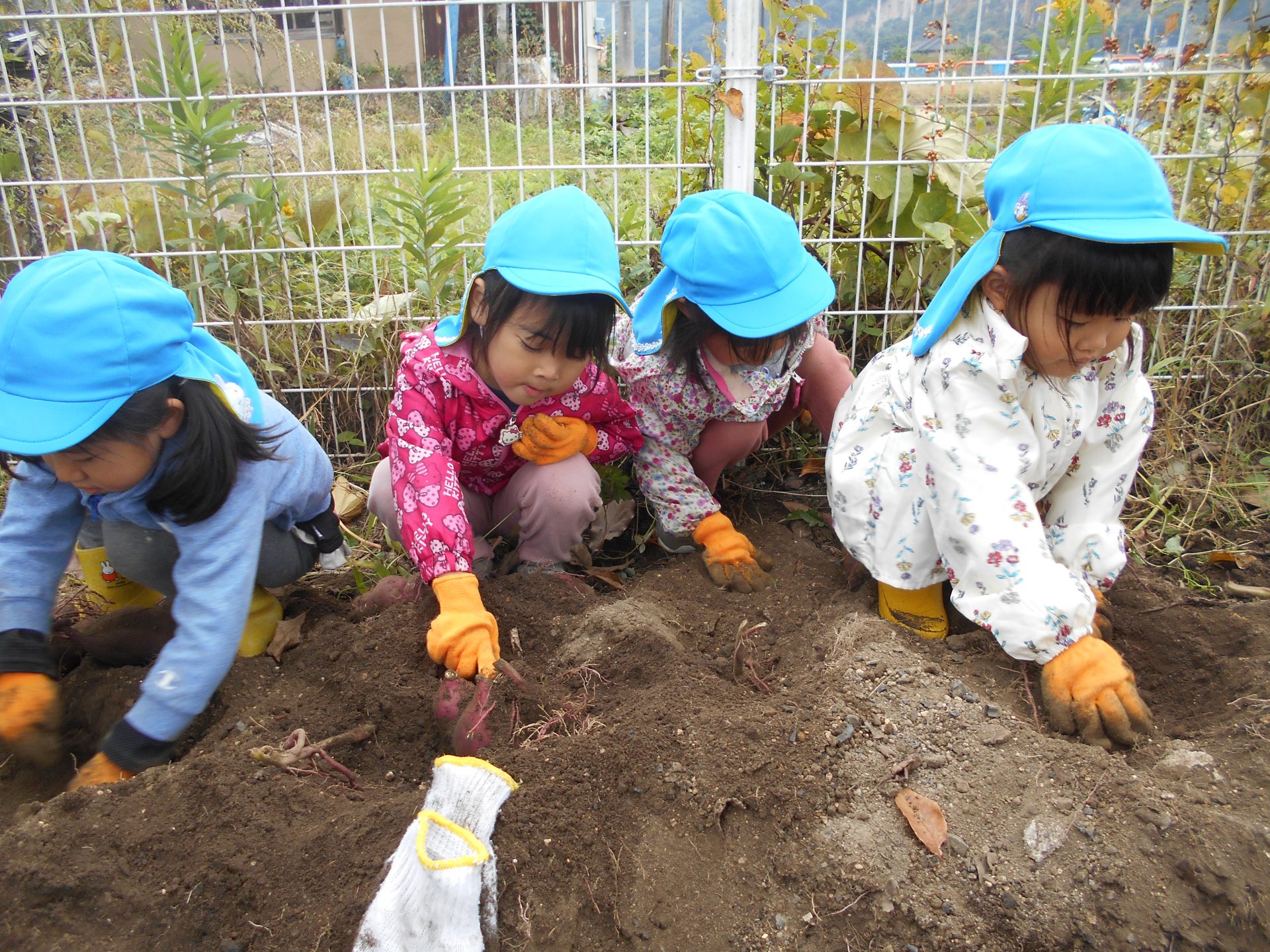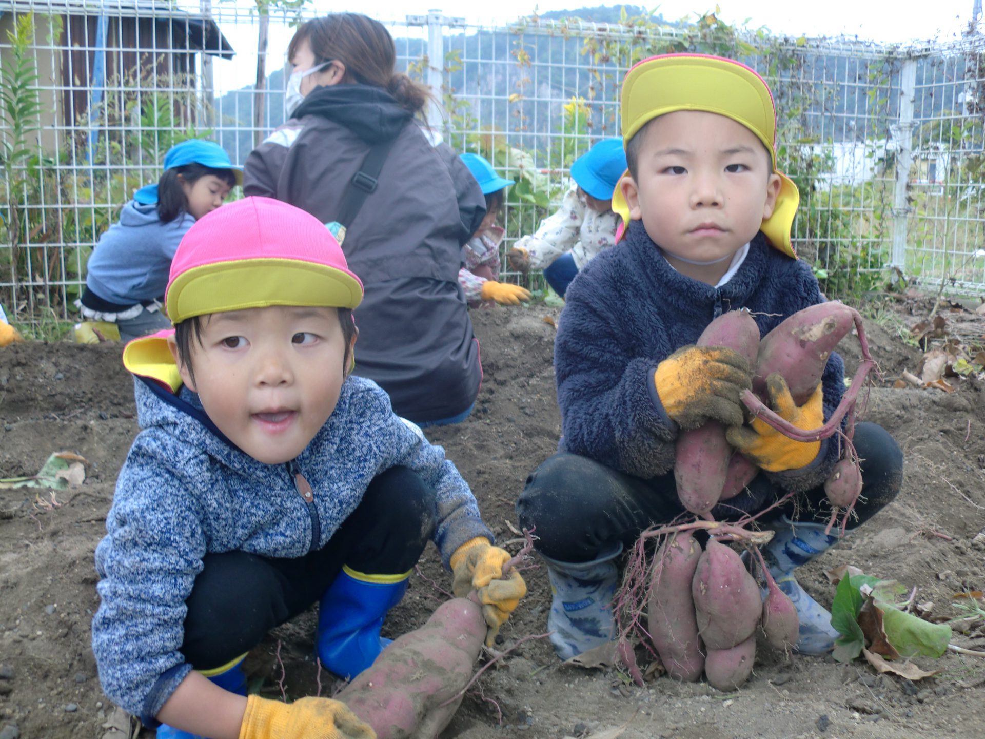 また、年上児の姿を見て年下児も”やってみたい!”と挑戦したり、さりげなく手伝いに来る年上児がいたりと、異年齢での素敵な関わりの機会もでき良かったです。学年別でなく、園全体で芋堀が楽しめ様々な経験ができ良かったなと思います。