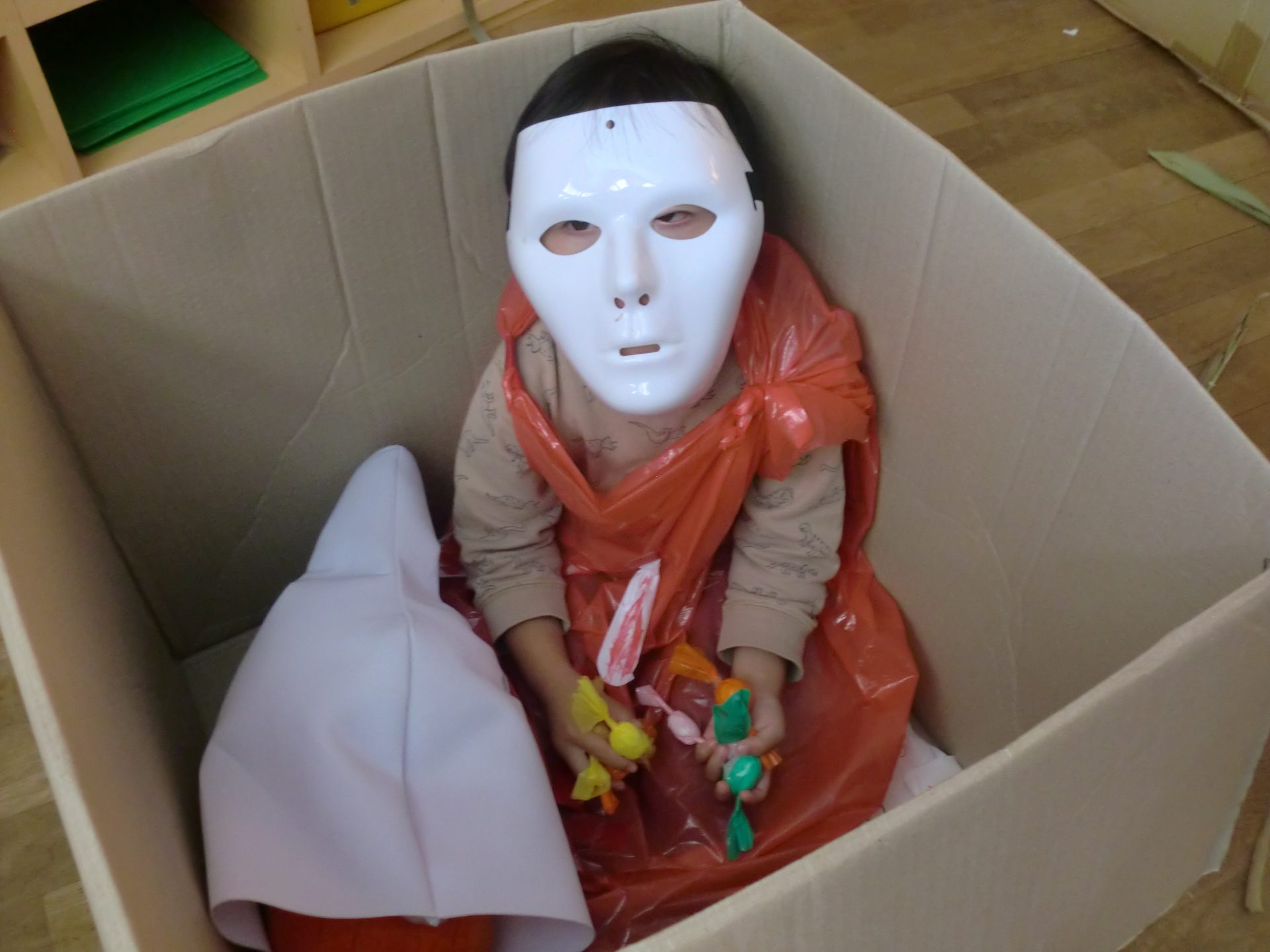 年中さんは、お化け屋敷をやろうと決めると一か月ほどかけ、準備をしていました。いよいよ開店となるととっても誇らしげな顔で、やる気満々!お化け役の子たちはお客さんが入ってくると様子をよく見てタイミングよく驚かしていました。