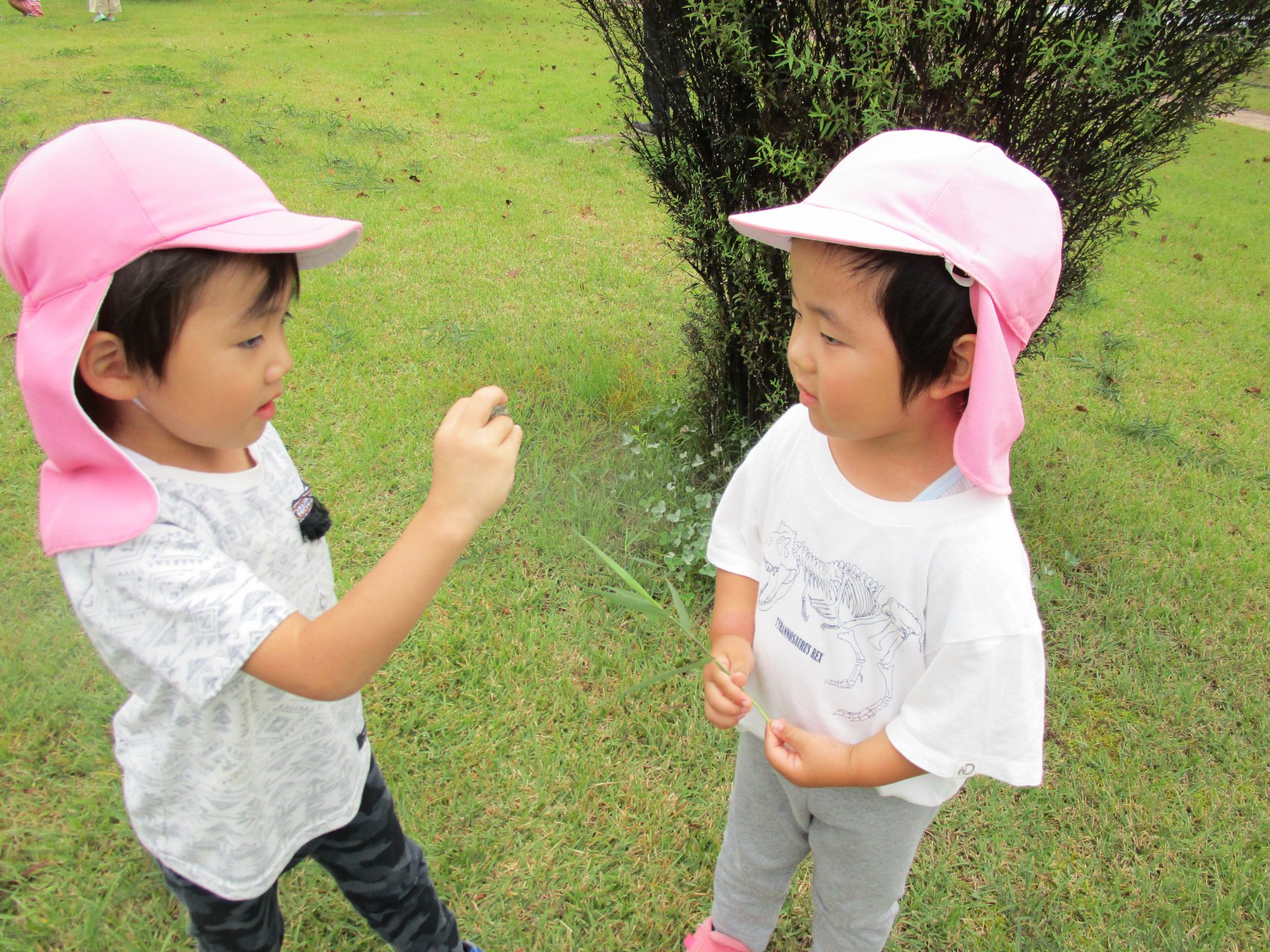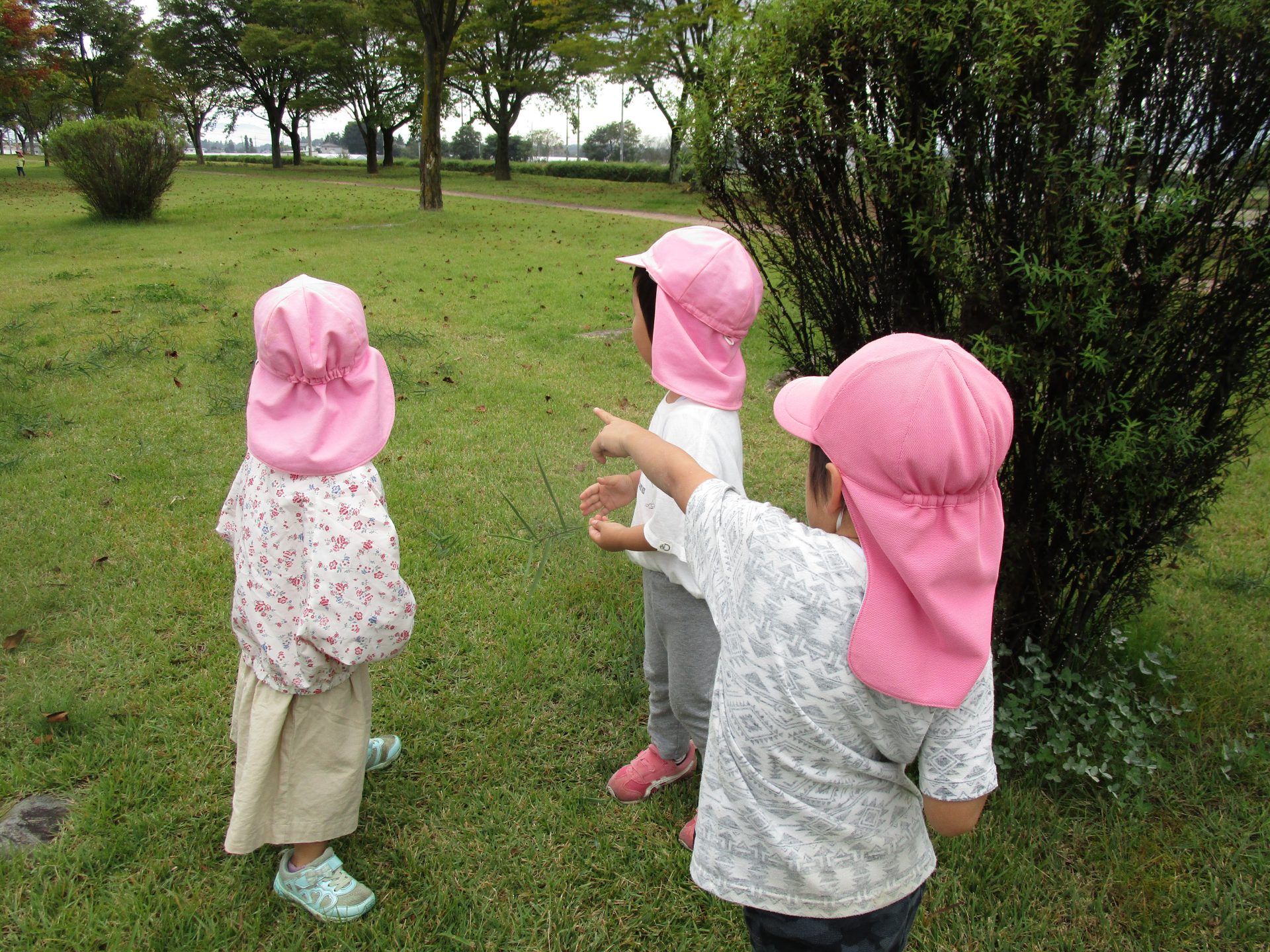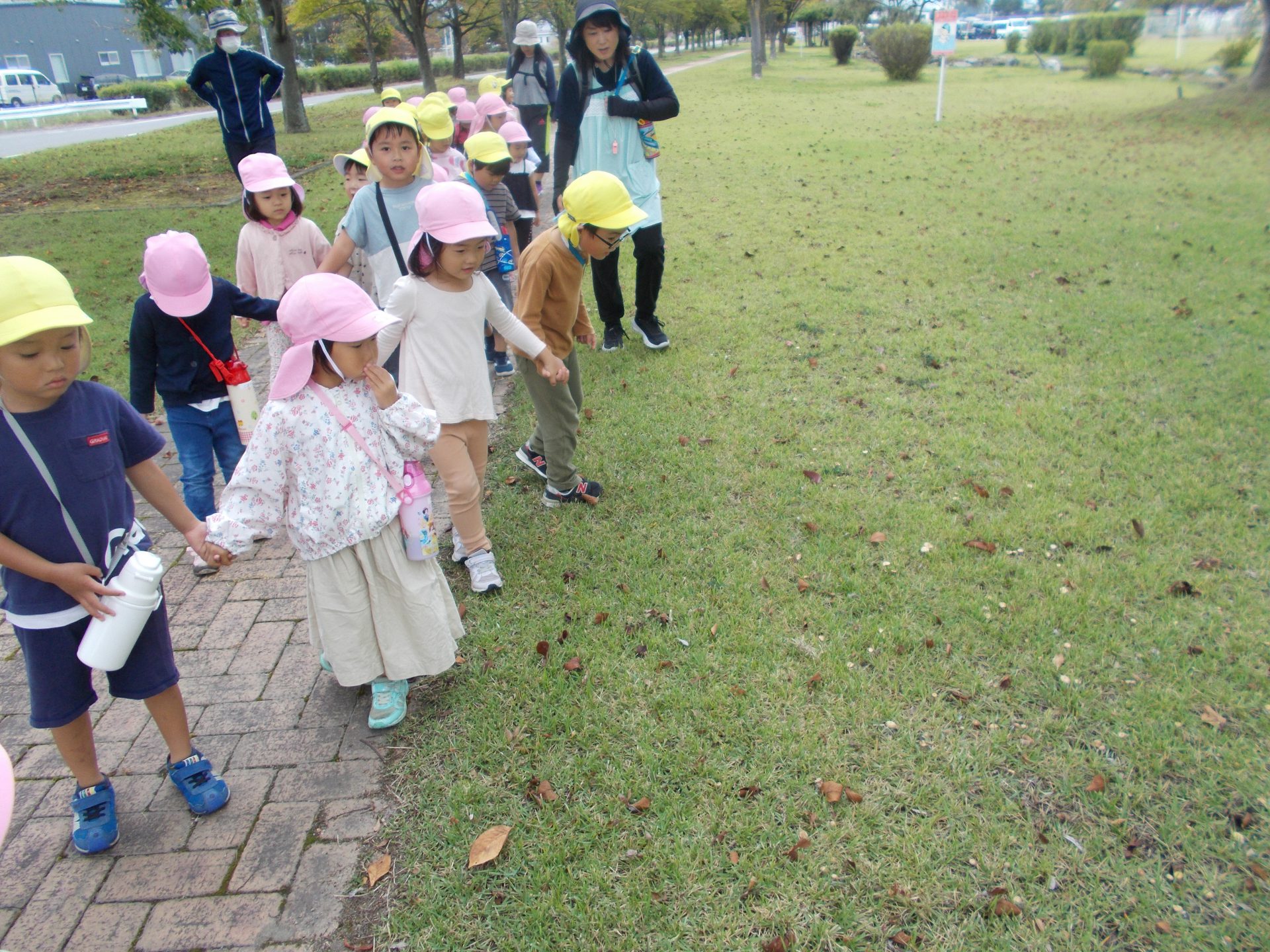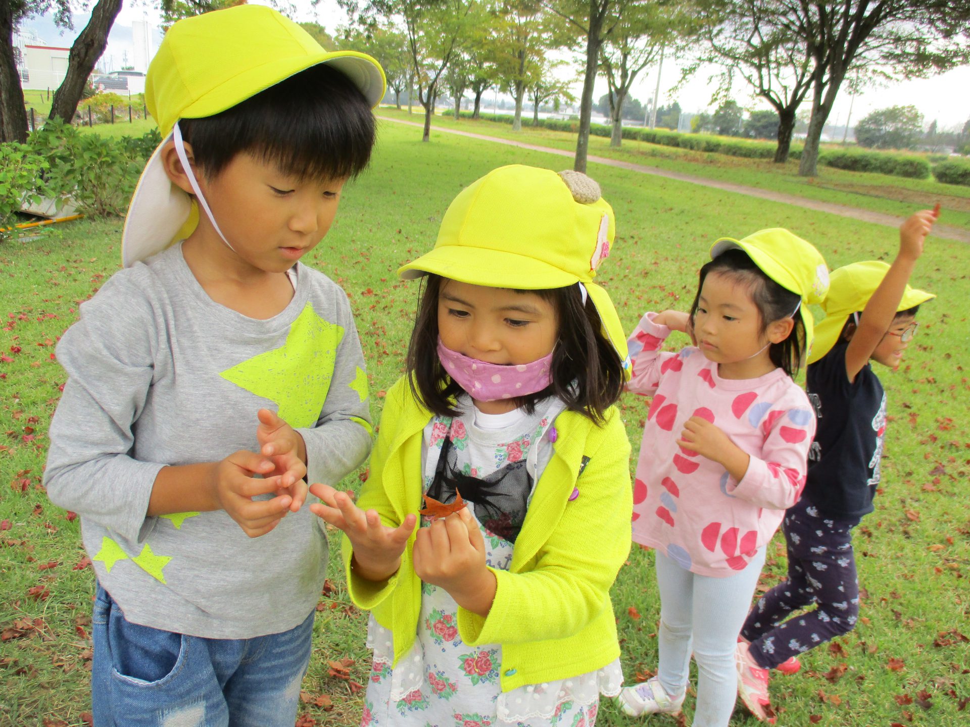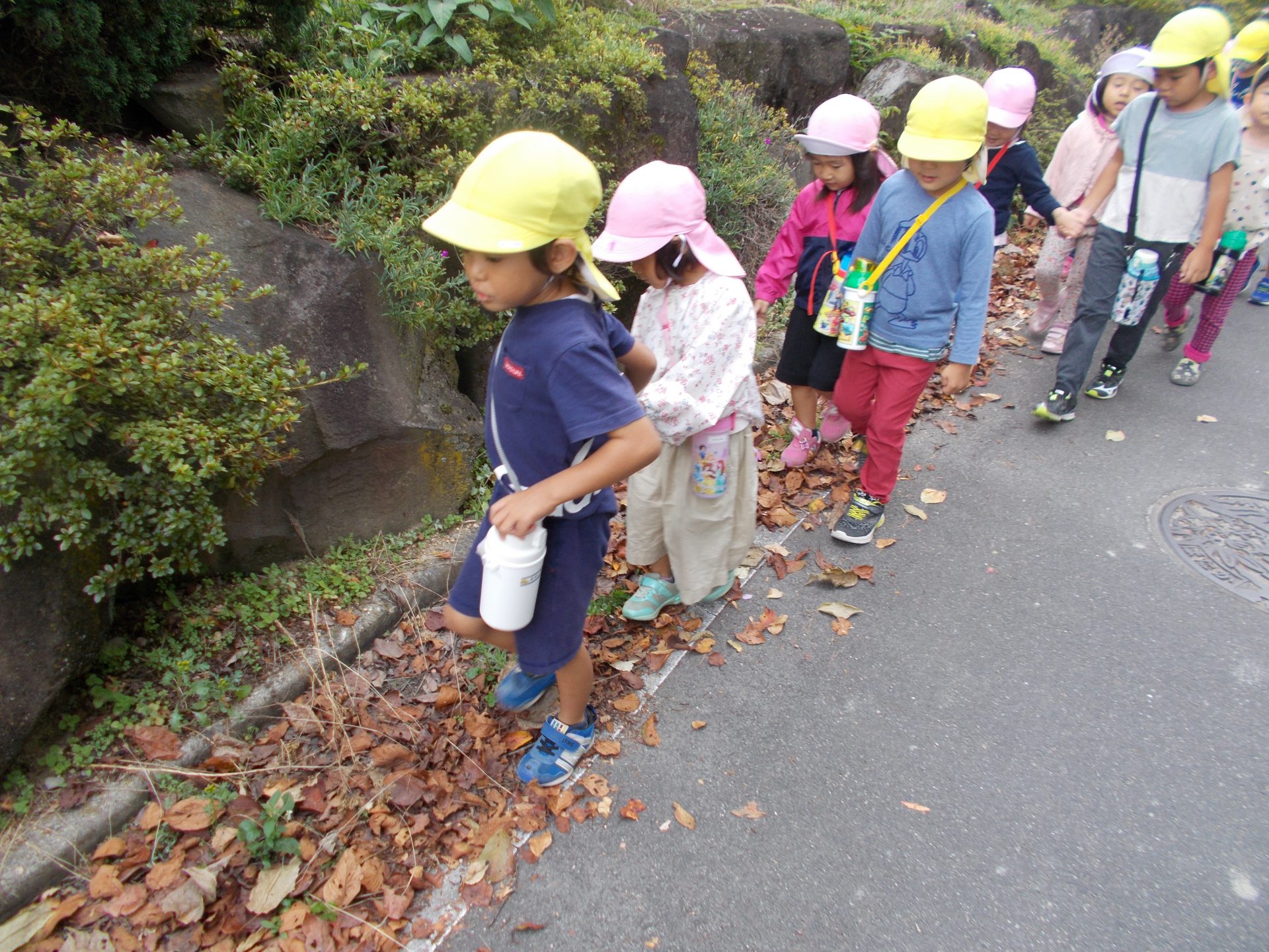 秋になり散歩の季節になりました。年少さんと年中さんと一緒に秋を探しにいきます。