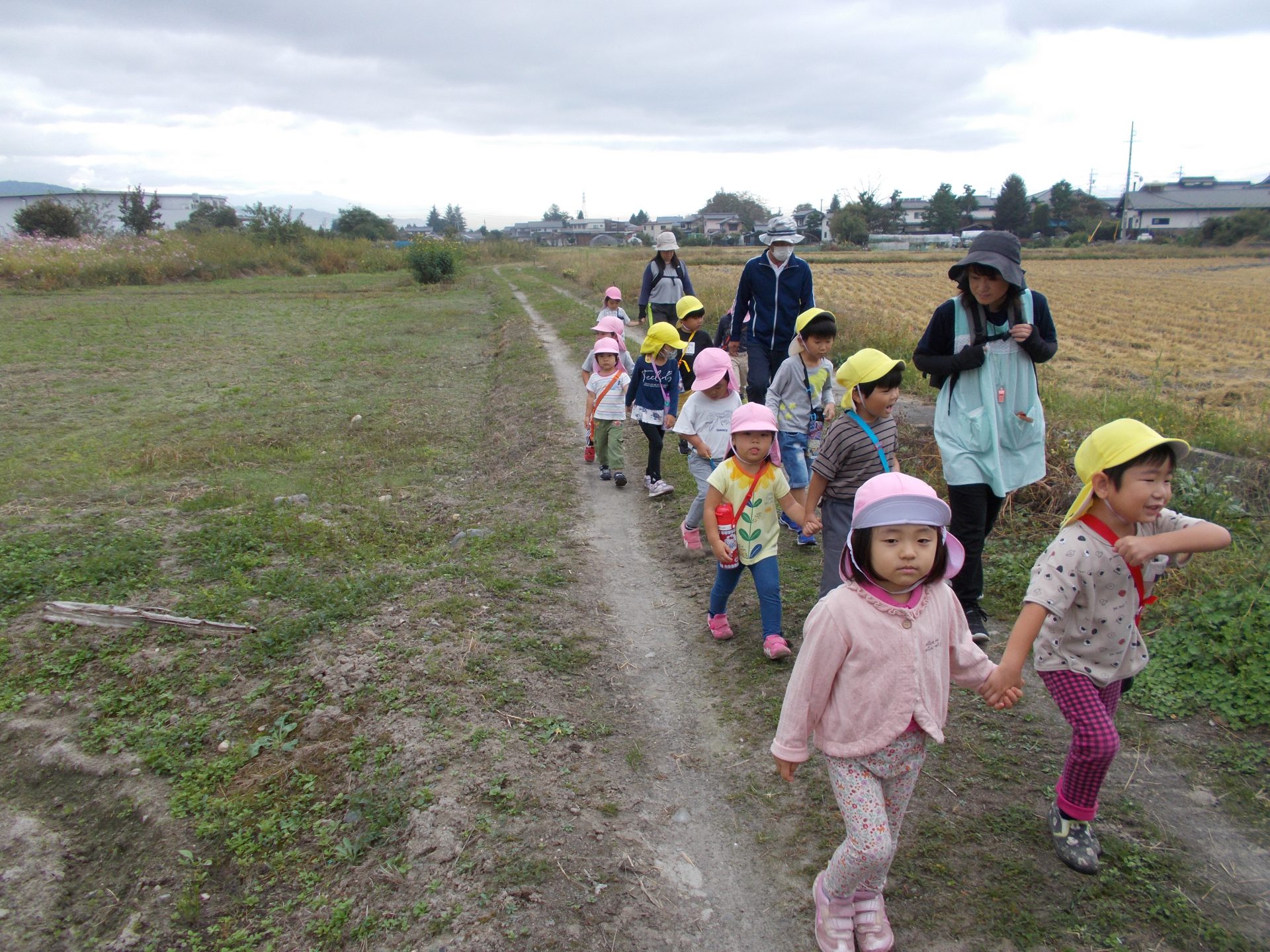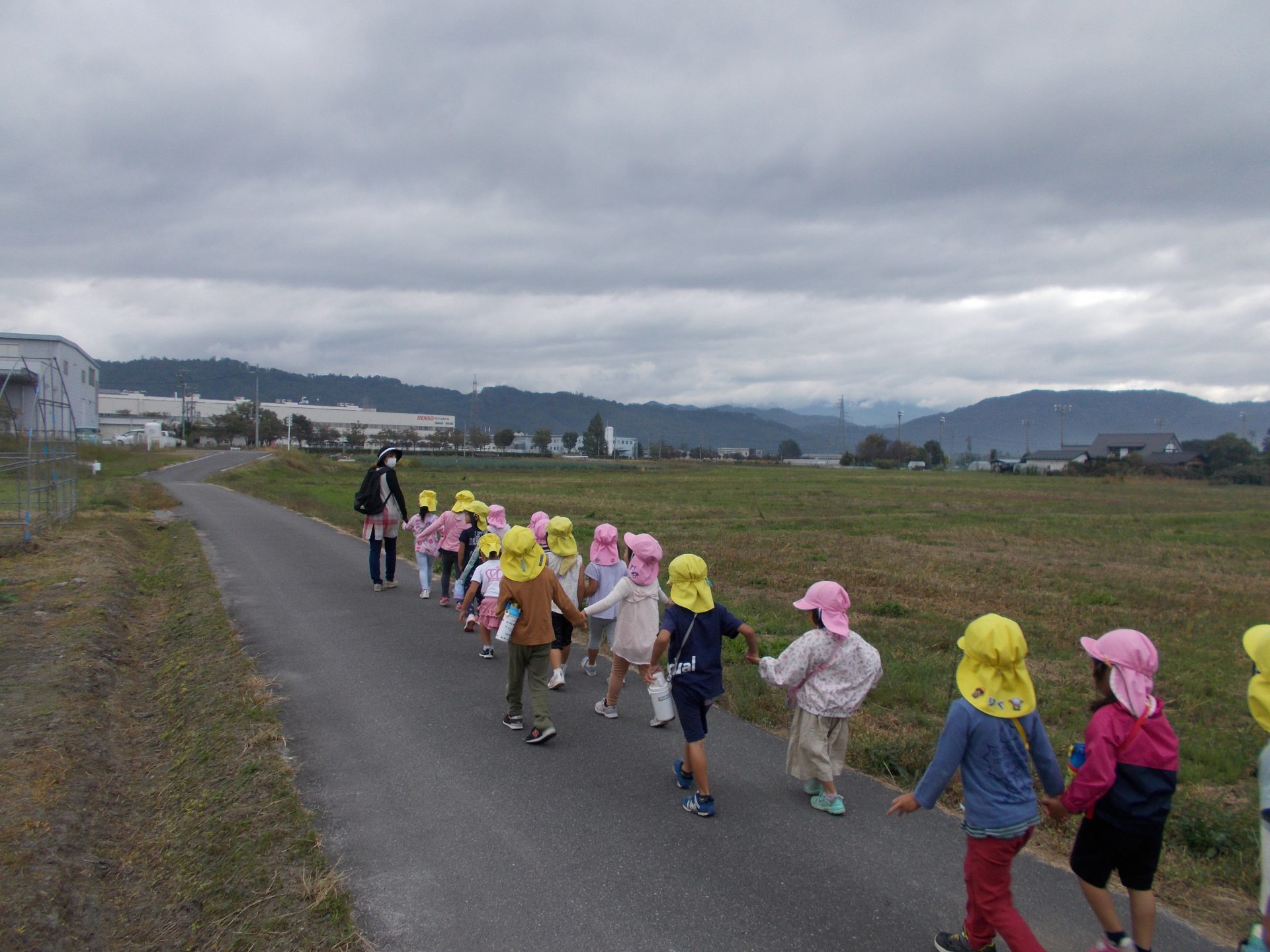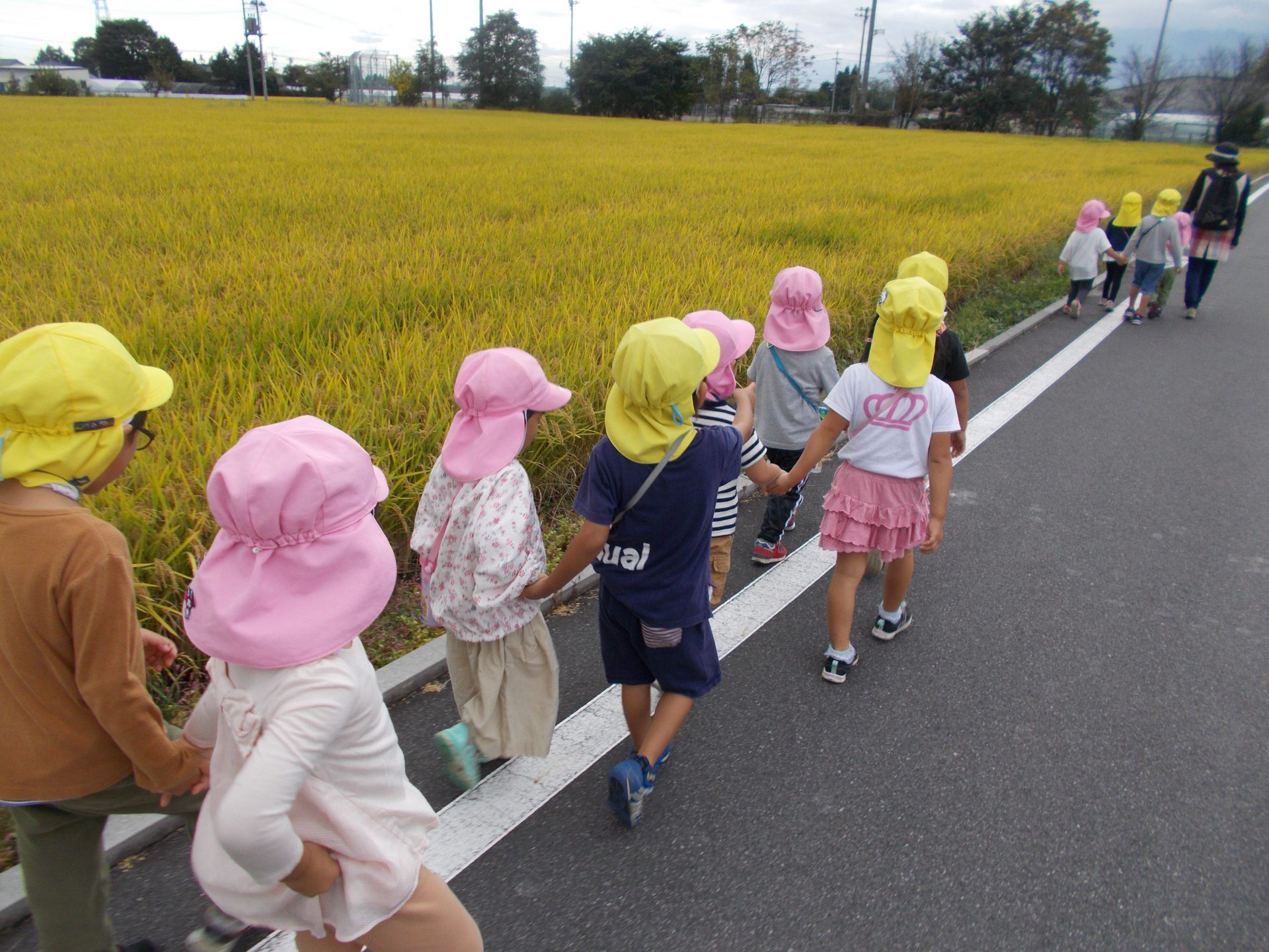 散歩中田んぼ道を歩いていると「前来た時は水があったのに今はないね」と気づく子がいました。「なんでかな?」「お米になったからだよ」など子どもたちの中で気づきや発見があり季節の移り変わりを感じることができました。