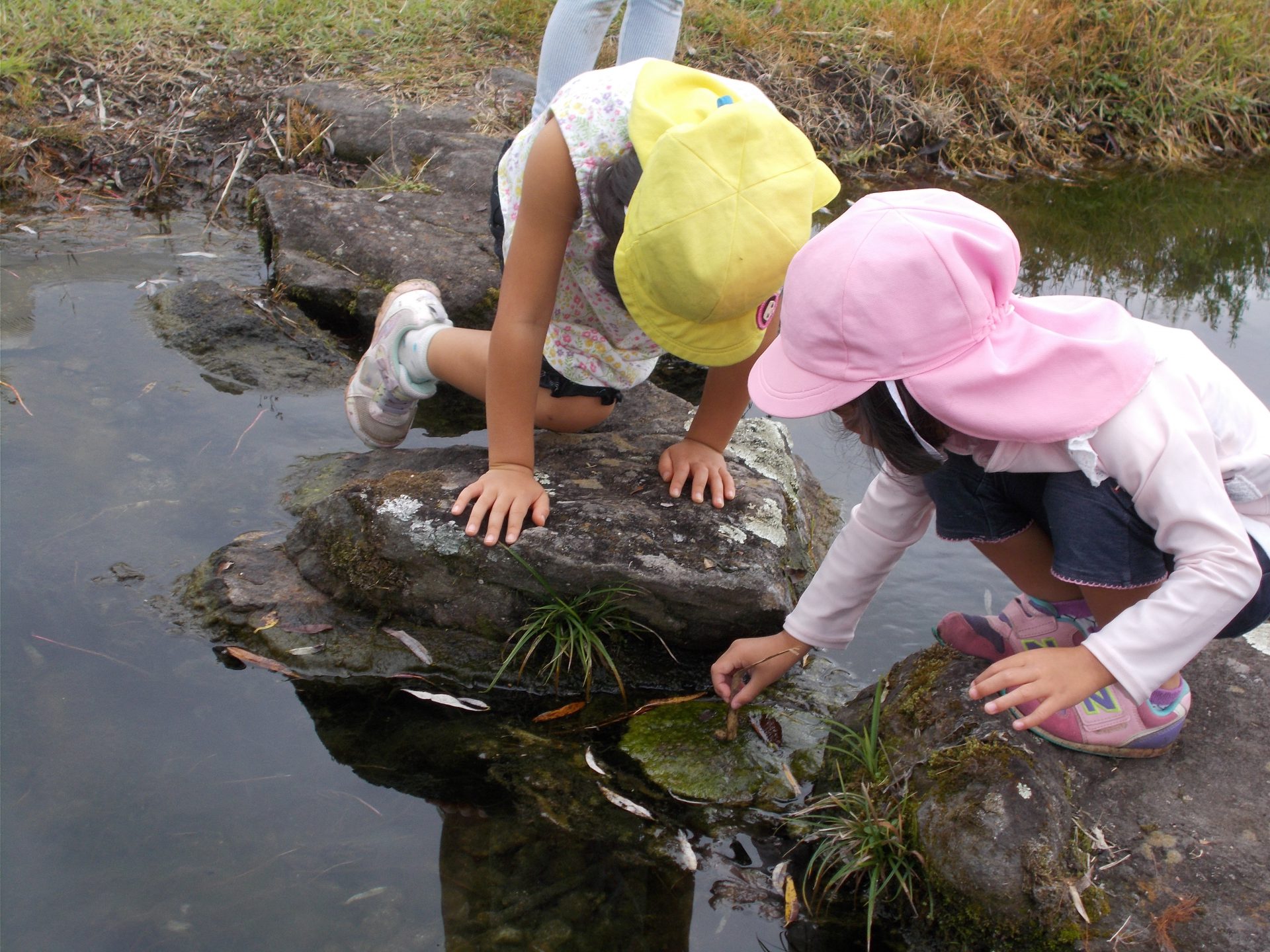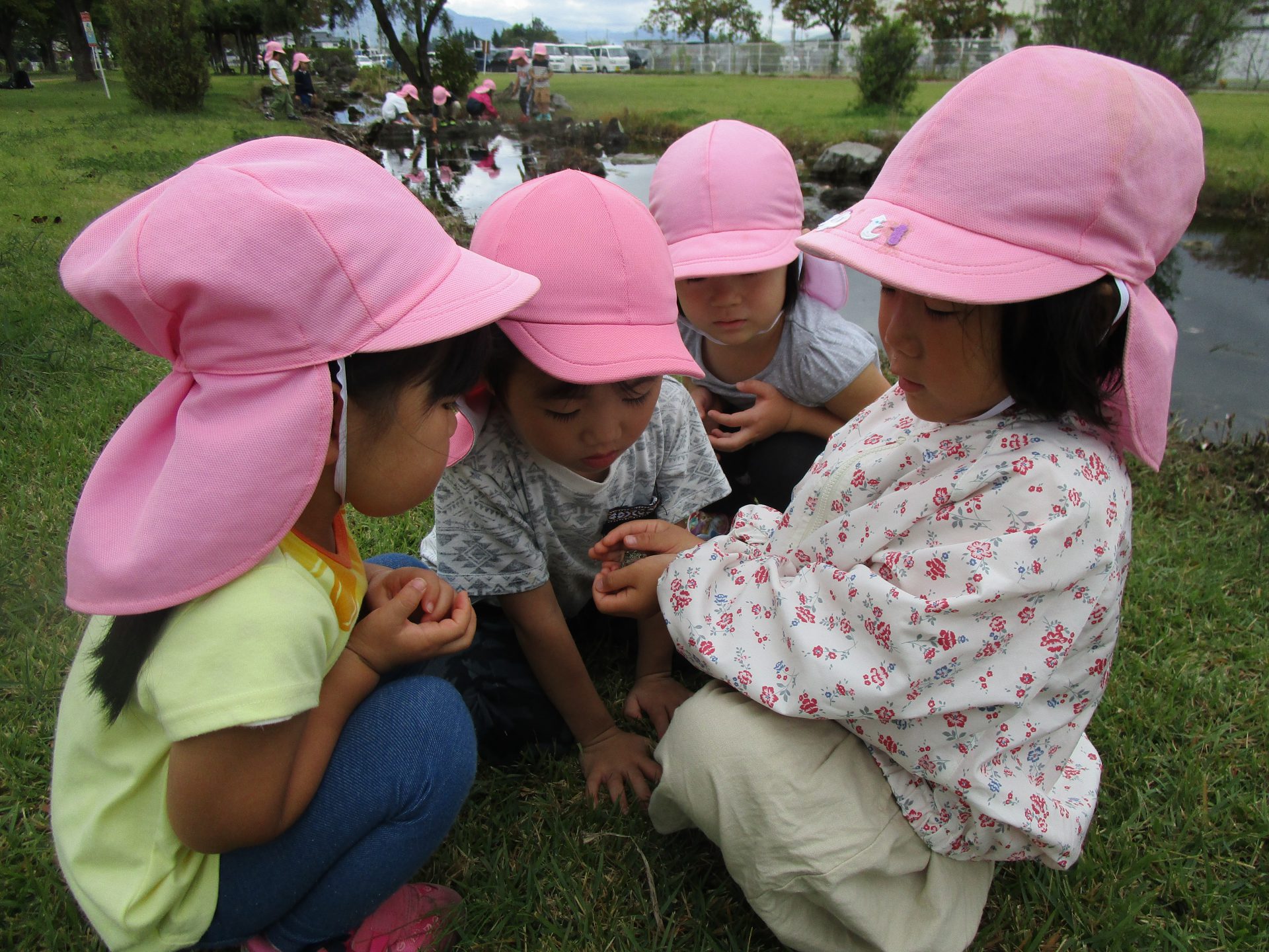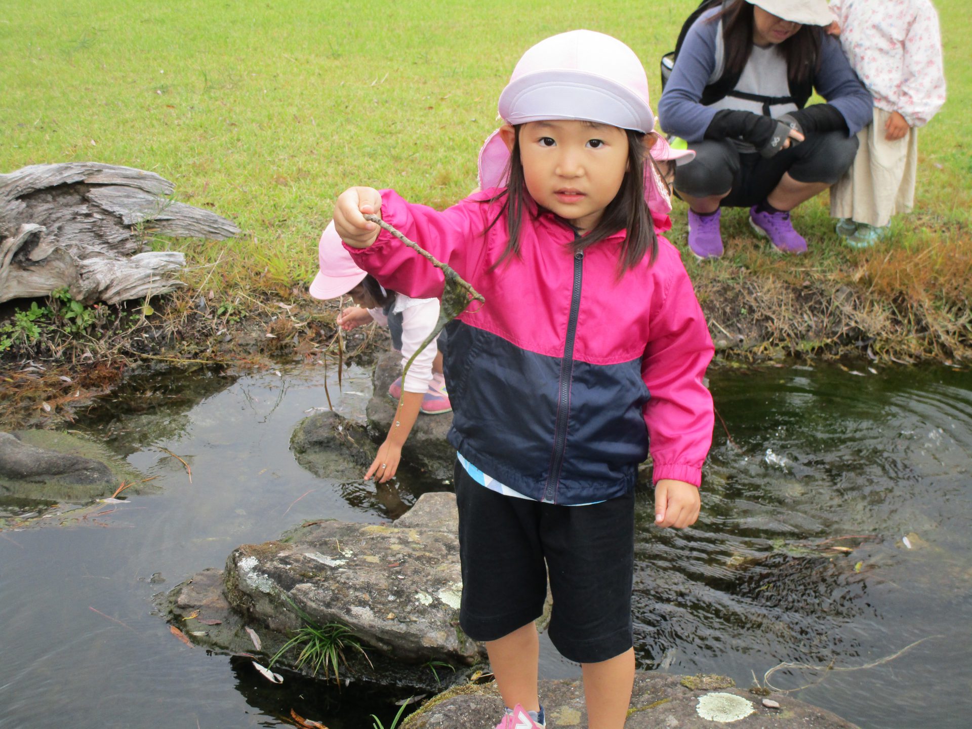 DENSOの庭は自然豊かで子どもたちはよーく観察し、虫を見つけたり、池の中の変化に気づいたりしています。子どもたちと一緒に今しか味わえない驚きや発見を共感していきたいと思います。
