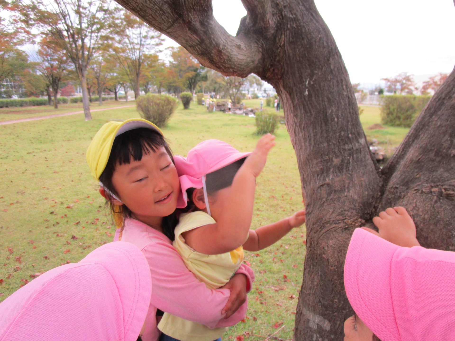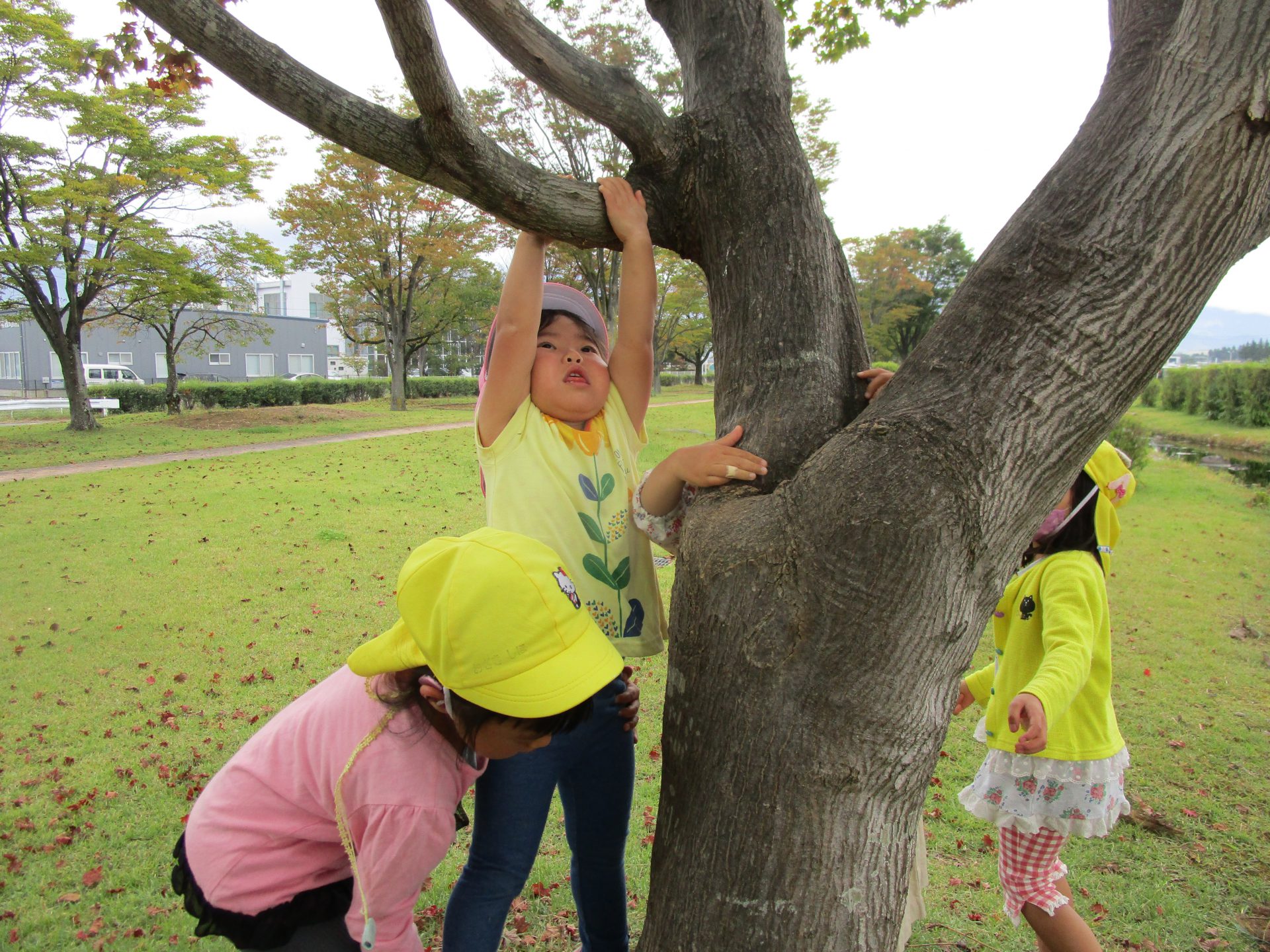 数人の女の子達が木のぼりをする年少さんを支えてくれて子ども達の中で優しく接する姿が見られました。