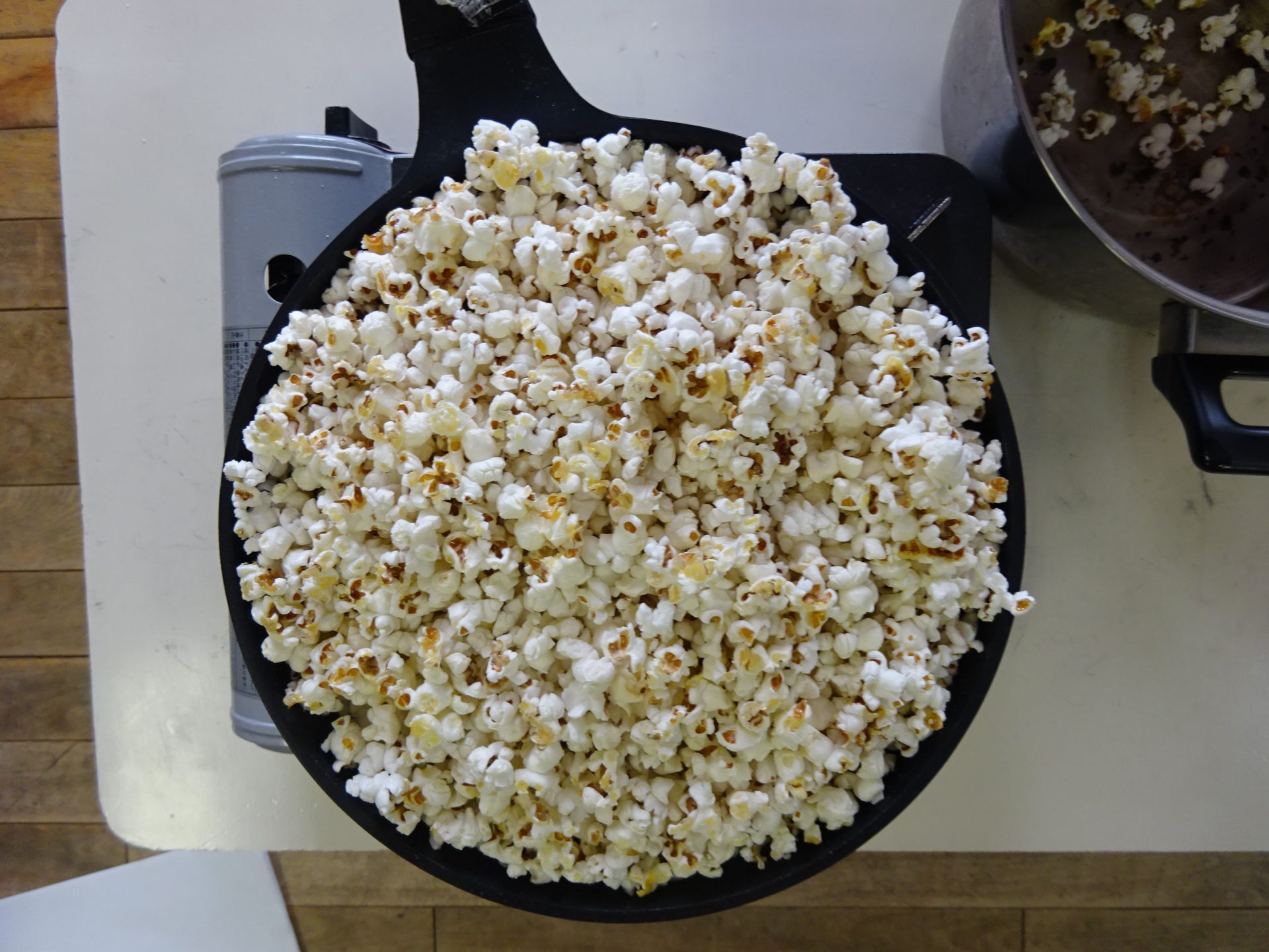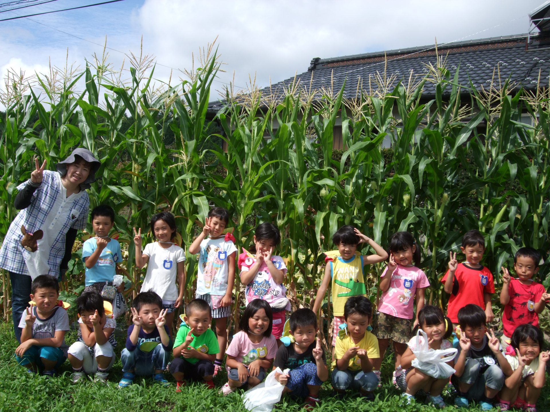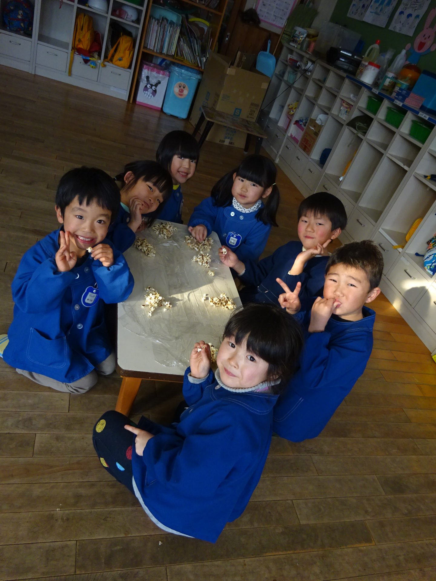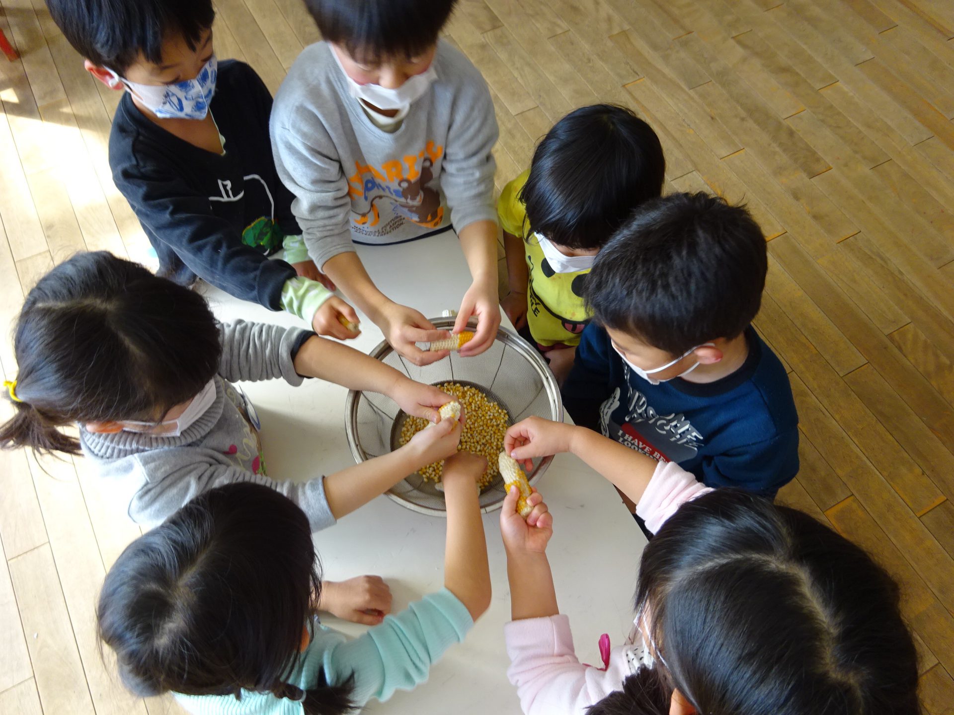 園庭で育てたトウモロコシを収穫し、自分たちで調理して手作りポップコーンを食べました!