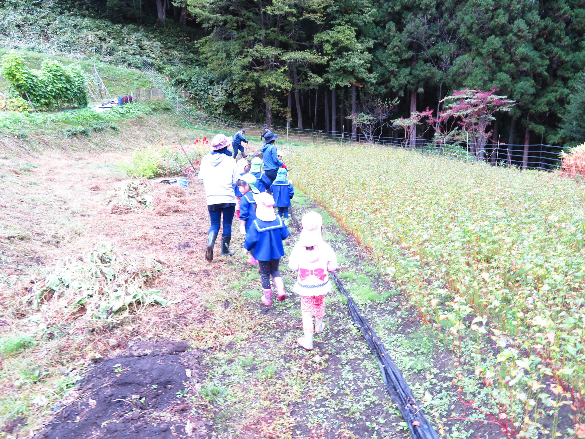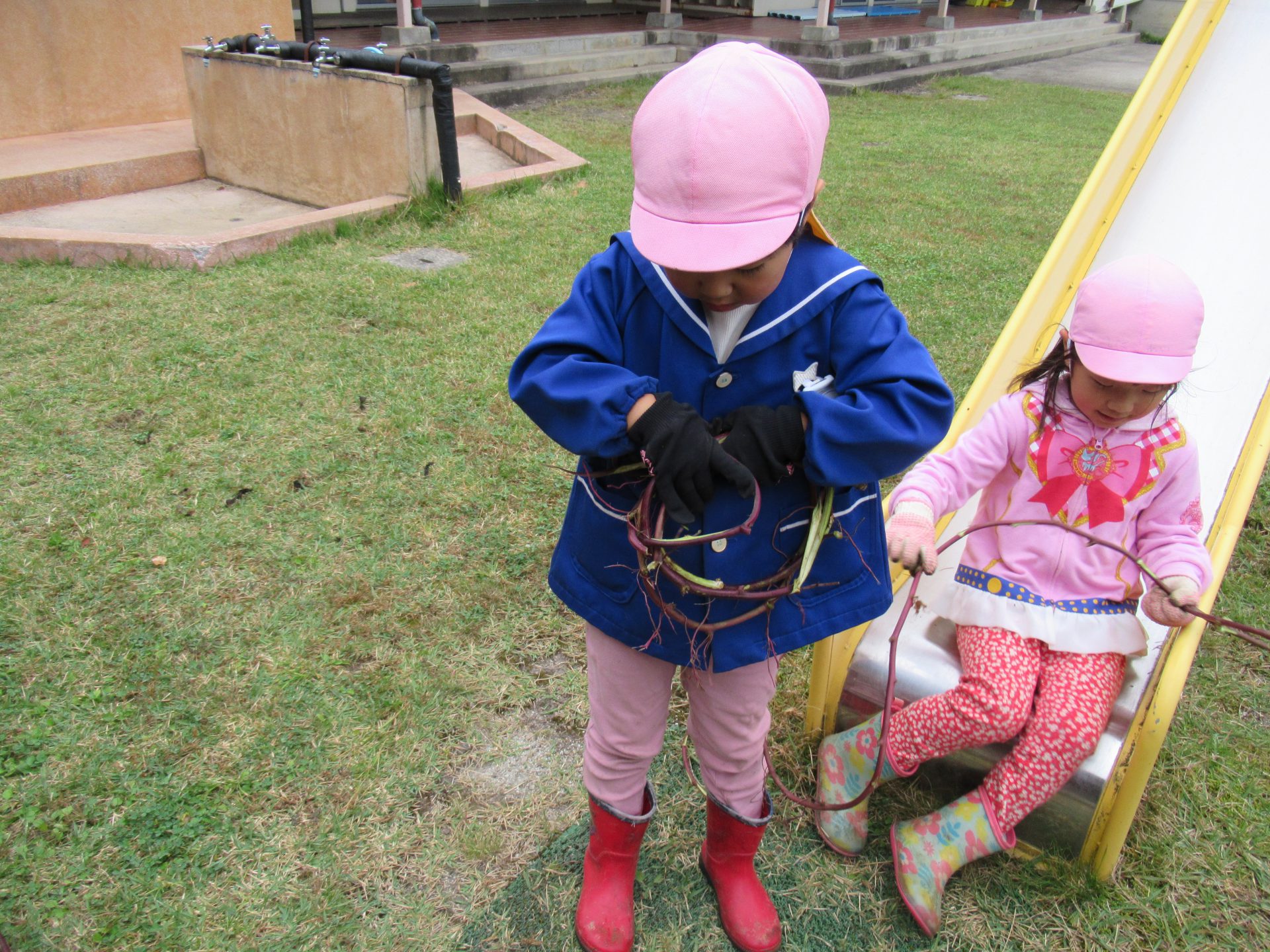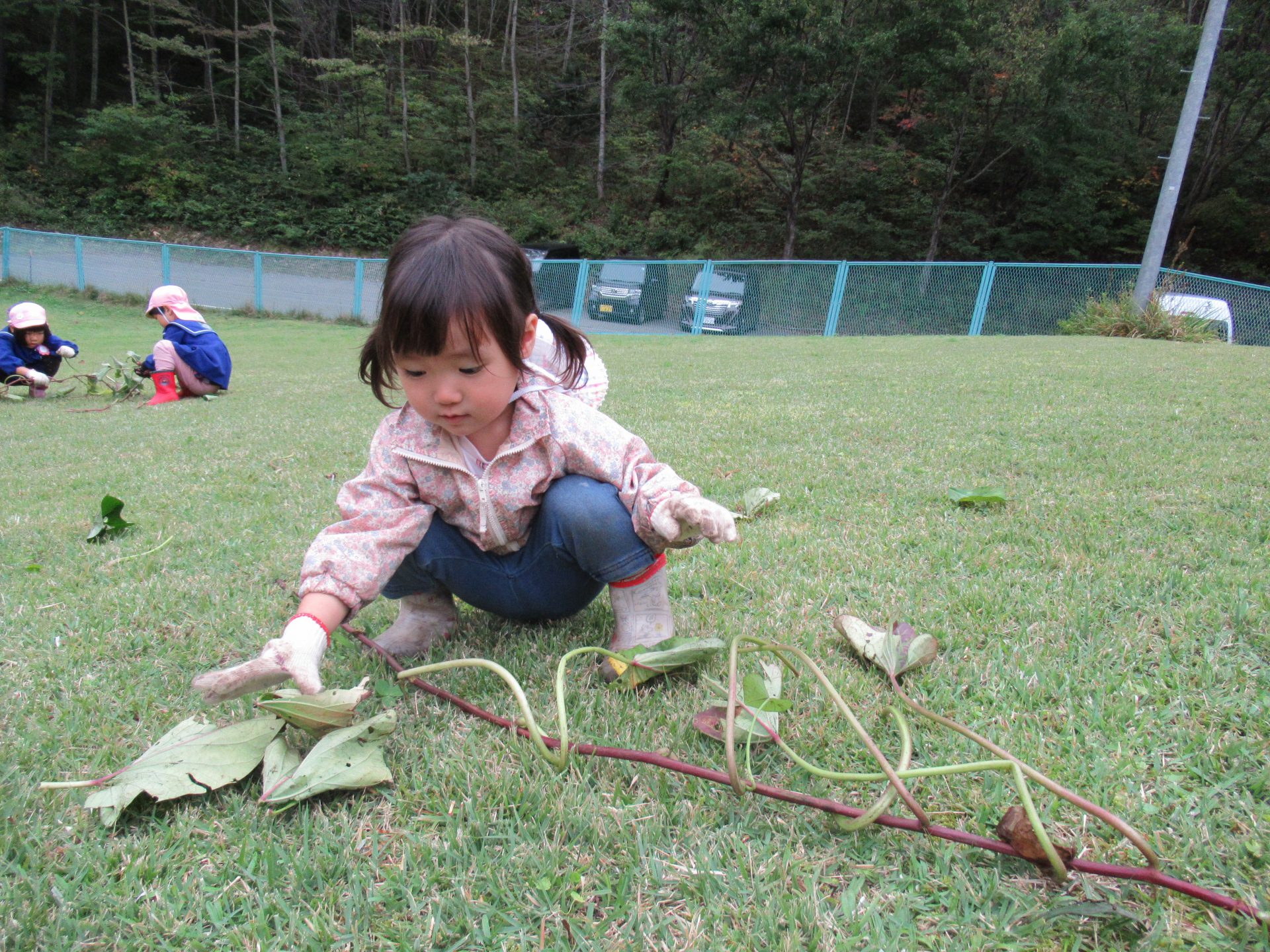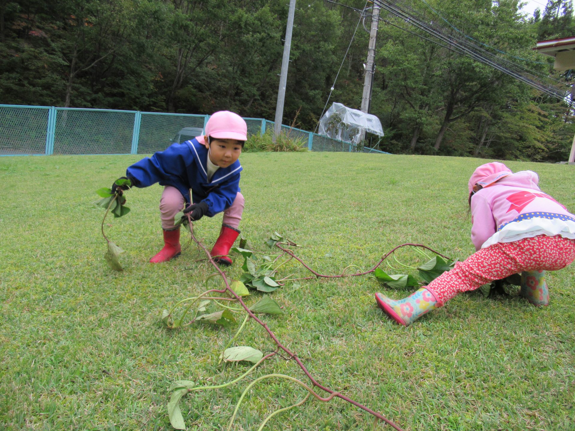 さつまいものつるは長くて、保育園の斜面に並べて取りました。
