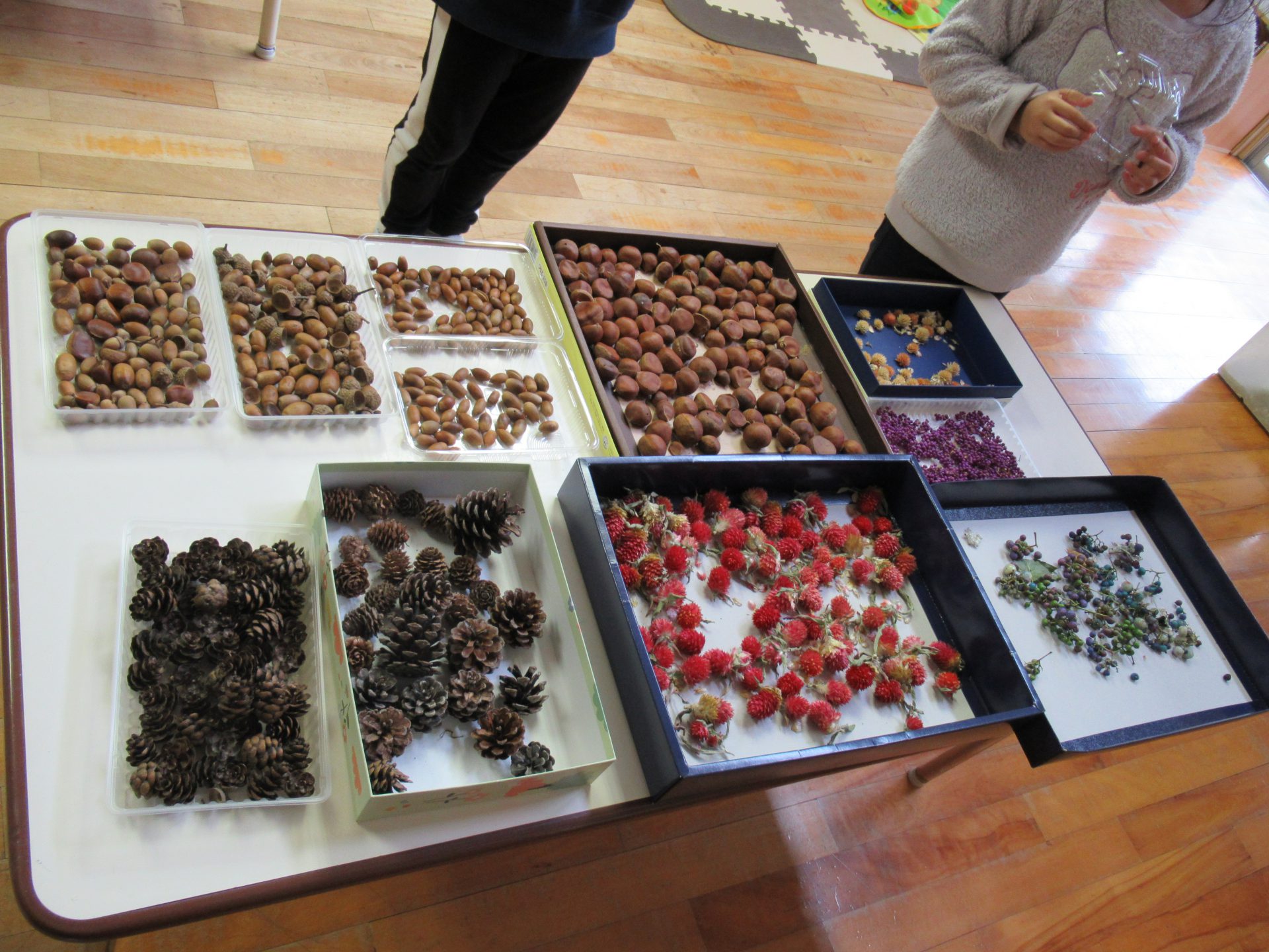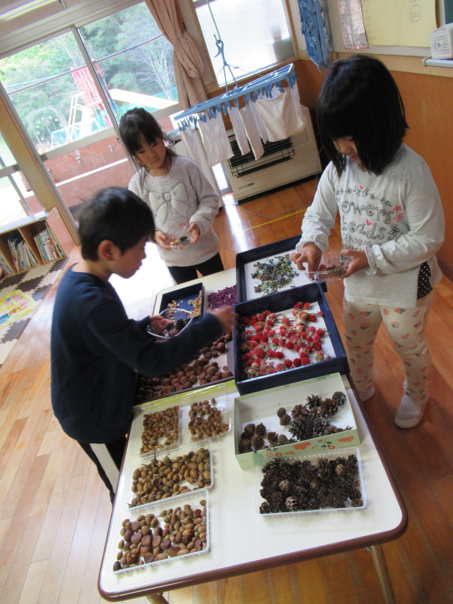 お散歩で集めた自然物を選びます。何を飾るか選ぶのも、楽しそうです。