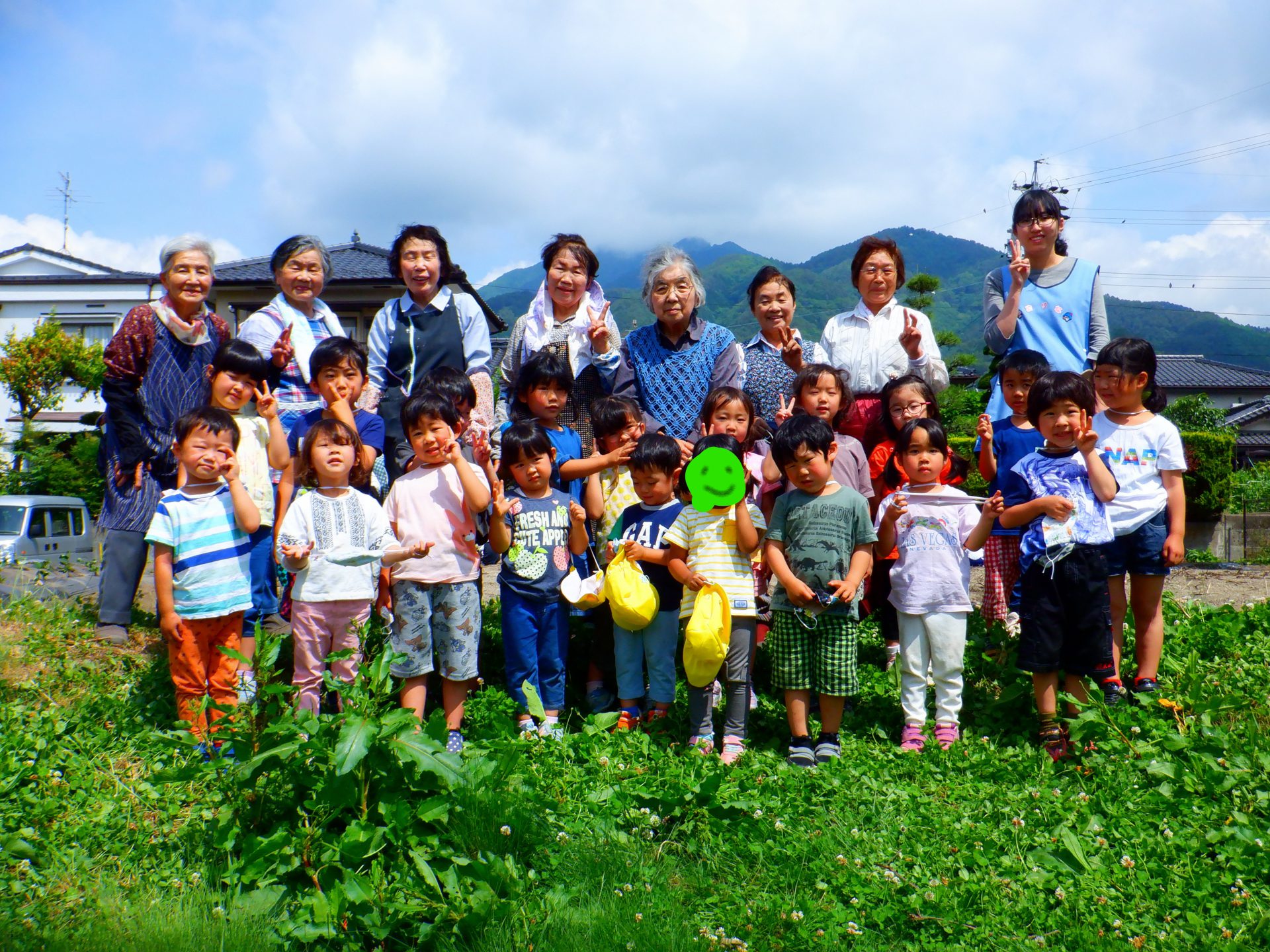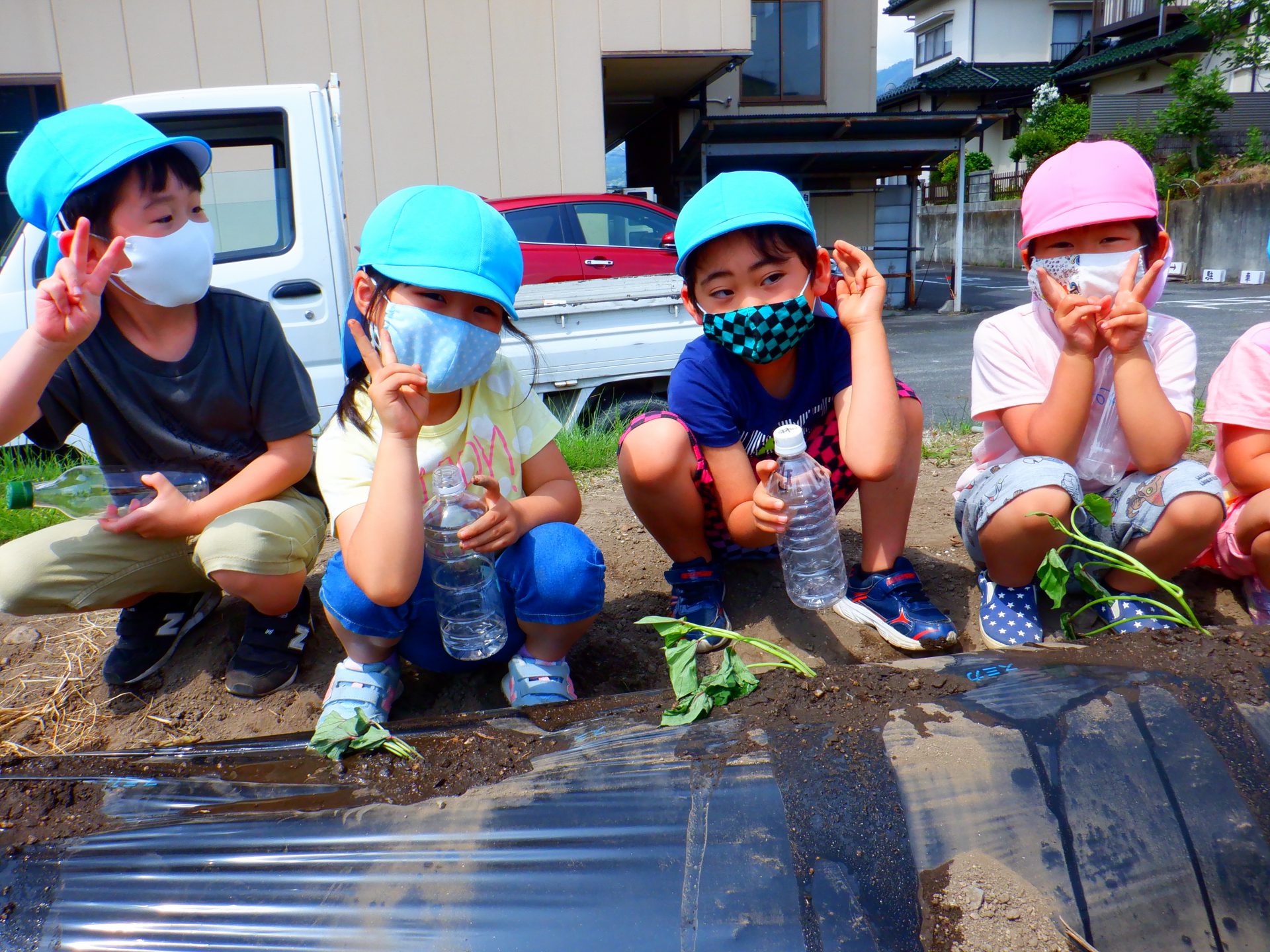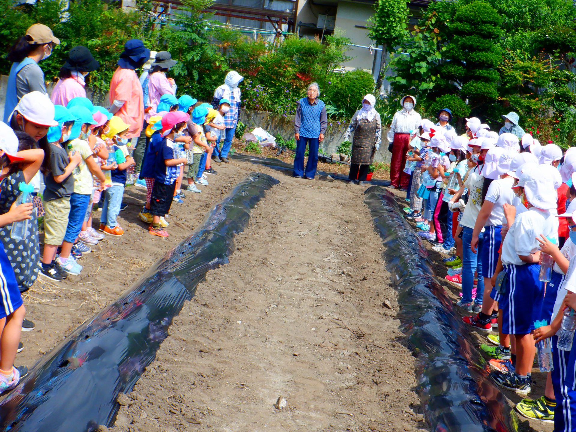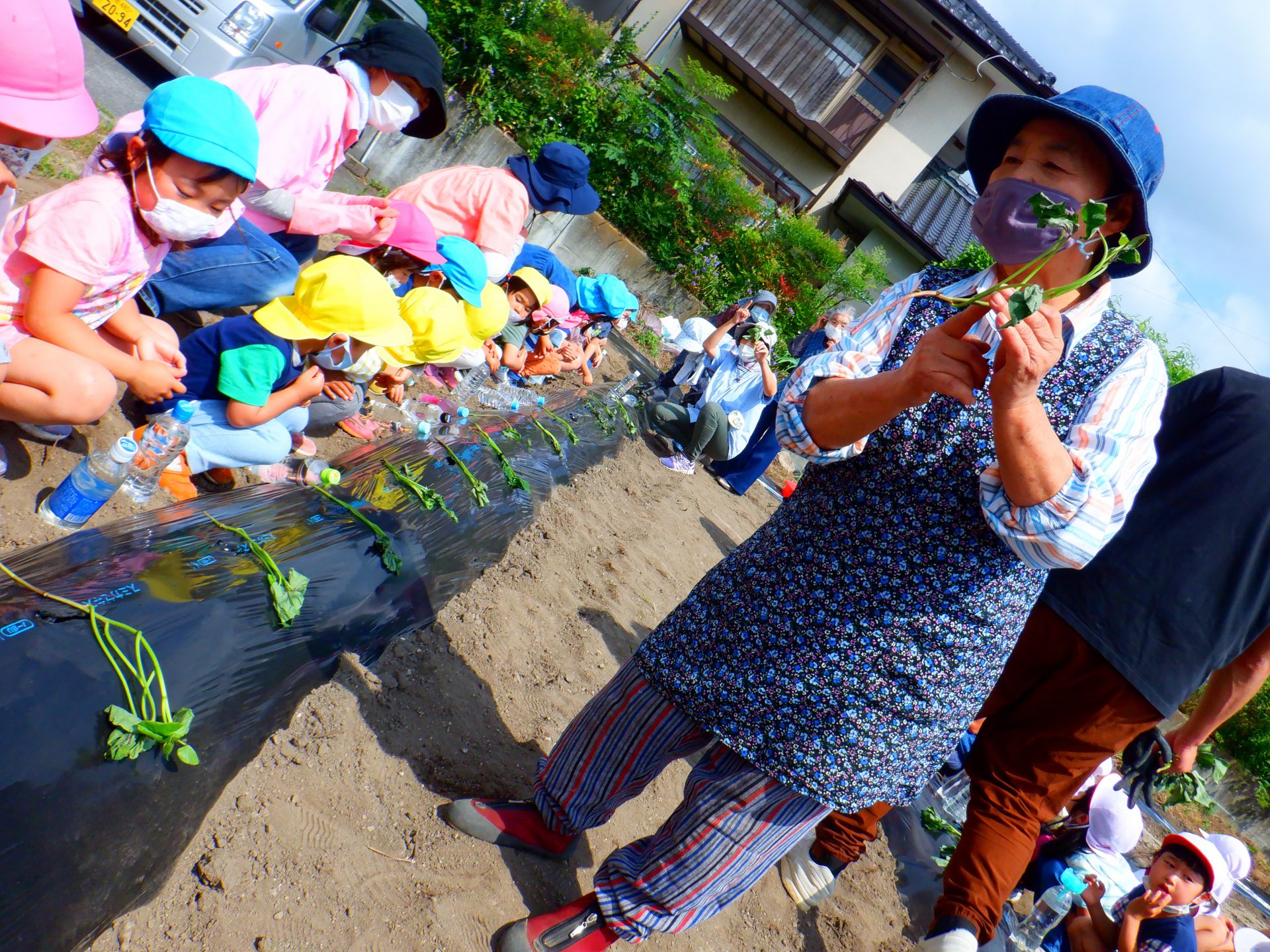 5月、今年も地域の農協婦人部「夕市の会」の皆さんと一緒にサツマイモの苗植えをしました。