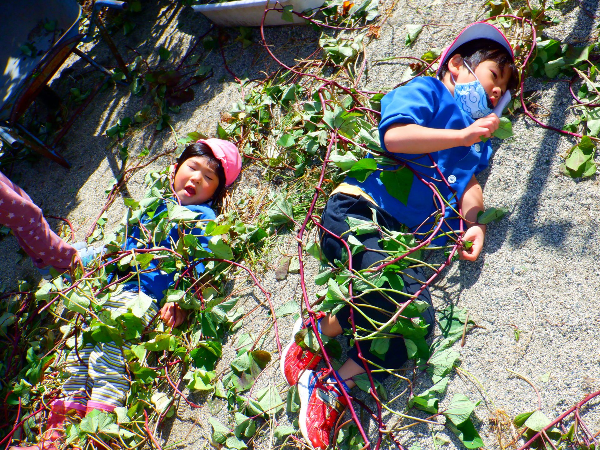 サツマイモを保育園へ持ち帰り、数を数えたり、大きさ比べや長さ比べをしてからもらってきた芋のツルを使って遊びました。