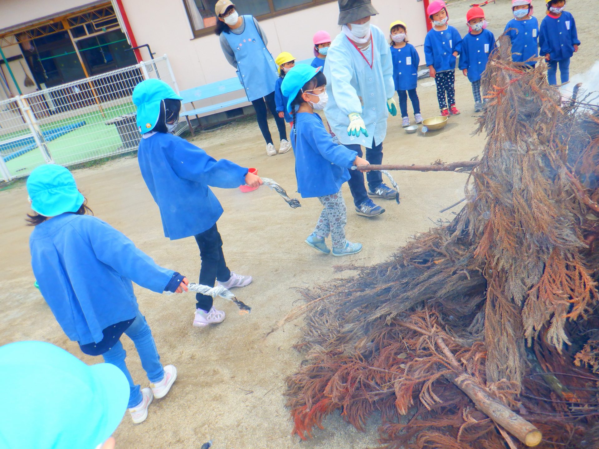 11月散歩で拾ってきた薪を園庭に積み上げ、「焼き芋大会」をしました。