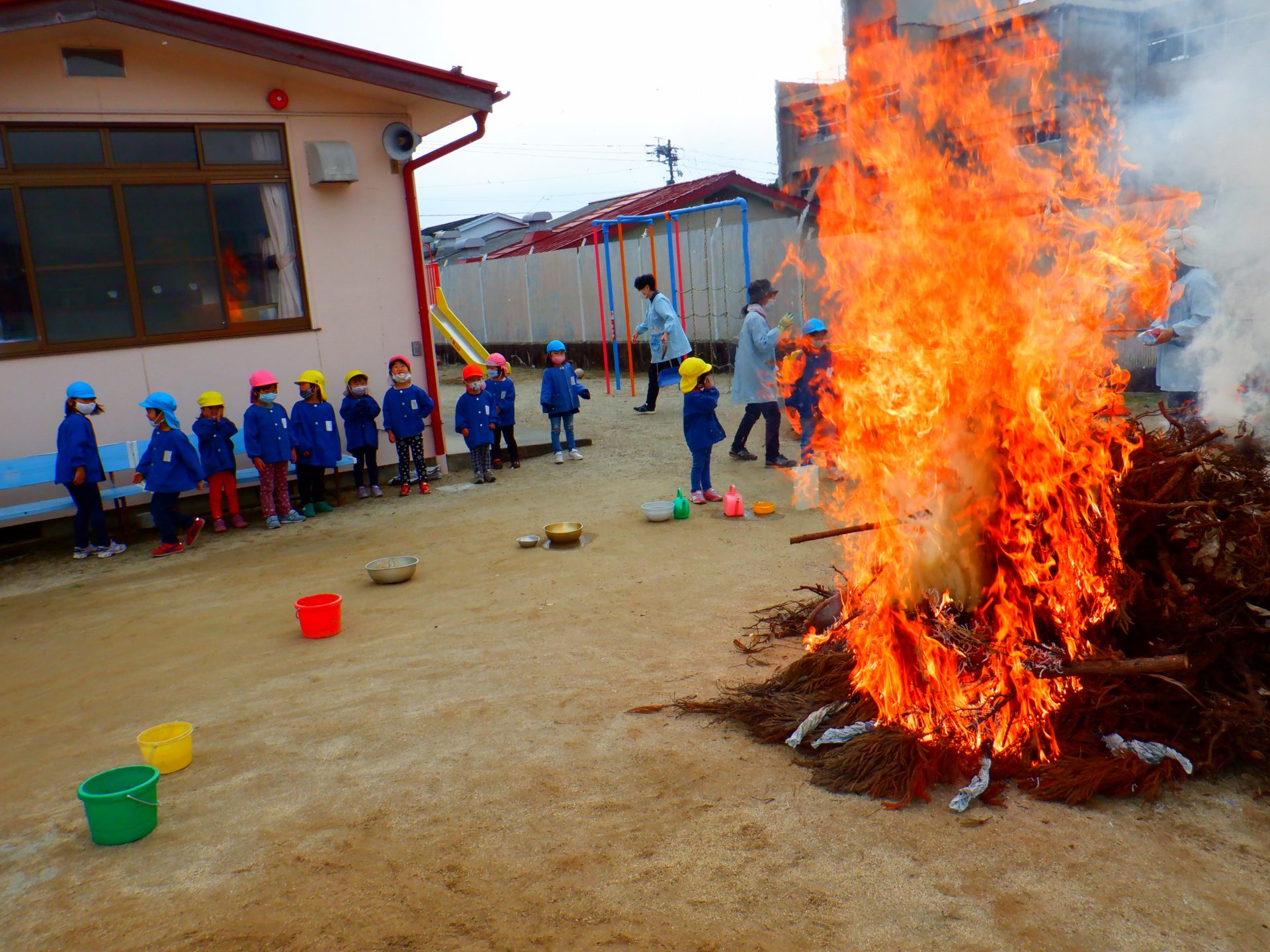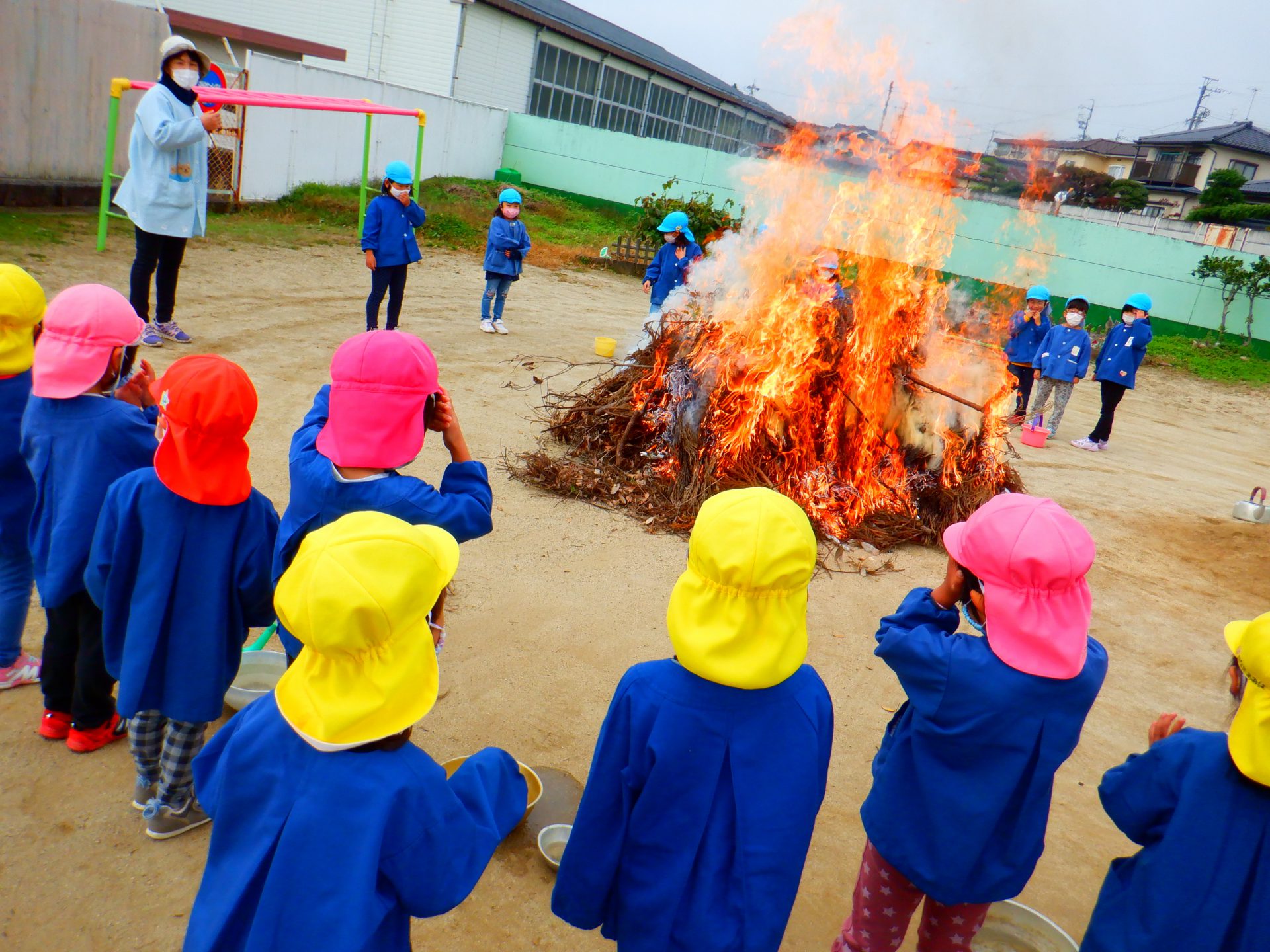 大きなたき火。大きな炎に年少さんはびっくりしていました。