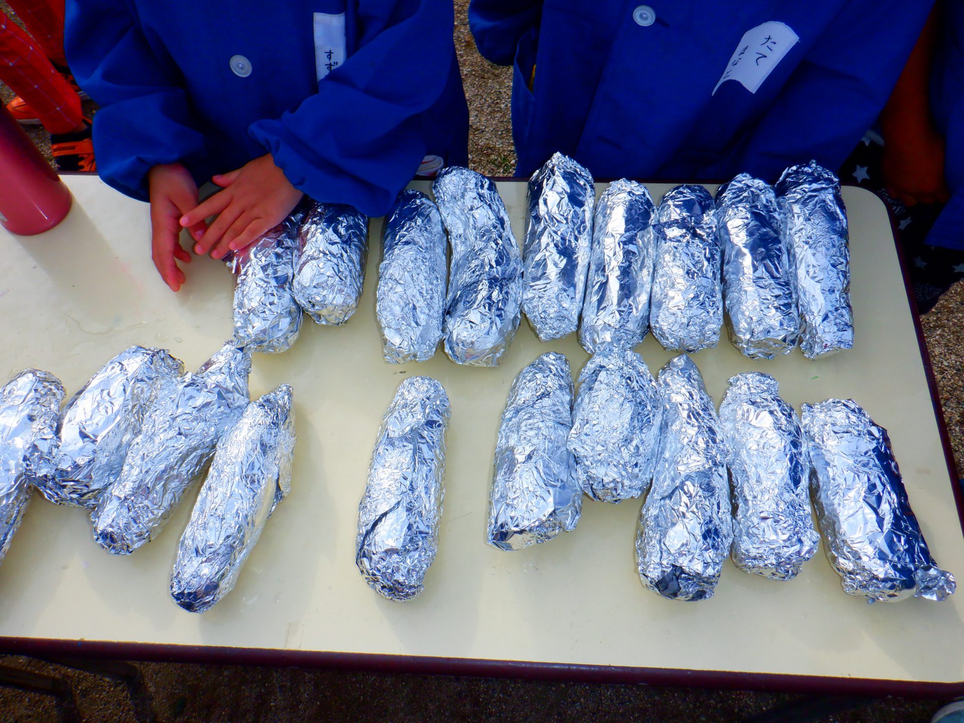 アルミホイルで包むと・・・焼き芋の準備が完成です。